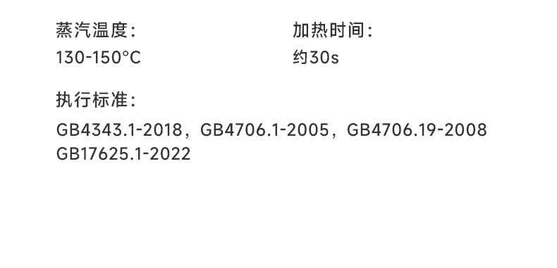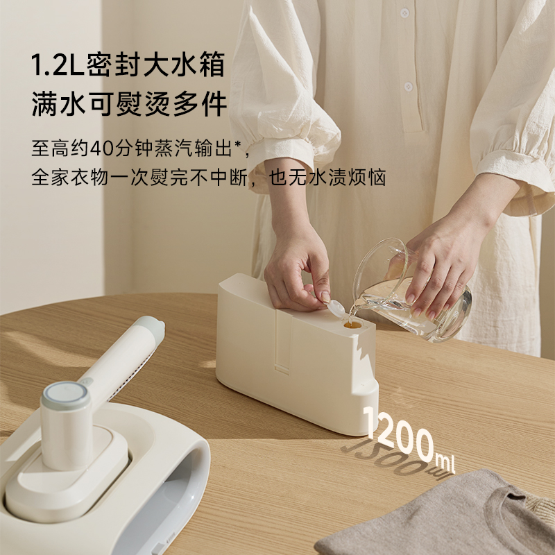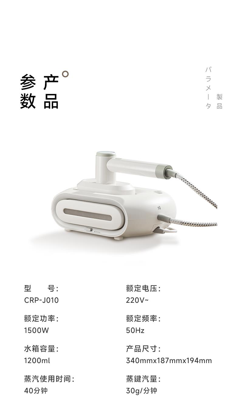 产品型号:CRP-J010 蒸汽量:30g/min 电源线长:1.8m 容量: 1200ml • 快速预热,30S即可使用,使用过程中可以加水 • 超大陶瓷釉面熨斗,省时省力 • 1.2L超大容量可移除水箱,持续使用时间长 • 90°课旋转熨斗,适合平烫和挂烫 • 带过滤器,延长机器使用寿命 • 3档可调,适合多种材质衣物 • 无操作后10mins自动关机 • 带自动清洁功能