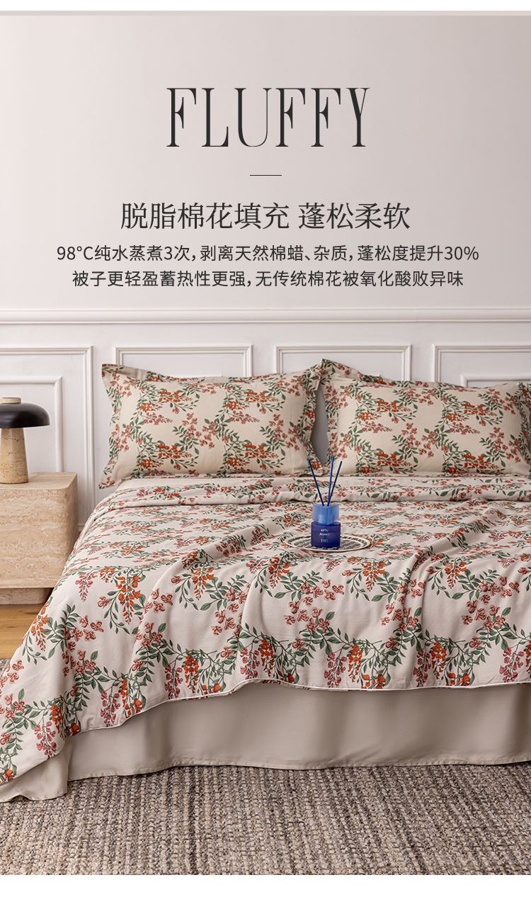 商品参数: 面料:100棉 填充:100棉(脱脂棉花) 填充克重: 320g 规格:150*200cm(200*230可订制)