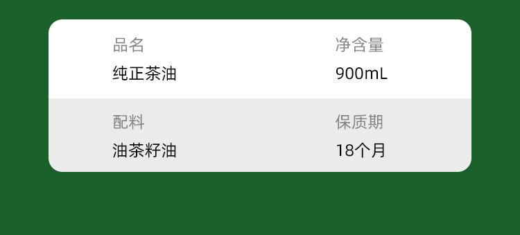 等级:一级 榨取工艺:冷榨 包装形式:瓶装 加工工艺:压榨 包装规格:1瓶 保质期:540天 包装清单:纯正茶油900ml*1瓶 纯正茶油,一级茶油,山茶油900ml,茶籽油植物油,食用油,0零反式脂肪酸