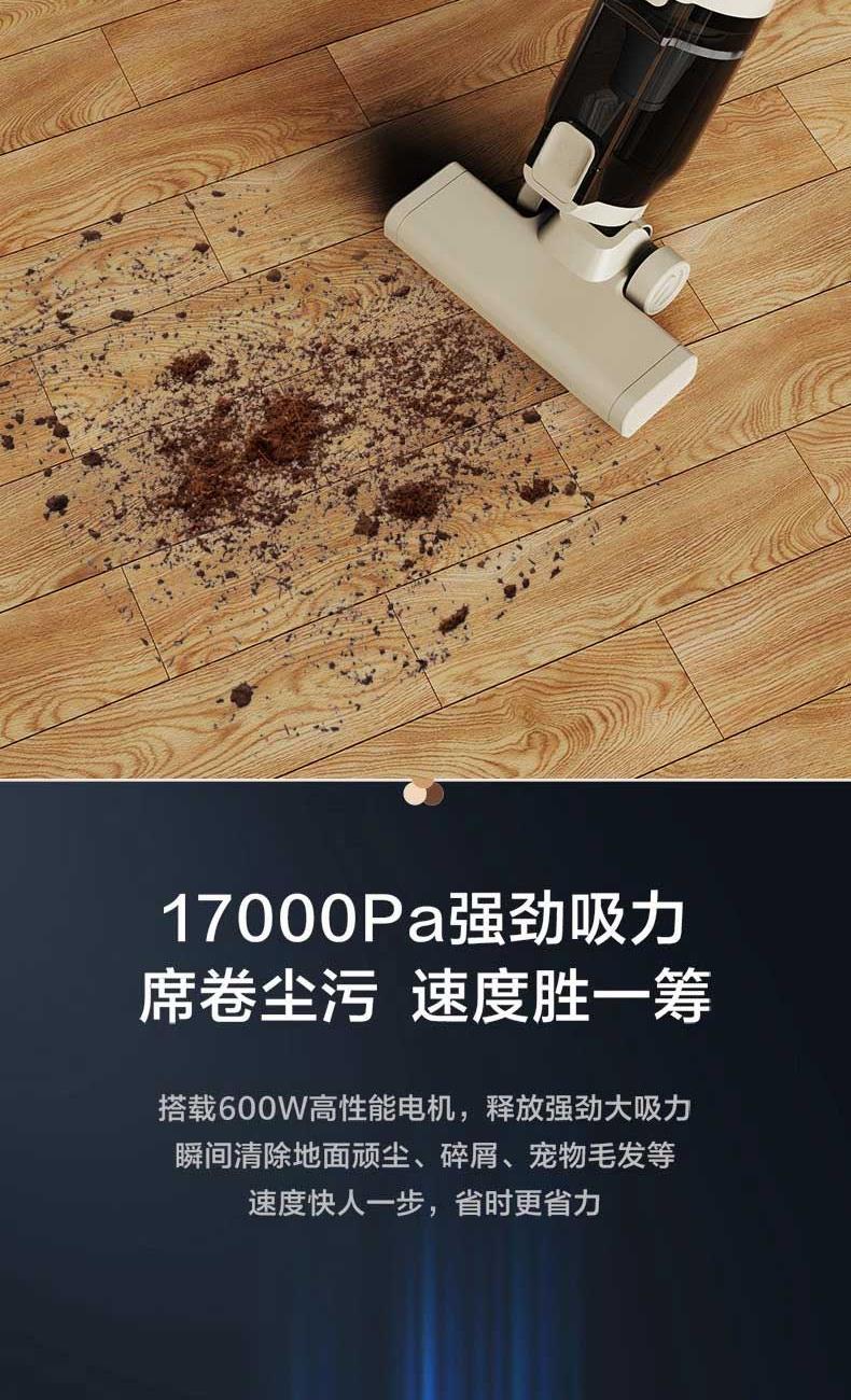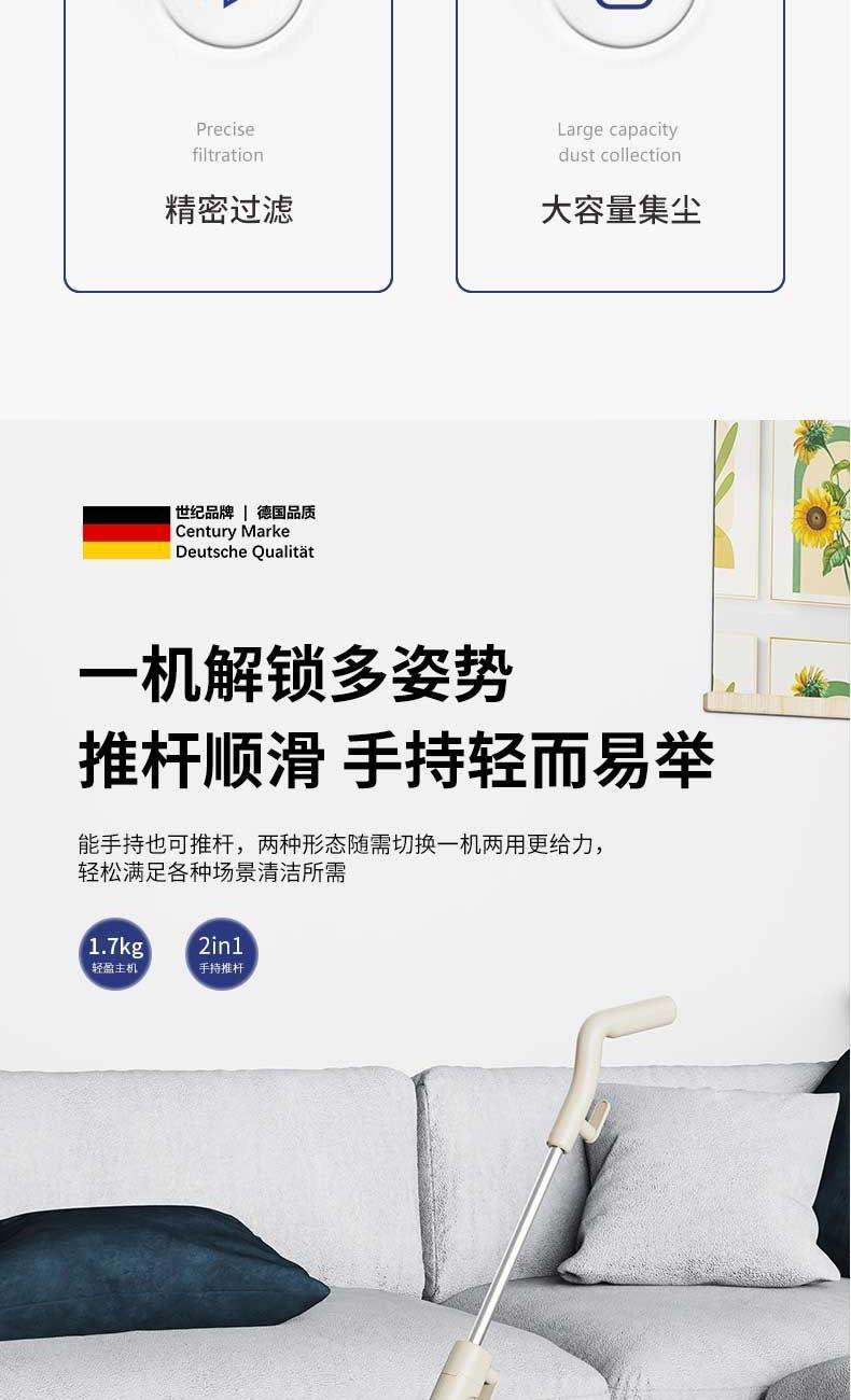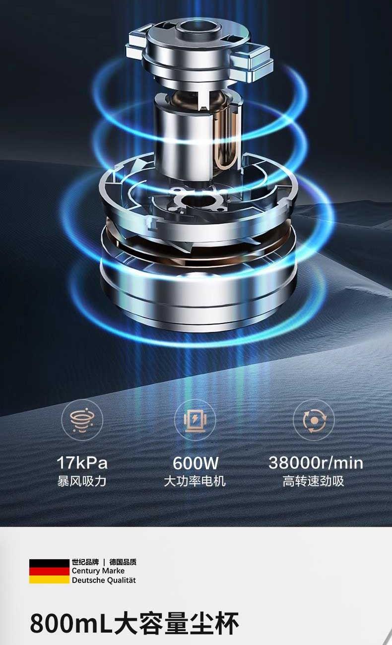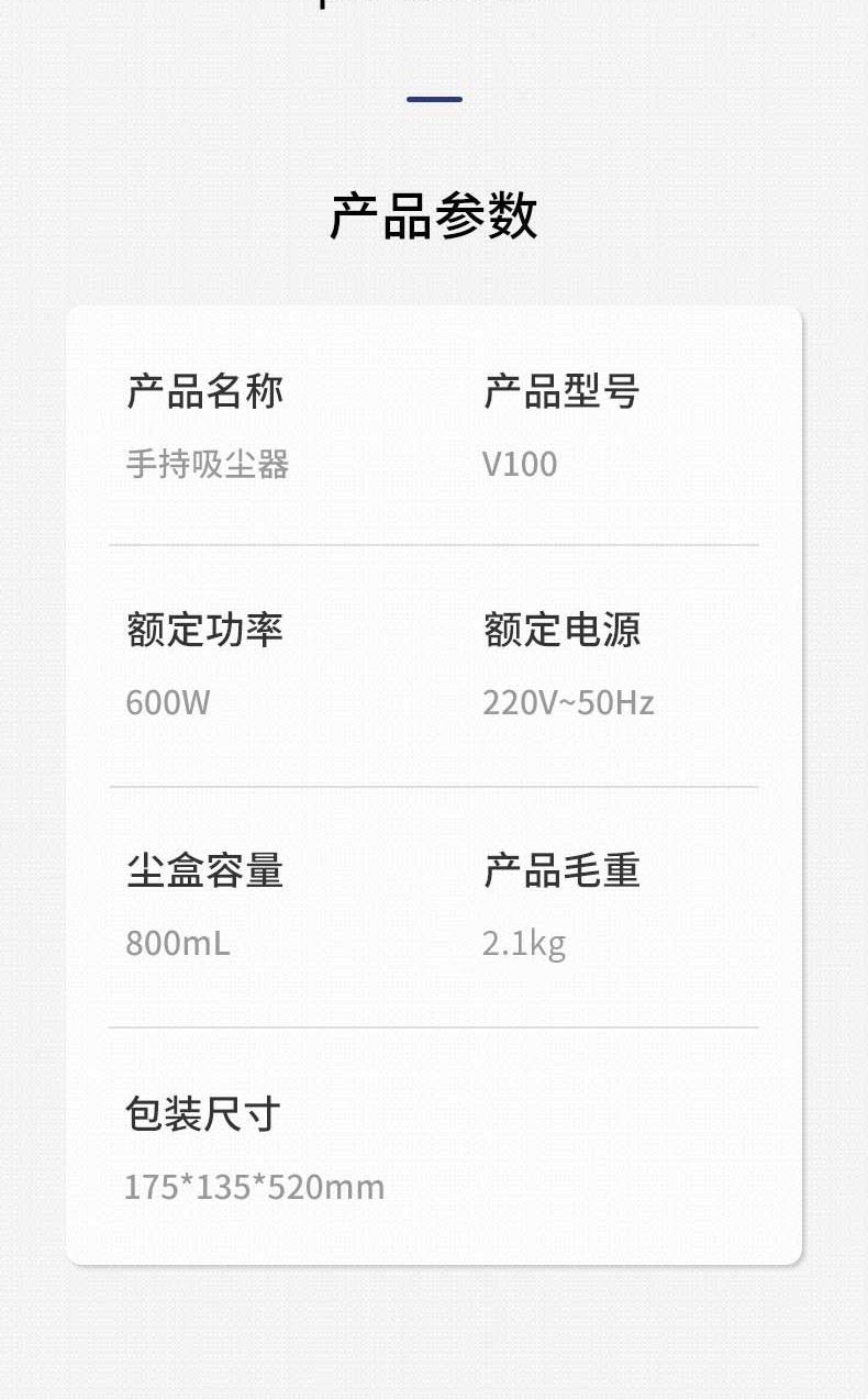 额定电压:220V~ 额定频率:50Hz 额定功率:600W 尘盒容量:0.8L 净重/毛重:1.7kg/2.1kg 彩盒尺寸: 175*135*520mm 外包装尺寸:190*160*535mm • 一机解锁多姿势,推杆顺滑,手持轻而易举; • 轻松探底,清洁无死角; •仿生关节设计,清洁一气呵成; • 17000Pa强劲吸力,速度更胜一筹; • 800ml大容量尘杯,易拆好清洗; • 符合人体工学设计,清扫更舒适; • 开关一键启停,操作简单
