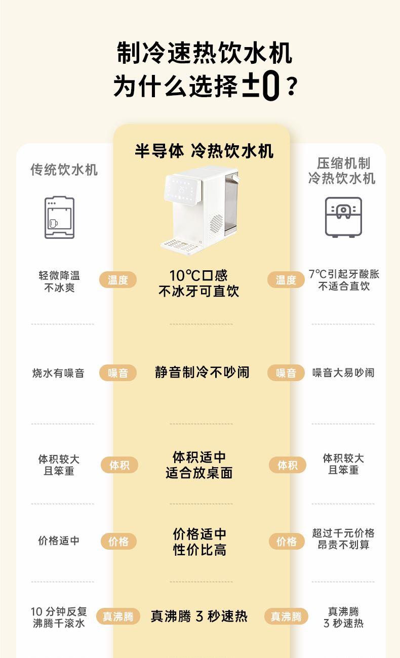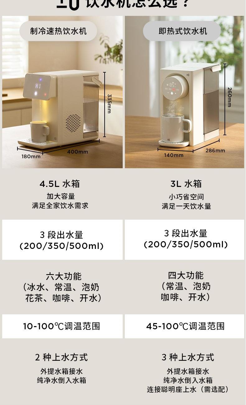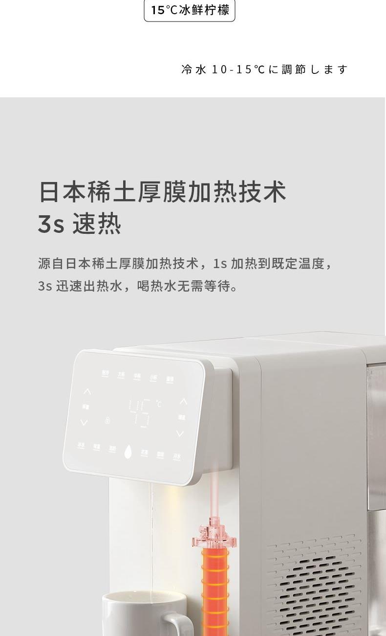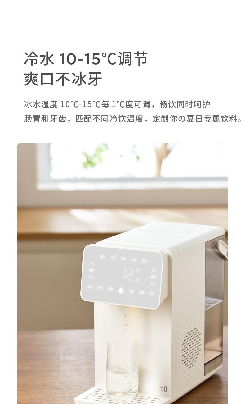 额定功率:2100W 额定电压/频率:220V~50Hz 环境温度:18℃-38℃ 制冷水能力:</等于15℃ 0.6L/h 水箱容量:4.5L 质保:1年 包装清单:机器*1、水箱*1、水箱盖*1、积水盘*1、说明书*1 制冷制热一体 10℃冰镇冷饮、驱散夏热,直饮不冰牙 稀土厚膜加热技术、即开即热 多段定温模式、±1℃可调节 定量取水、轻音制水 水路安全、食品级材质、 0异味,0双酚A 高出水口、直流不喷溅 防干烧、自动停止加热