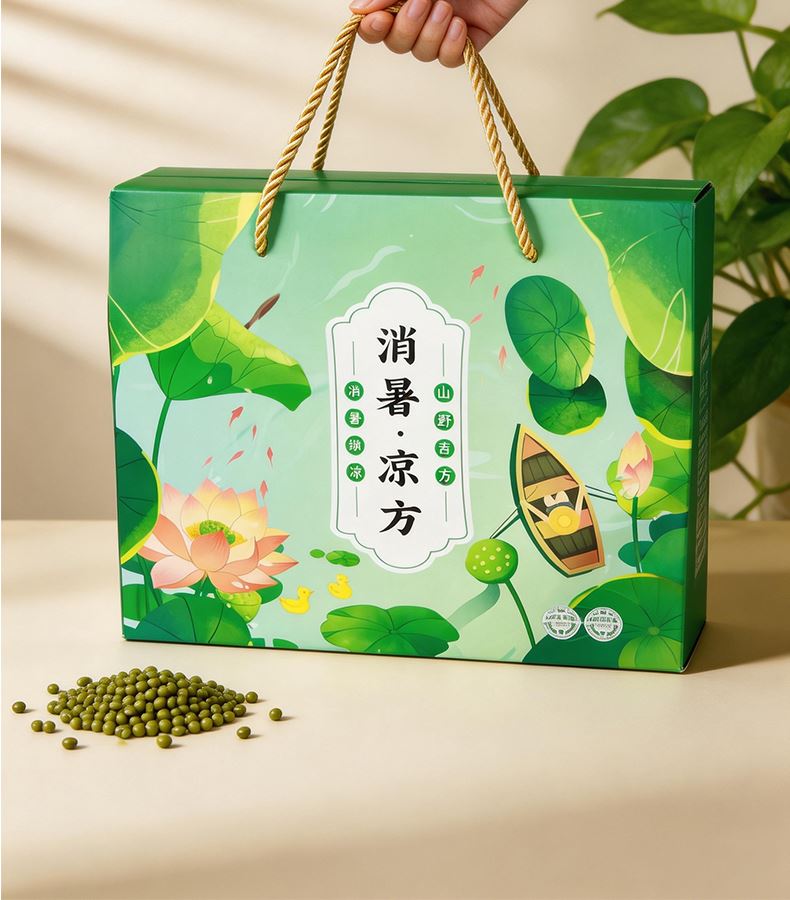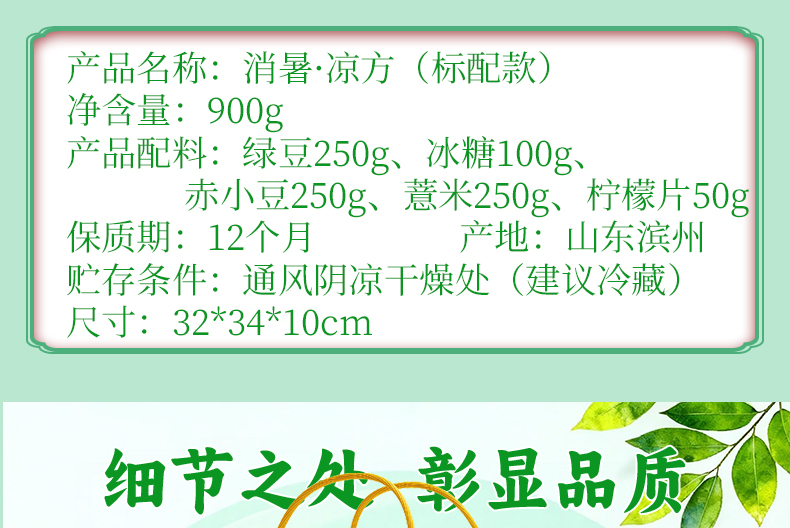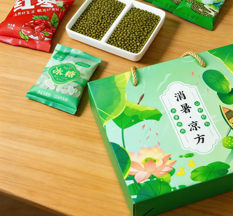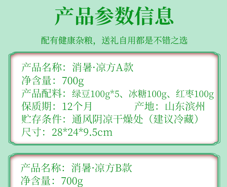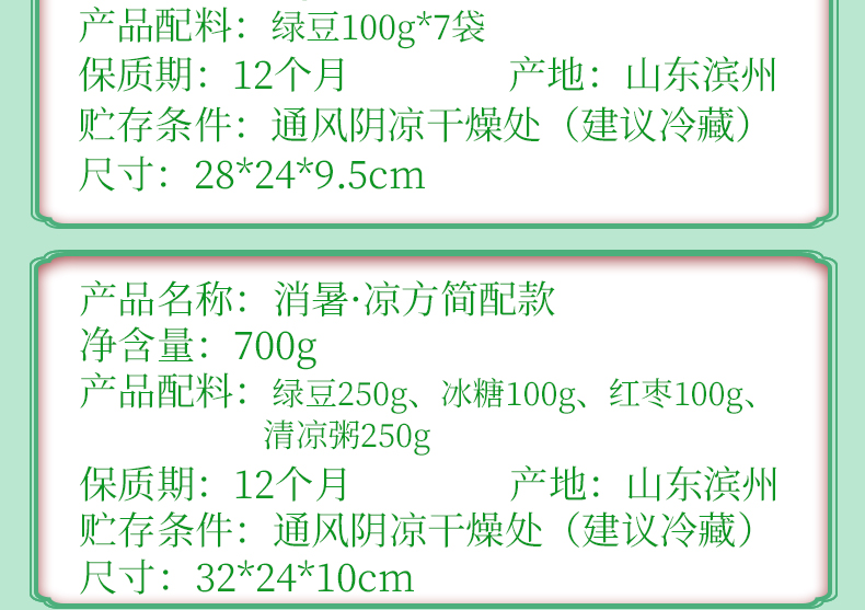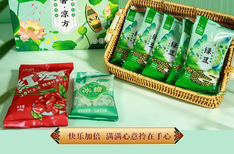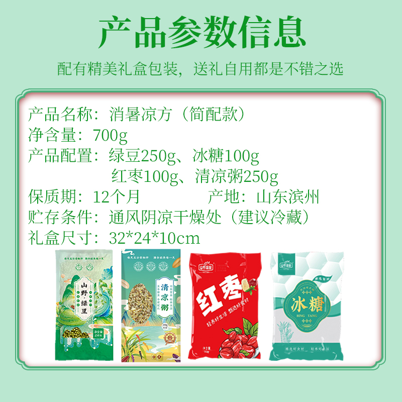 净含量:700g 消暑凉方简配款 产品规格配置:绿豆250g、冰糖100g红枣100g、清凉粥250g 盒尺寸:32*24*10cm 箱尺寸:63*34*50 箱重量:11.8kg 体箱积:0.107方