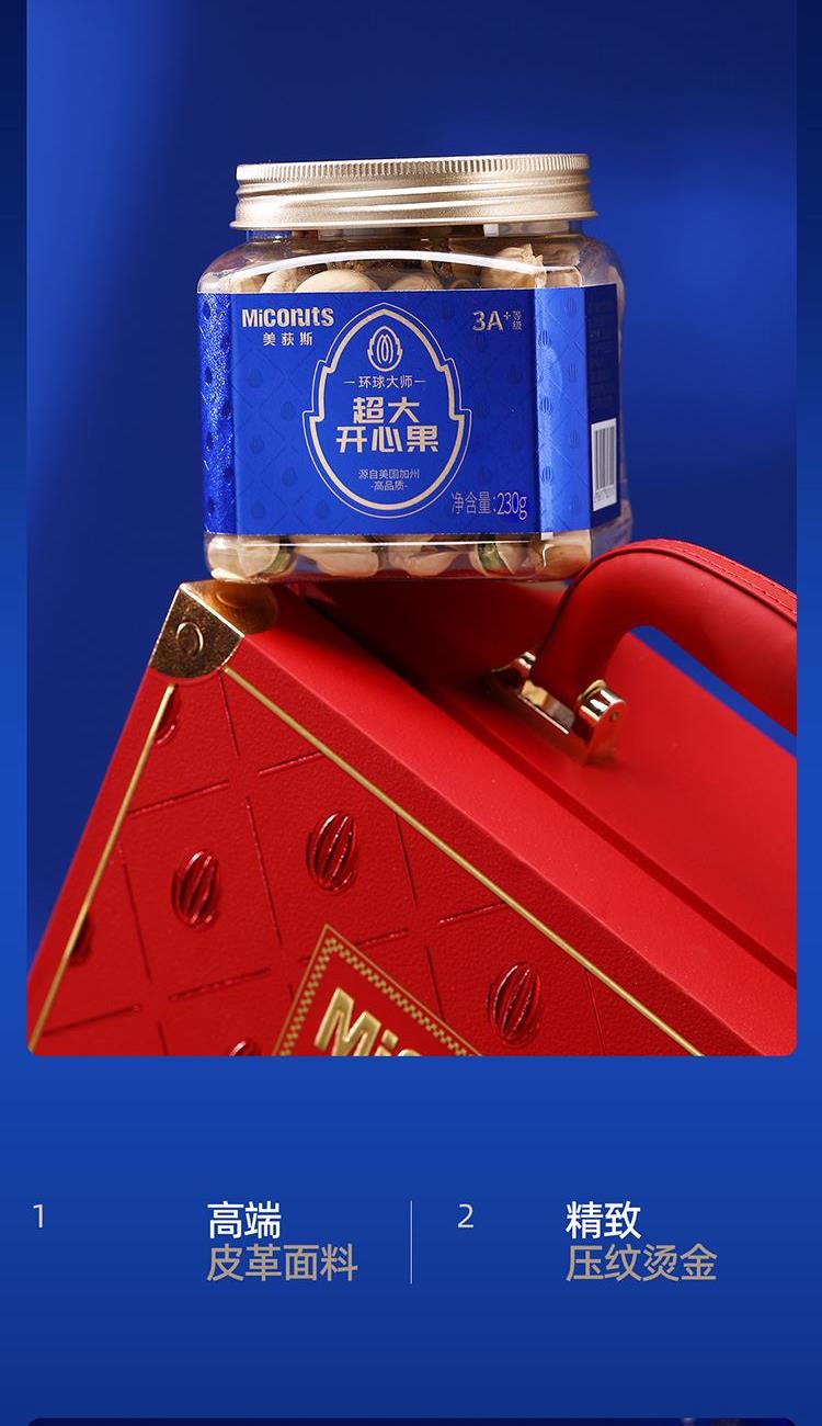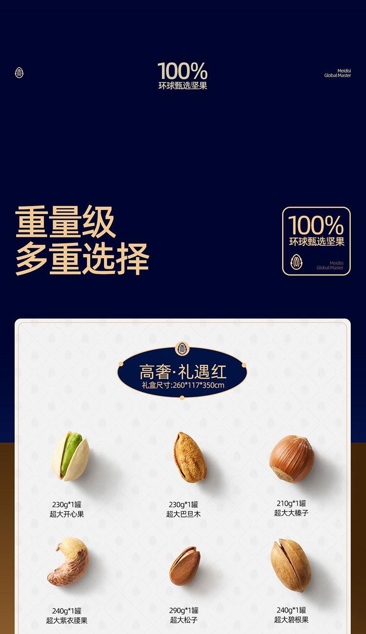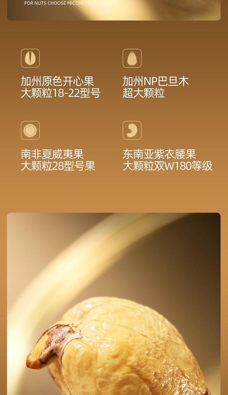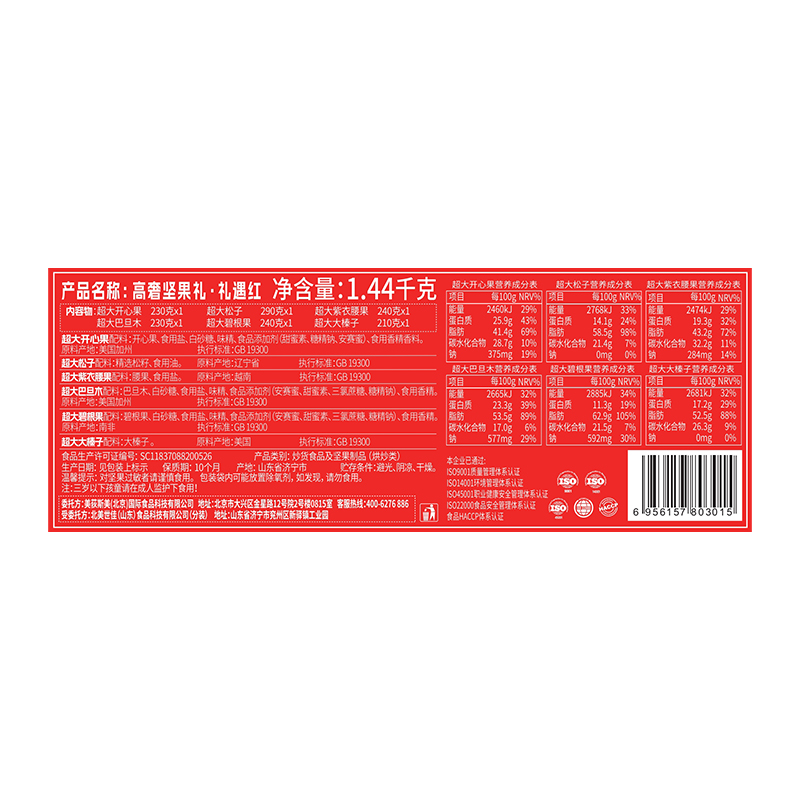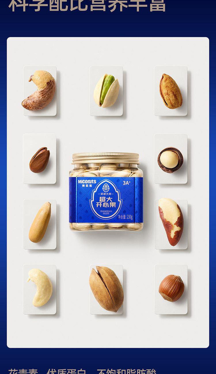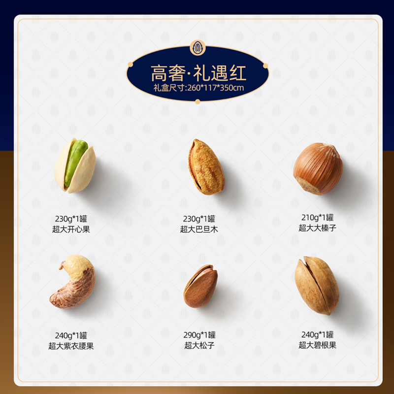 超大开心果 230g*1 超大松子 290g*1 超大紫衣腰果 240g*1 超大巴旦木 230g*1 超大碧根果 240g*1 超大大榛子 210g*1 合计:1440g