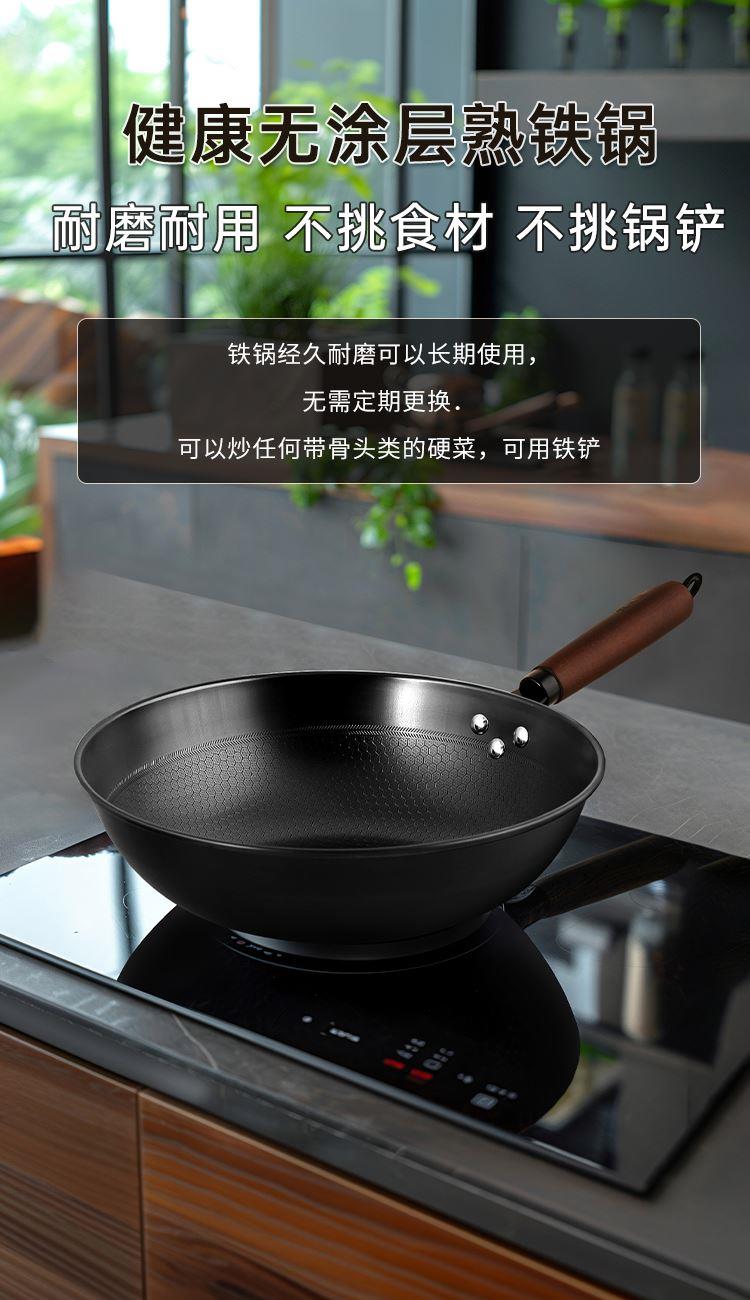 规格:32cm 材质:DC01 重量:1.05kg 适用于一般常见炉具 1、健康无涂层熟铁锅、升温快、蜂巢花纹可降低粘锅情况, 2、木质手柄、可拆木手柄、手感舒服,隔热防烫 3、锅边加厚、锅沿翻边加厚、锅身不易变型