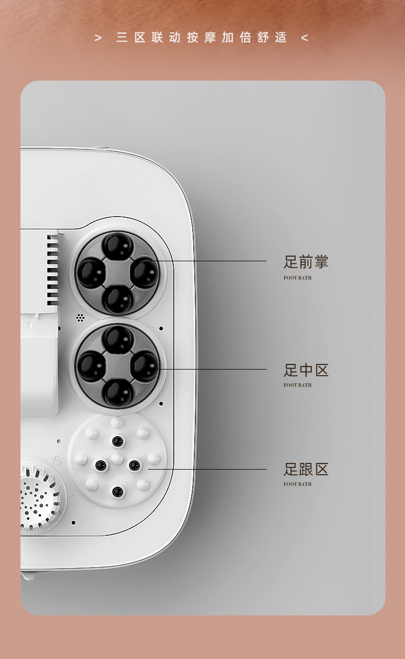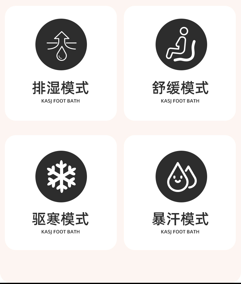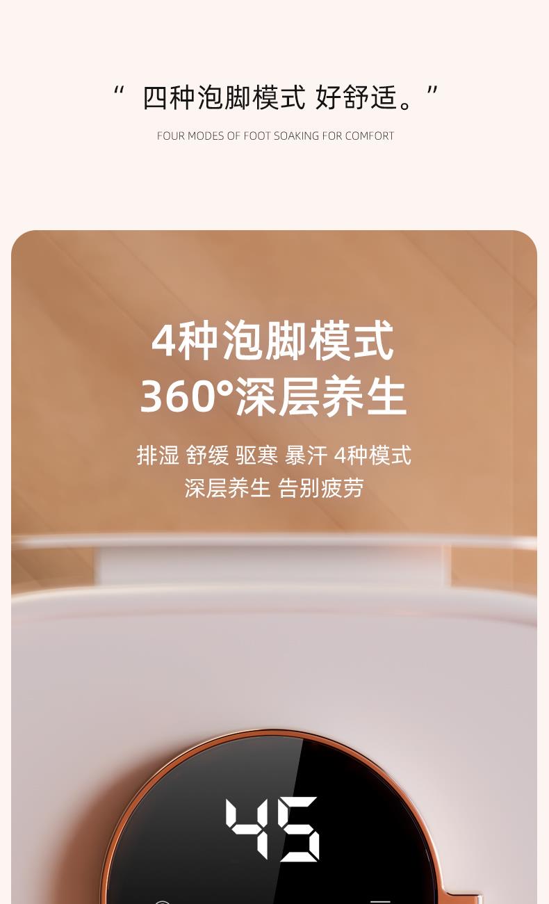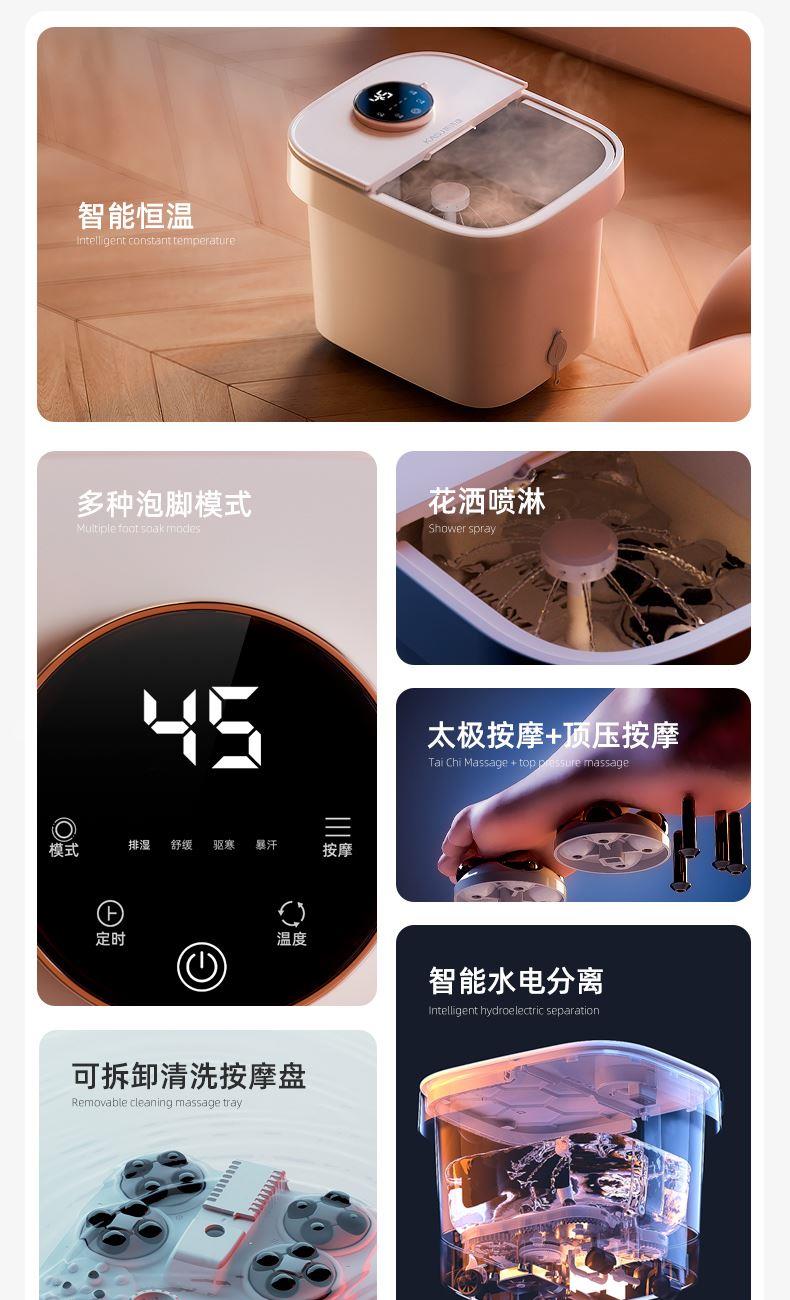 1.智能恒温,花洒喷淋 2.太极按摩+顶压按摩 3.可拆卸清洗按摩盘 4.排湿模式,舒缓模式 5.驱寒模式,暴汗模式