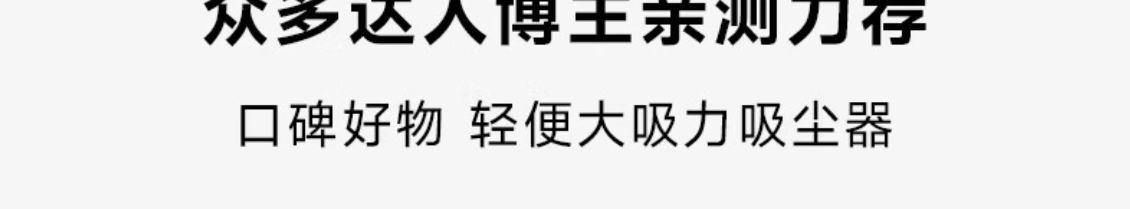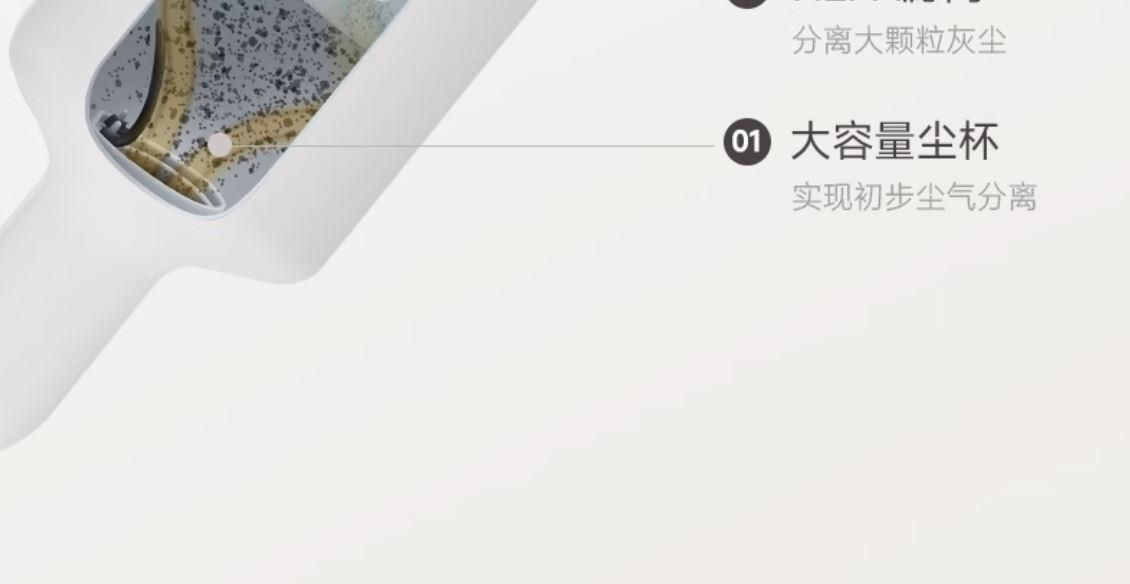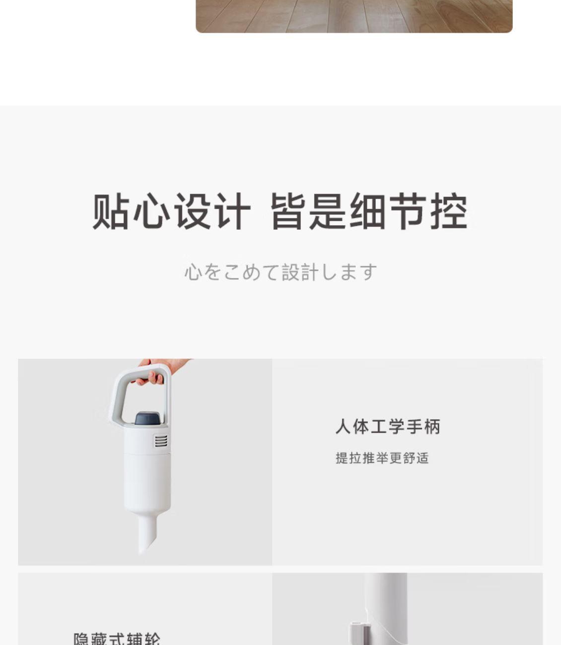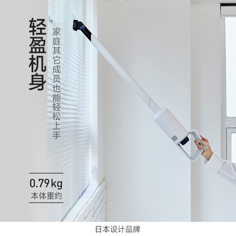 重量:手提组件 约0.8kg 安装了吸头+地板吸头:约1.2kg 电池:锂电子电池 充电时长:约2.5小时 使用时长:标准57分钟,强力16分钟,超强11分钟 集尘盒容量:约0.45L 790g轻量化设计、单手操作也无负担 持久续航,标准模式下连续清洁57分钟 清洁简单,旋转打开即可轻松清洗滤网及集尘盒 6钟清洁方式,满足全屋清洁 日本电产研发的高能锂电池,衰减慢、寿命长、充满电仅需2.5小时