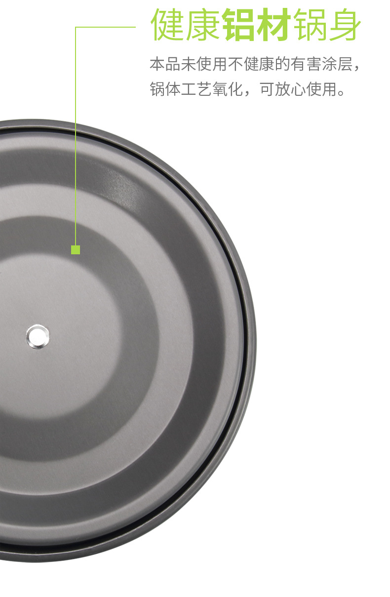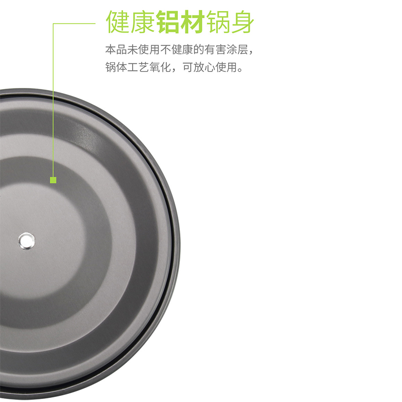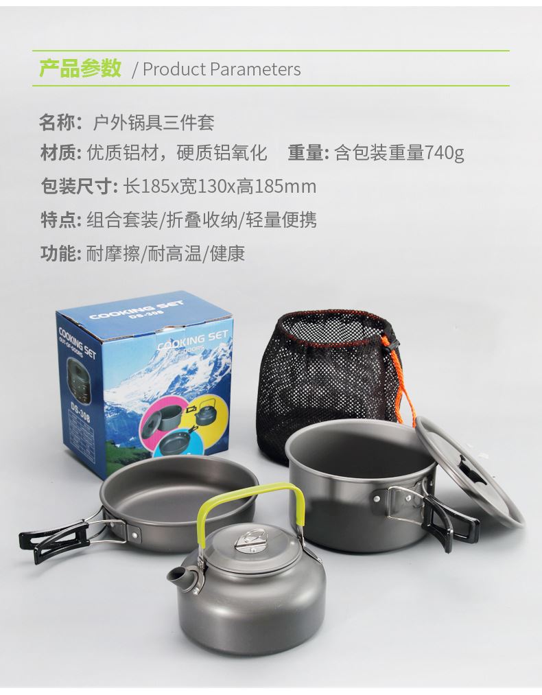 材质:氧化铝 型号:三件套(平底锅+大锅+水壶) 重量:0.7kg 包装:彩盒 1、健康铝材、放心使用; 2、轻便不粘锅,清洗方便; 3、受热均匀,抗腐蚀; 4、稳固把守,操作简单,不易打滑; 5、精美网袋礼盒包装;