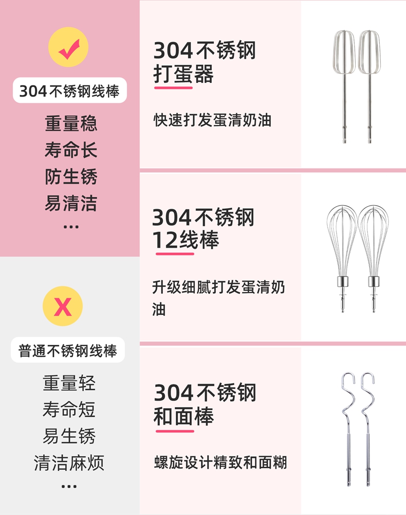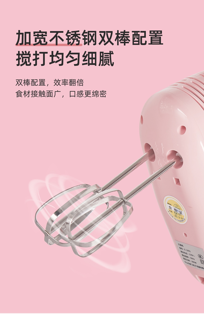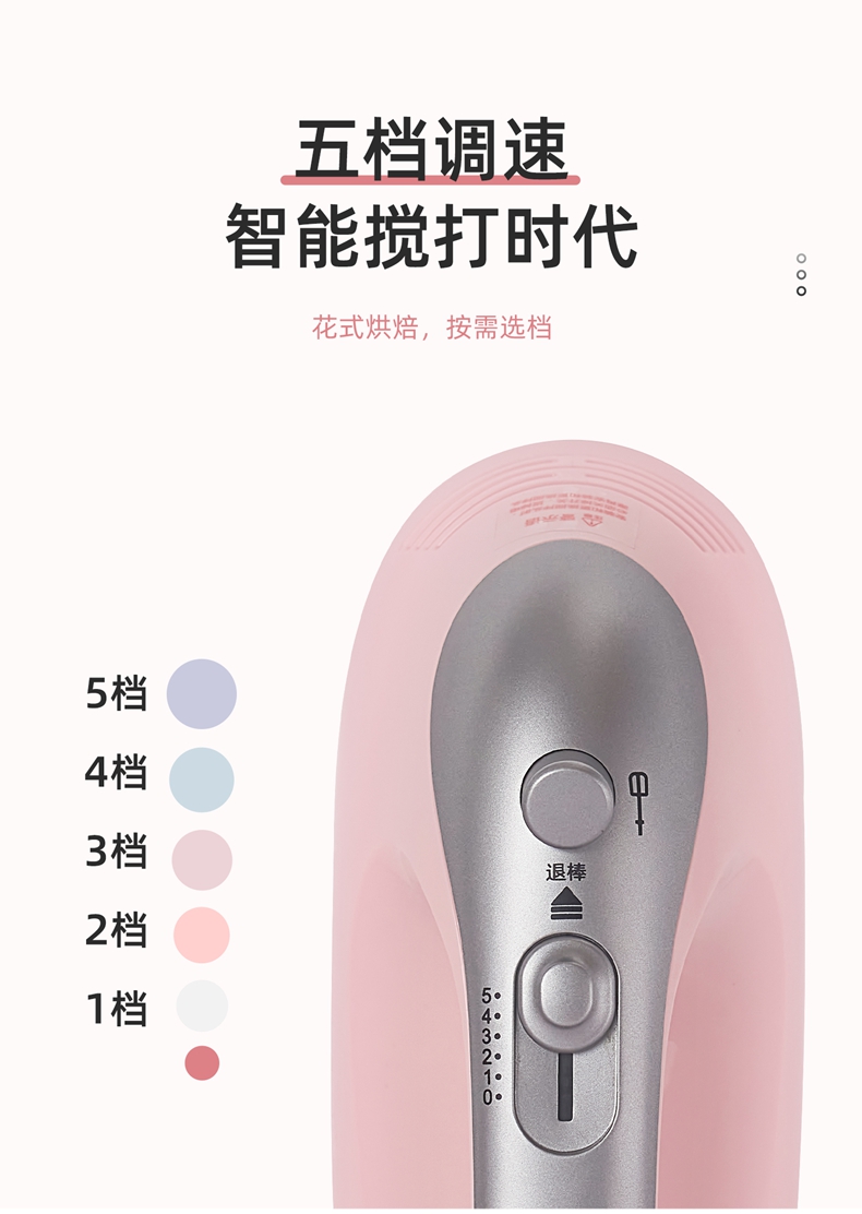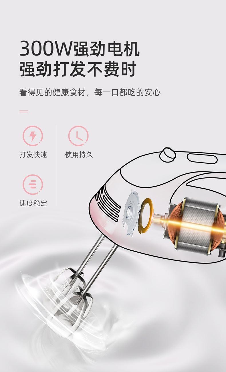 300w大功率电机,打发更快更细腻,搅打强劲高效,304搅拌棒; 5档自由调速,满足不同打发需求 ; 一键快速退棒,操作方便 不脏手; 不同食材需求 高效打发搅拌;