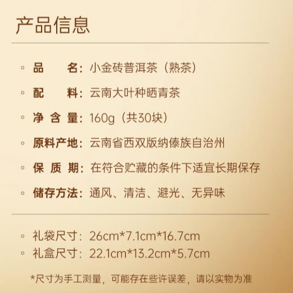 华祥苑全国线下4300+实体门店 #茶行业门店数量4300家全国第yi #京东自营/官方直供/项目团购 爆款金砖 陈韵糯香 更高性价比 自饮装更尽兴 闭眼入,销量与口碑齐优的“老朋友”,双层自饮装小金砖,大份量30砖,一天一砖,日常品饮更畅快。 小金砖普洱茶(熟茶) 【净含量】160g(30块) 礼袋尺寸:26cm*7.1cm*16.7cm 礼盒尺寸:22.1cm*13.2cm*5.7cm 【品质特征】原叶切割 条索清晰 方正如砖 金芽显露 汤色红浓透亮,陈香更浓郁 口糯滑饱满,如米汤般细腻醇和 叶底鲜活 褐红油润 叶底呈褐红色,内质丰富,糯香久留,韵足耐泡,芽叶仍均齐柔软。 - 精致礼盒包装,送礼体面彰显尊贵。小可社交,大可外交,适用多种社交场景;一盒满足礼赠贵宾、商务会面、重要答谢等需求。