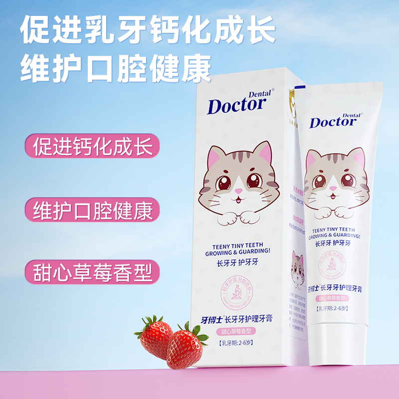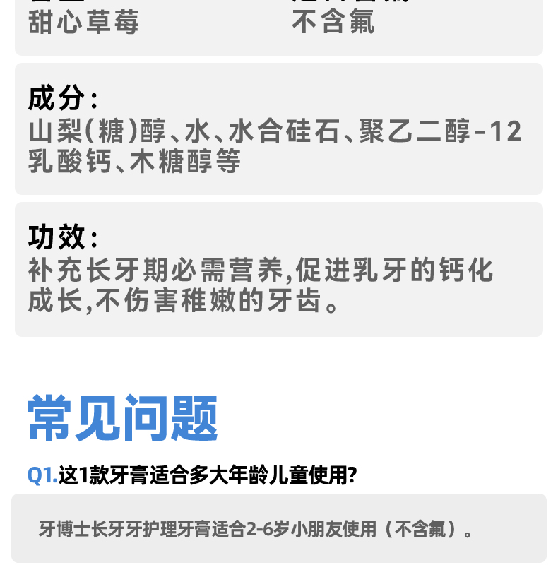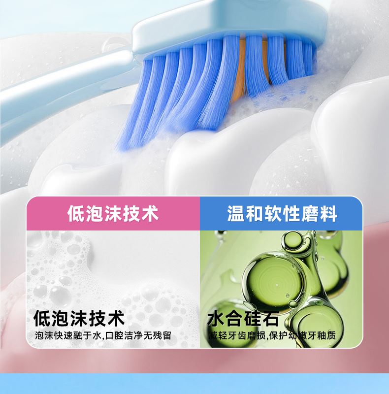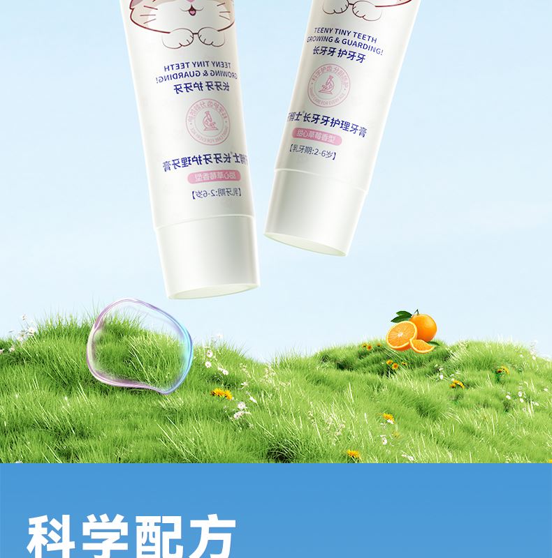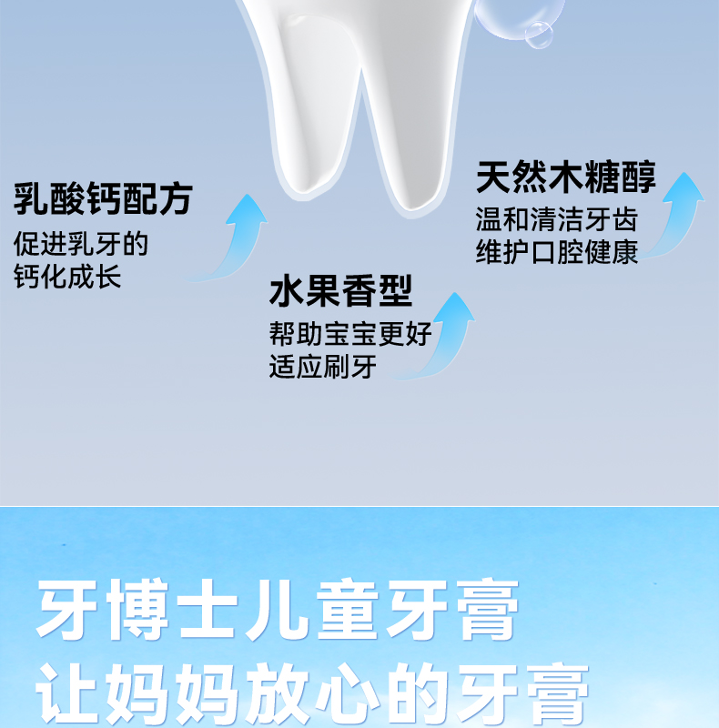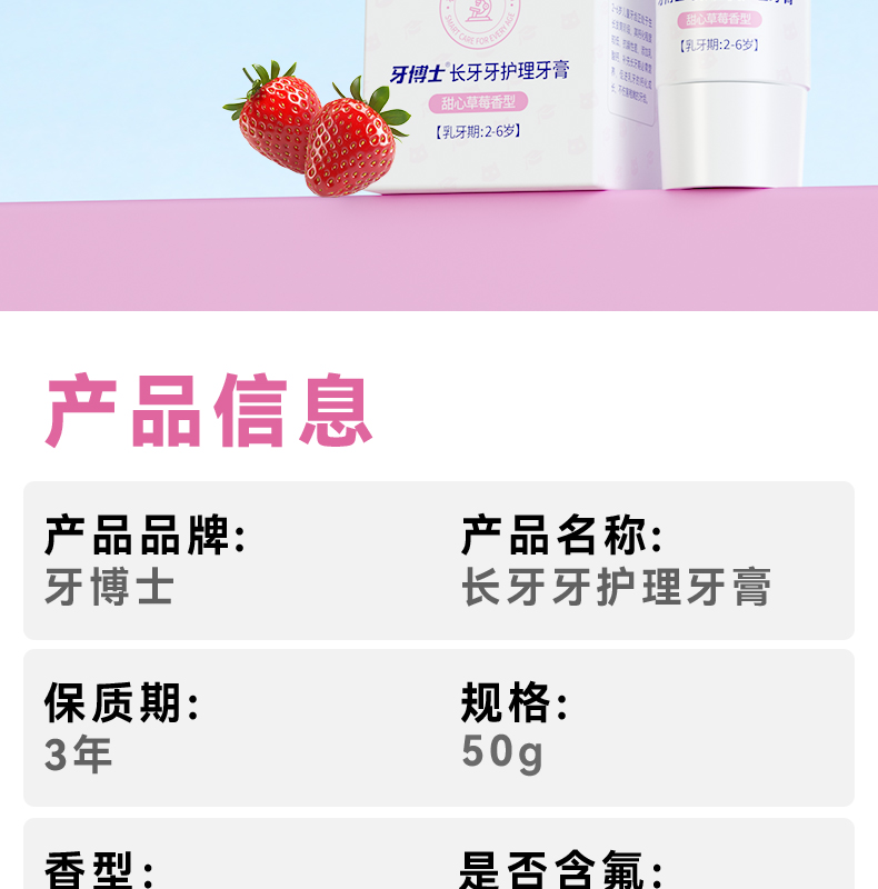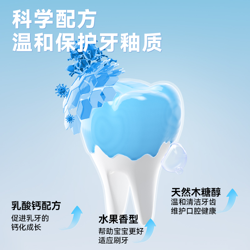 容量:50g 保质期:3年 1.乳酸钙配方,促进乳牙的钙化成长 2.水果香型,帮助宝宝更好适应刷牙 3.温和清洁配方,低泡洁齿少磨损 4.天然木糖醇,温和清洁牙齿 维护口腔健康