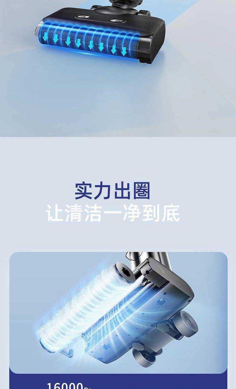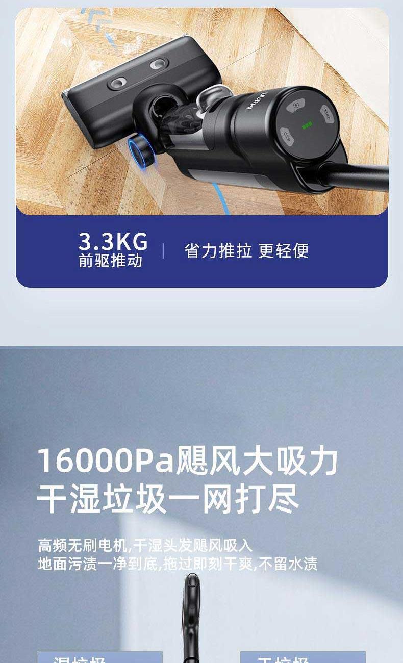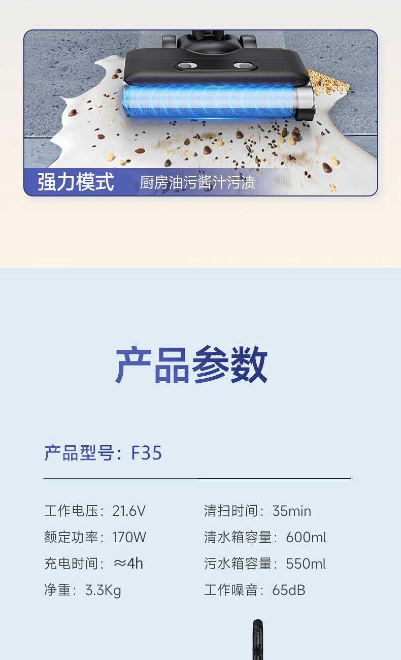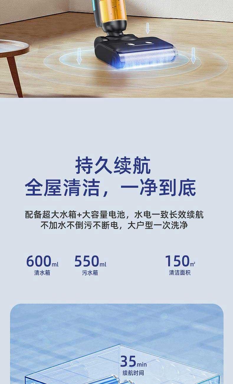 1.电池规格:2500mAh 2.续航时间:低速35分钟高速20分钟 3.充电时长:4小时 4.真空度:>16000pa 5.水箱容量:清水箱600ml/污水箱550ml 6.噪音:s63dB 7.净重/毛重.:3.5KG/6.0KG 8.产品尺寸:270*220*1100mm 9.彩盒尺寸:762mm*328mm*237mm 1.采用无刷电机,16000pa大吸力,千湿脏污,一推即净。 2双向超强贴边,严丝合缝,边角清洁不遗漏。 3.轻量化机身设计,3.5KG前驱助力,轻松推拉,更省力、更丝滑。 4.轻噪音设计63dB,呵护家人健康。 5.高复合材料,易吸水,好晾干,免手洗设计,高速旋转,离心甩干,一键自清洁。 6.大电池容量,35分钟长续航,200平轻松无压力。轻松满足日常清洁所需。