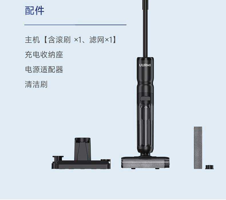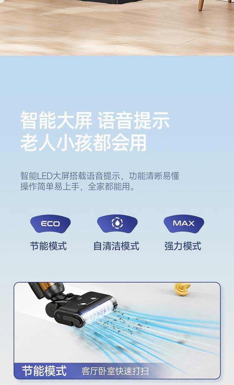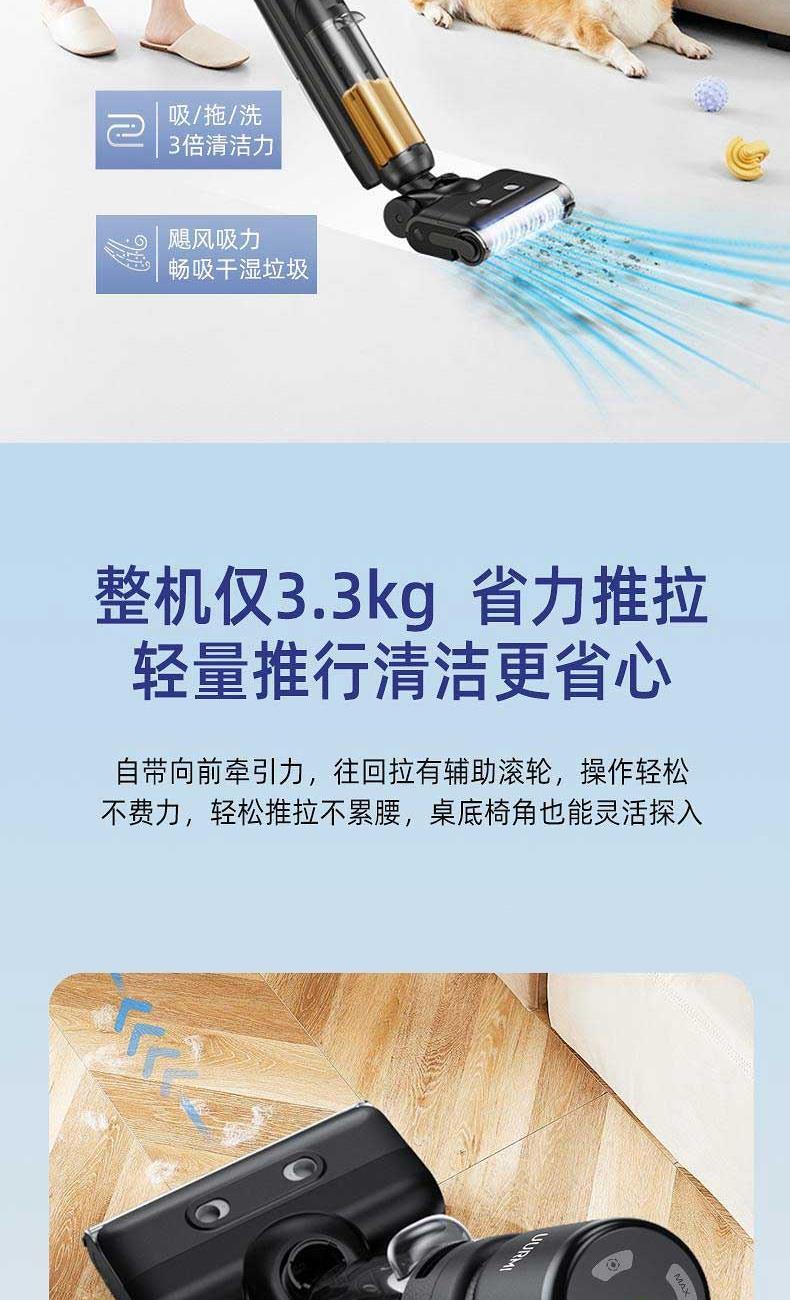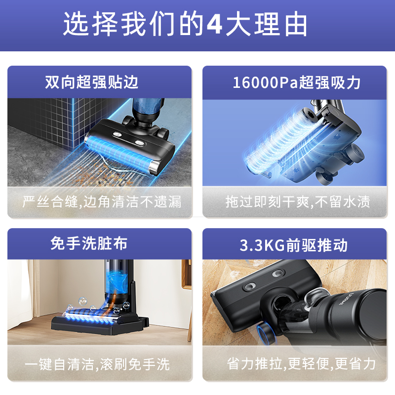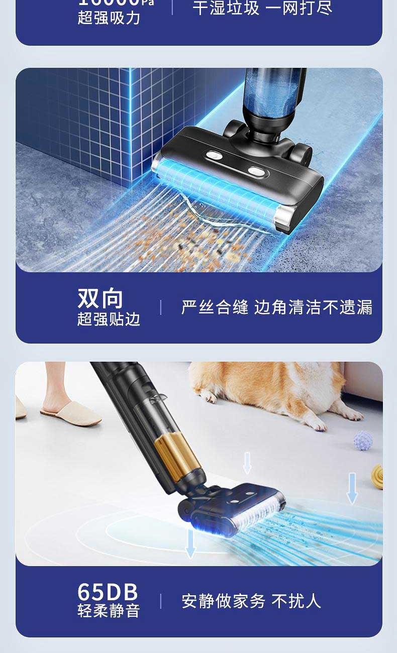 1.电池规格:2500mAh 2.续航时间:低速35分钟高速20分钟 3.充电时长:4小时 4.真空度:>16000pa 5.水箱容量:清水箱600ml/污水箱550ml 6.噪音:s63dB 7.净重/毛重.:3.5KG/6.0KG 8.产品尺寸:270*220*1100mm 9.彩盒尺寸:762mm*328mm*237mm 1.采用无刷电机,16000pa大吸力,千湿脏污,一推即净。 2双向超强贴边,严丝合缝,边角清洁不遗漏。 3.轻量化机身设计,3.5KG前驱助力,轻松推拉,更省力、更丝滑。 4.轻噪音设计63dB,呵护家人健康。 5.高复合材料,易吸水,好晾干,免手洗设计,高速旋转,离心甩干,一键自清洁。 6.大电池容量,35分钟长续航,200平轻松无压力。轻松满足日常清洁所需。