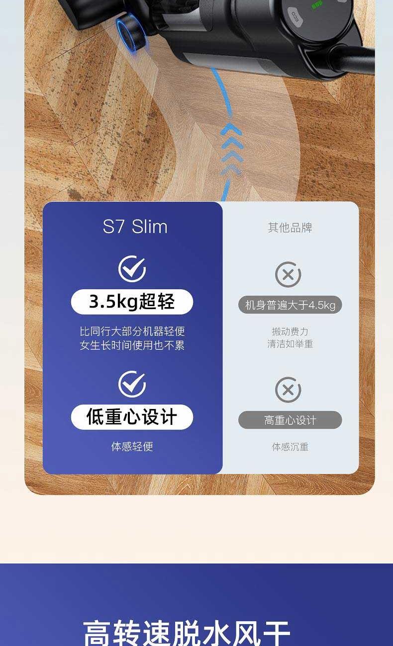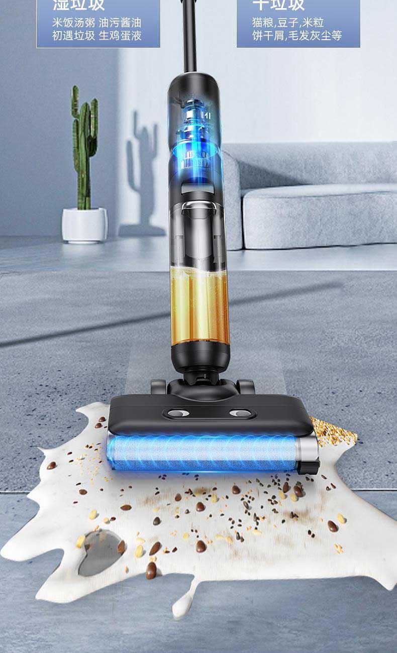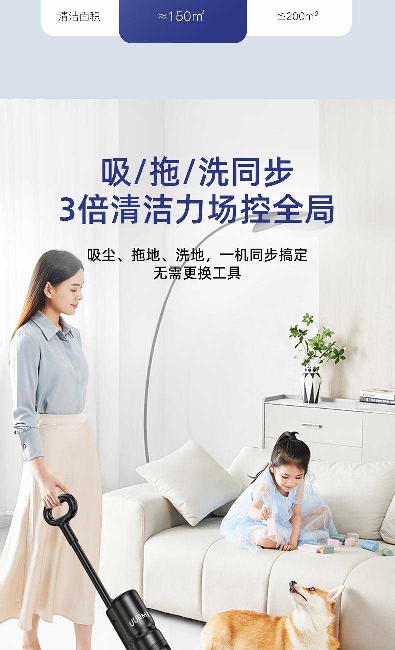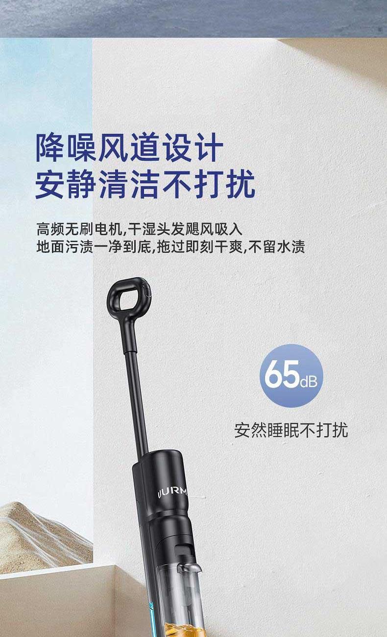 1.电池规格:2500mAh 2.续航时间:低速35分钟高速20分钟 3.充电时长:4小时 4.真空度:>16000pa 5.水箱容量:清水箱600ml/污水箱550ml 6.噪音:s63dB 7.净重/毛重.:3.5KG/6.0KG 8.产品尺寸:270*220*1100mm 9.彩盒尺寸:762mm*328mm*237mm 1.采用无刷电机,16000pa大吸力,千湿脏污,一推即净。 2双向超强贴边,严丝合缝,边角清洁不遗漏。 3.轻量化机身设计,3.5KG前驱助力,轻松推拉,更省力、更丝滑。 4.轻噪音设计63dB,呵护家人健康。 5.高复合材料,易吸水,好晾干,免手洗设计,高速旋转,离心甩干,一键自清洁。 6.大电池容量,35分钟长续航,200平轻松无压力。轻松满足日常清洁所需。
