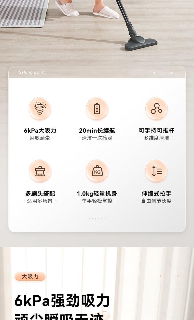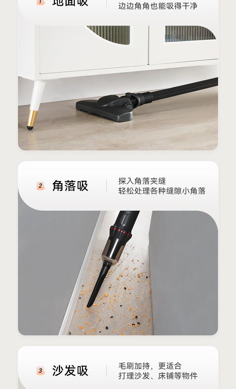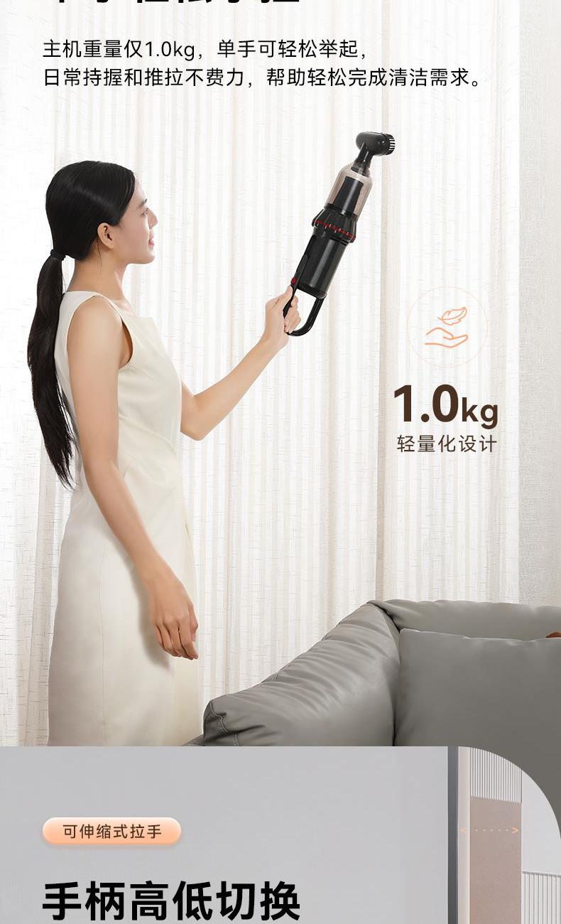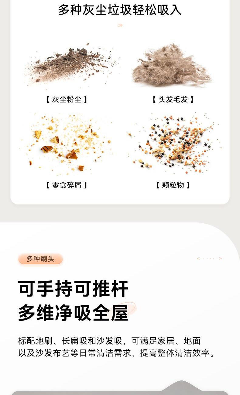 功率:100W(有刷电机) 吸力:4-6Kpa 尘杯容量:0.5L 国际编码:6971874764869 净重/毛重:1.0/1.8 kg 产品尺寸:1.8mm 啡盒尺寸:570*155*184mm