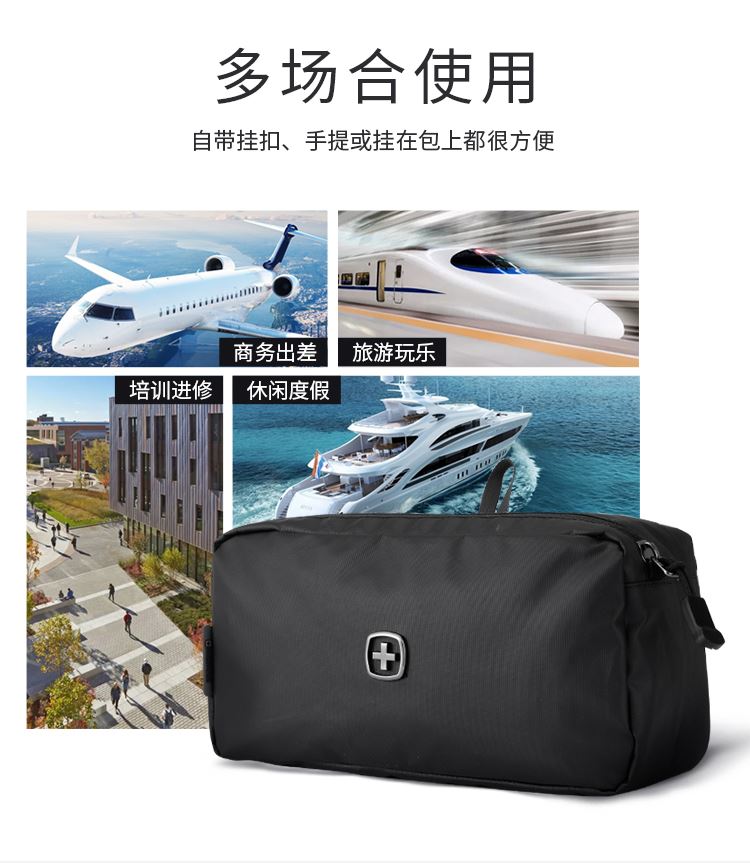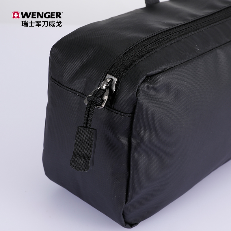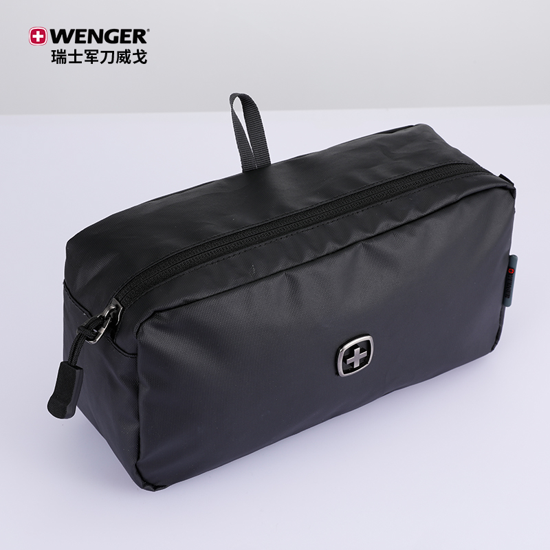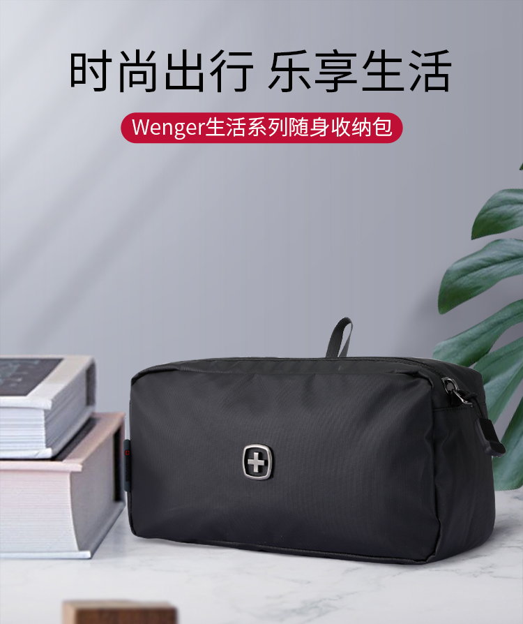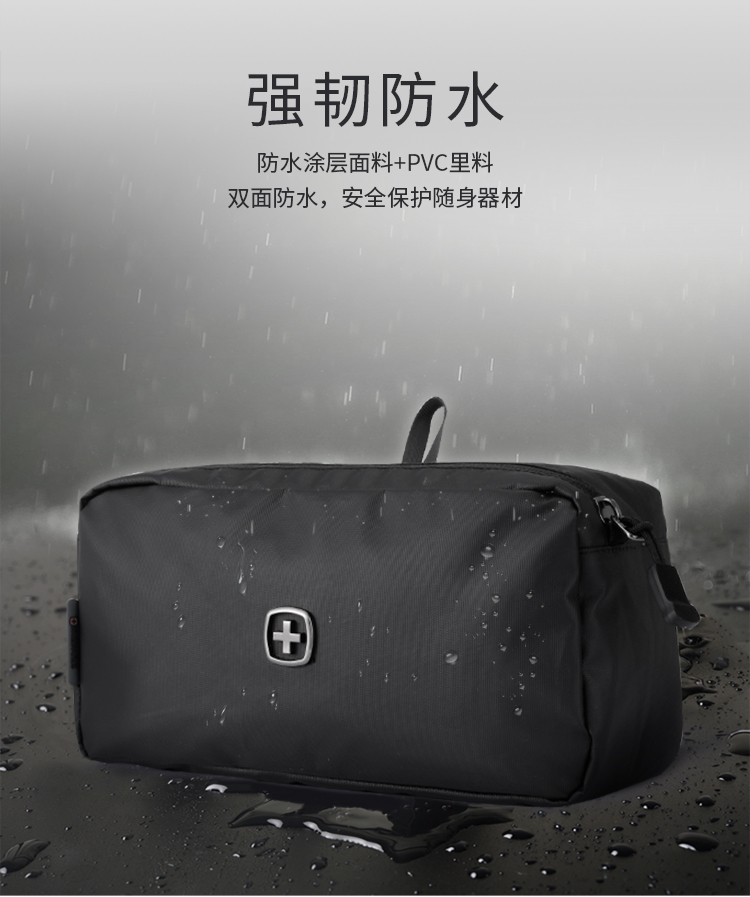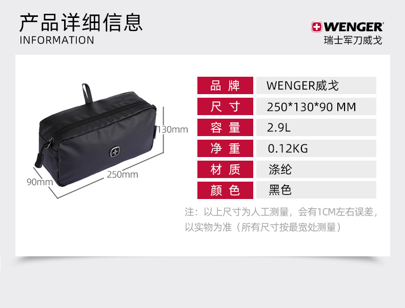 品 牌:WENGER威戈 颜色:黑色 尺寸:250*130*90 mm 容量:2.9L 净重:0.12kg 材质:涤纶(防泼水聚酯纤维) 1、小身材 大容量:独立大容量空间,收纳更大、更多; 2、强韧防水防水涂层面料+PVC里料双面防水,安全保护随身器材; 3、多场合使用:自带挂扣、手提或挂在包上都很方便; 4、防滑拉链橡胶拼接拉链,经久耐用,防滑好抓取; 5、精致LOGO,凹凸紧致质感LOGO时尚耐看,彰显品质。
