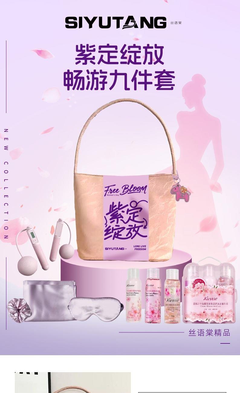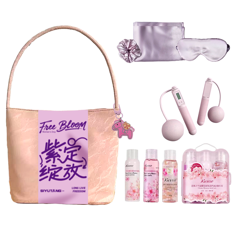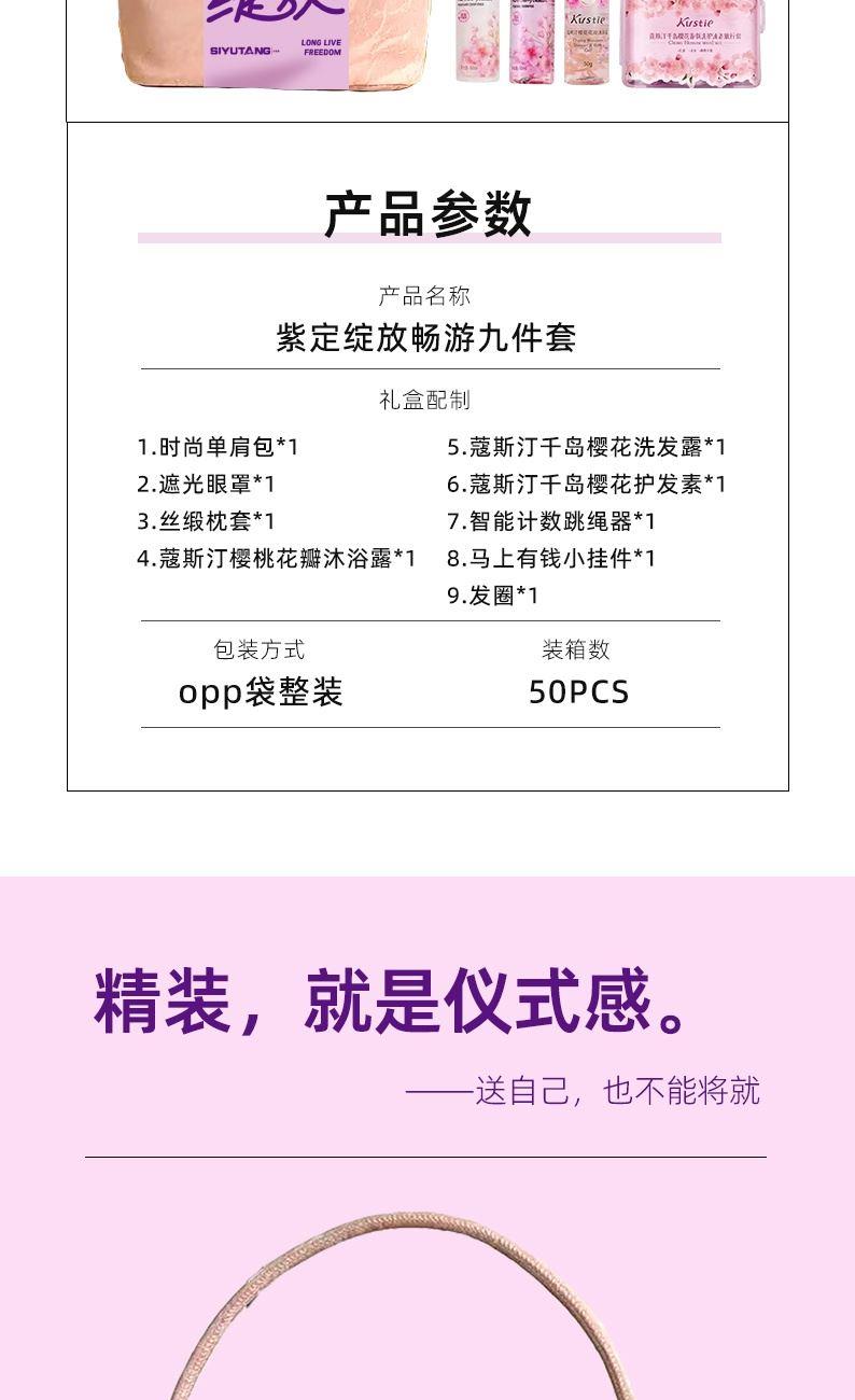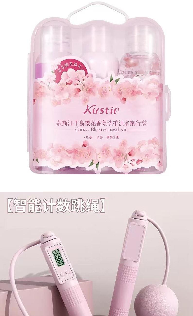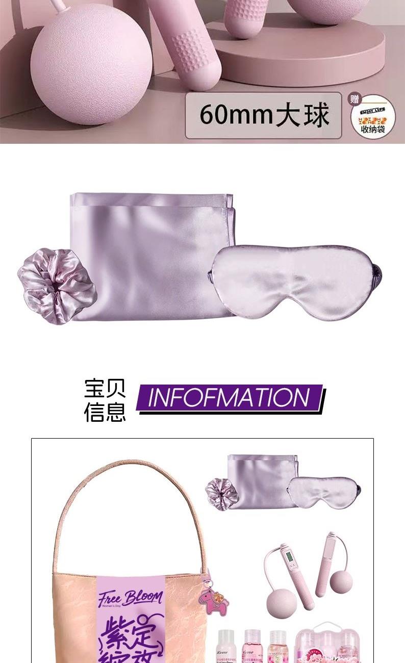 礼盒配制:1.时尚单肩包*1 2.遮光眼罩*1 3.丝缎枕套*1 4.蔻斯汀樱桃花瓣沐浴露*1 5.蔻斯汀千岛樱花洗发露*1 6.蔻斯汀千岛樱花护发素*1 7.智能计数跳绳器*1 8.马上有钱小挂件*1 9.发圈*1 包装方式:opp袋整