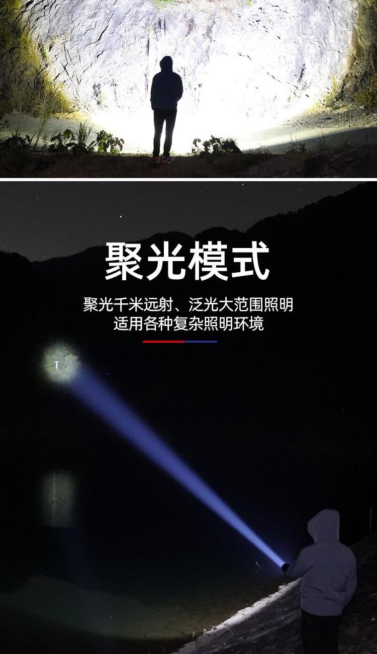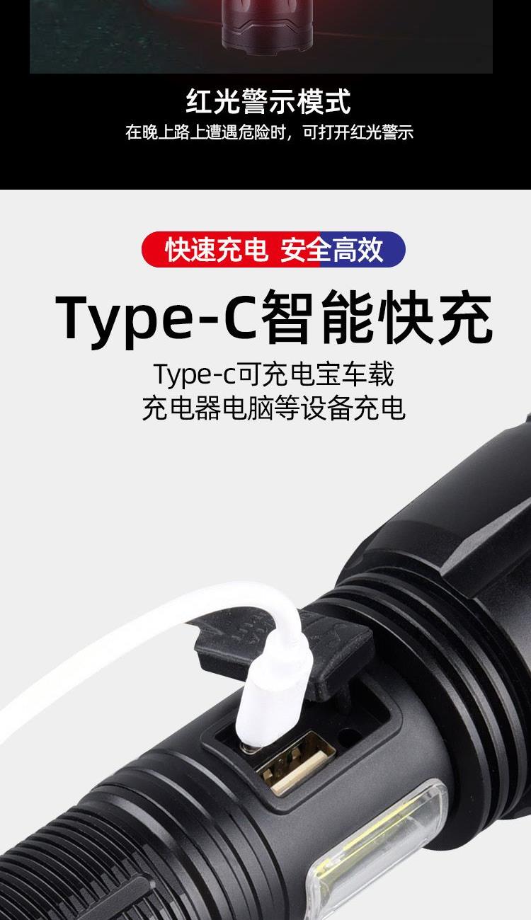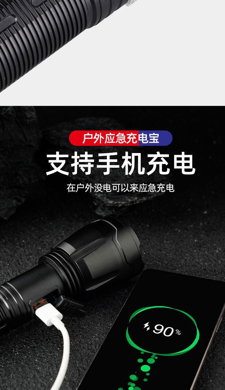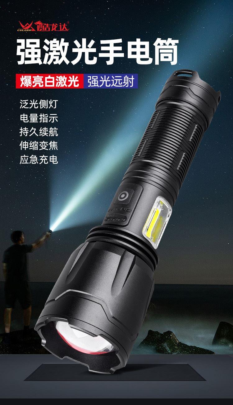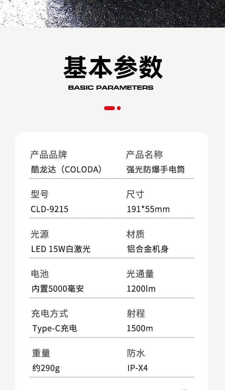 光源:LED 15W白激光 电池:内置5000毫安 充电方式:Type-C充电 重量:约290g 尺寸:191*55mm 材质:铝合金机身 光通量:1200lm 射程:1500m 防水:IP-X4