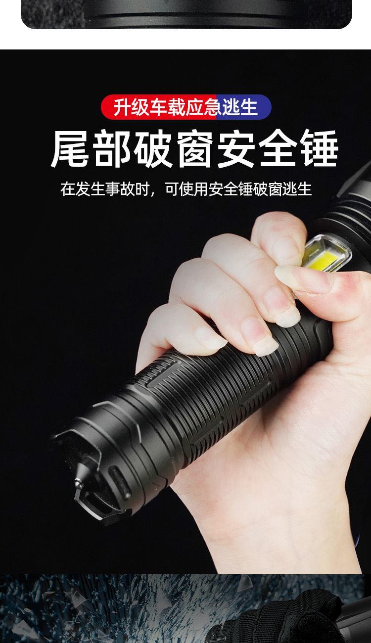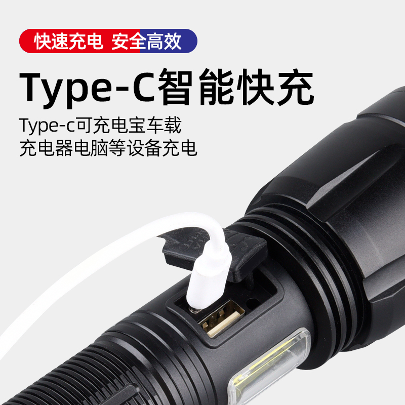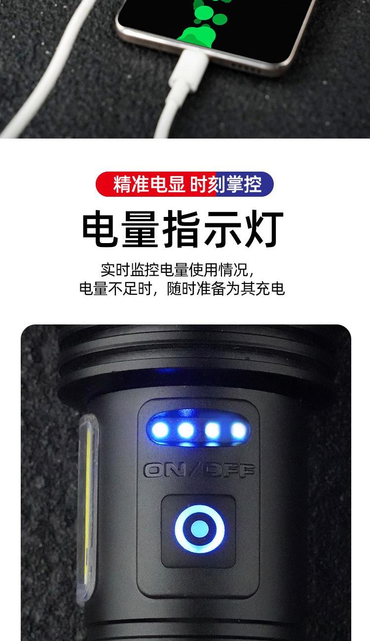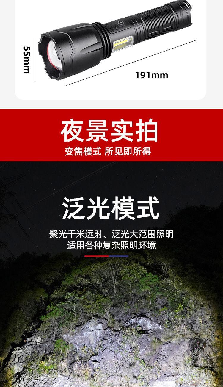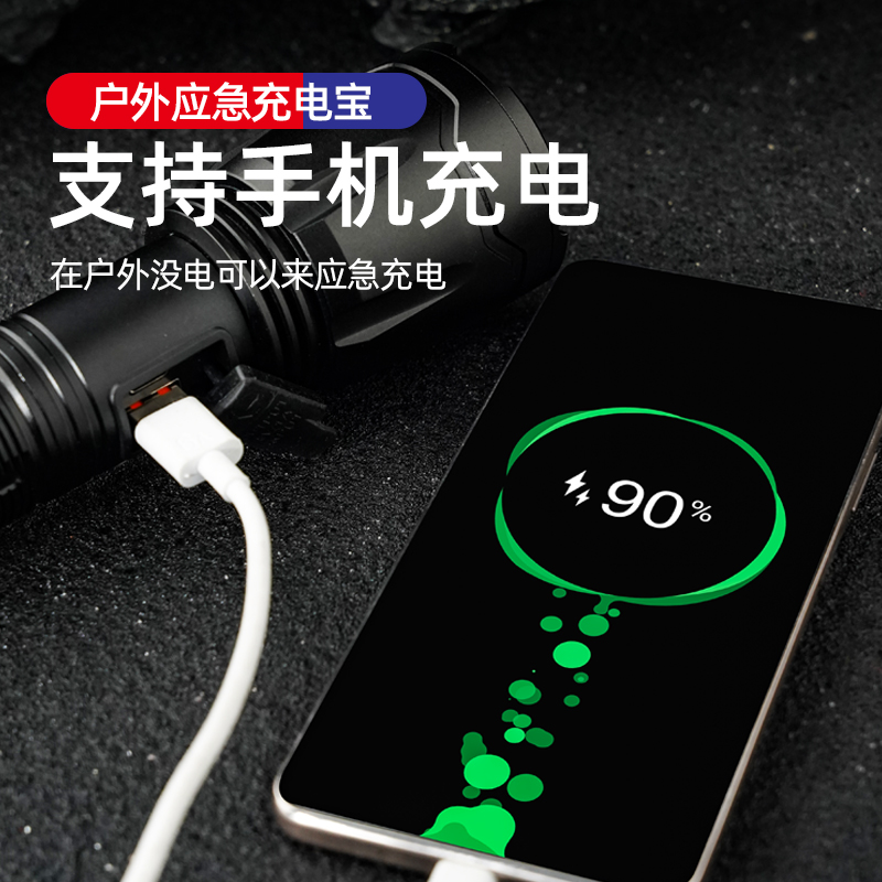 光源:LED 15W白激光 电池:内置5000毫安 充电方式:Type-C充电 重量:约290g 尺寸:191*55mm 材质:铝合金机身 光通量:1200lm 射程:1500m 防水:IP-X4