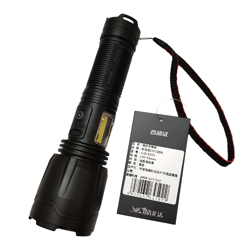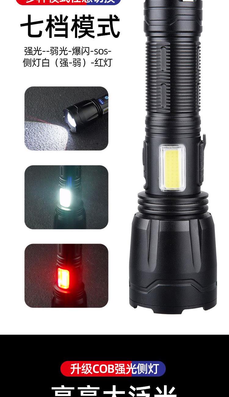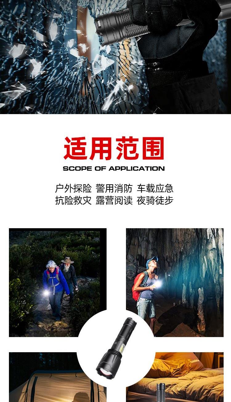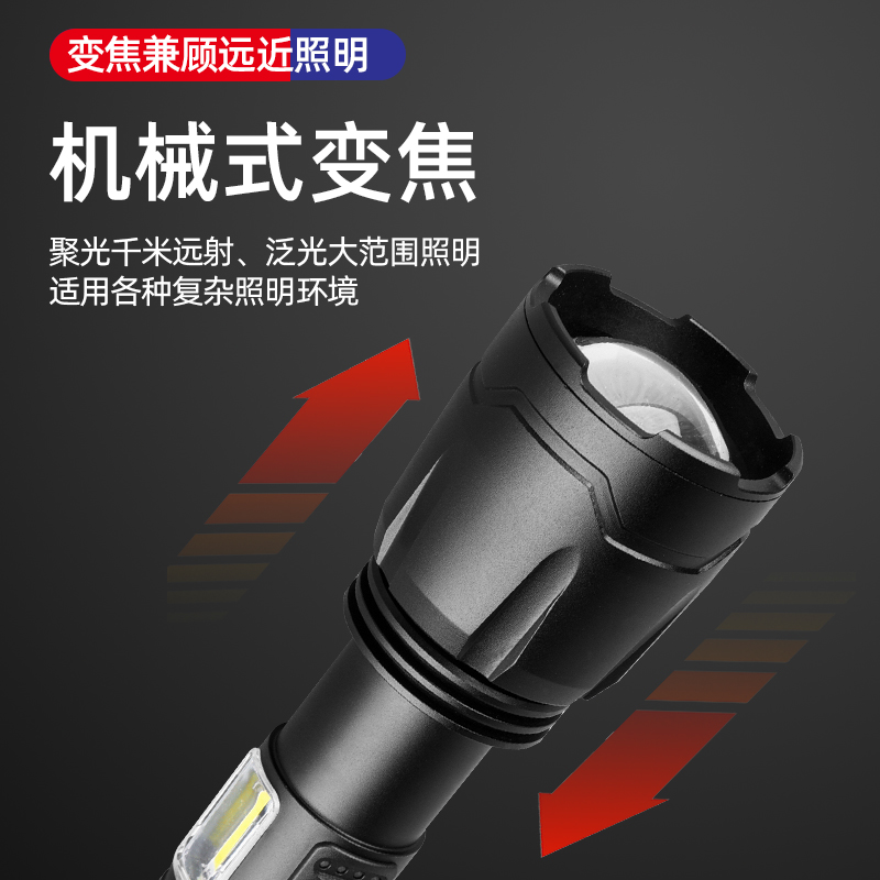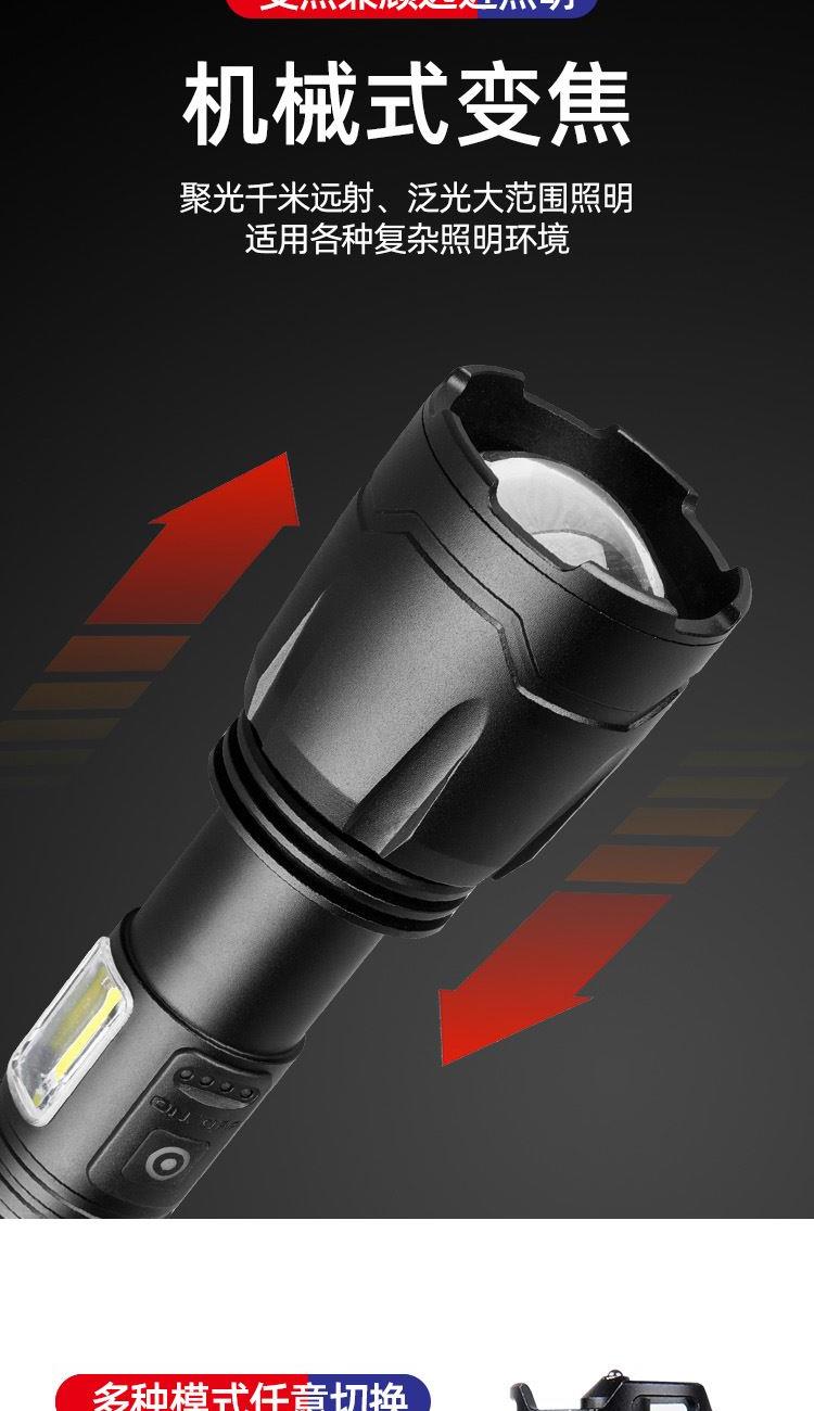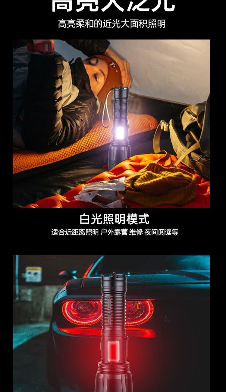 光源:LED 15W白激光 电池:内置5000毫安 充电方式:Type-C充电 重量:约290g 尺寸:191*55mm 材质:铝合金机身 光通量:1200lm 射程:1500m 防水:IP-X4