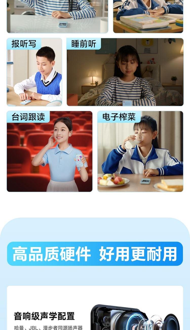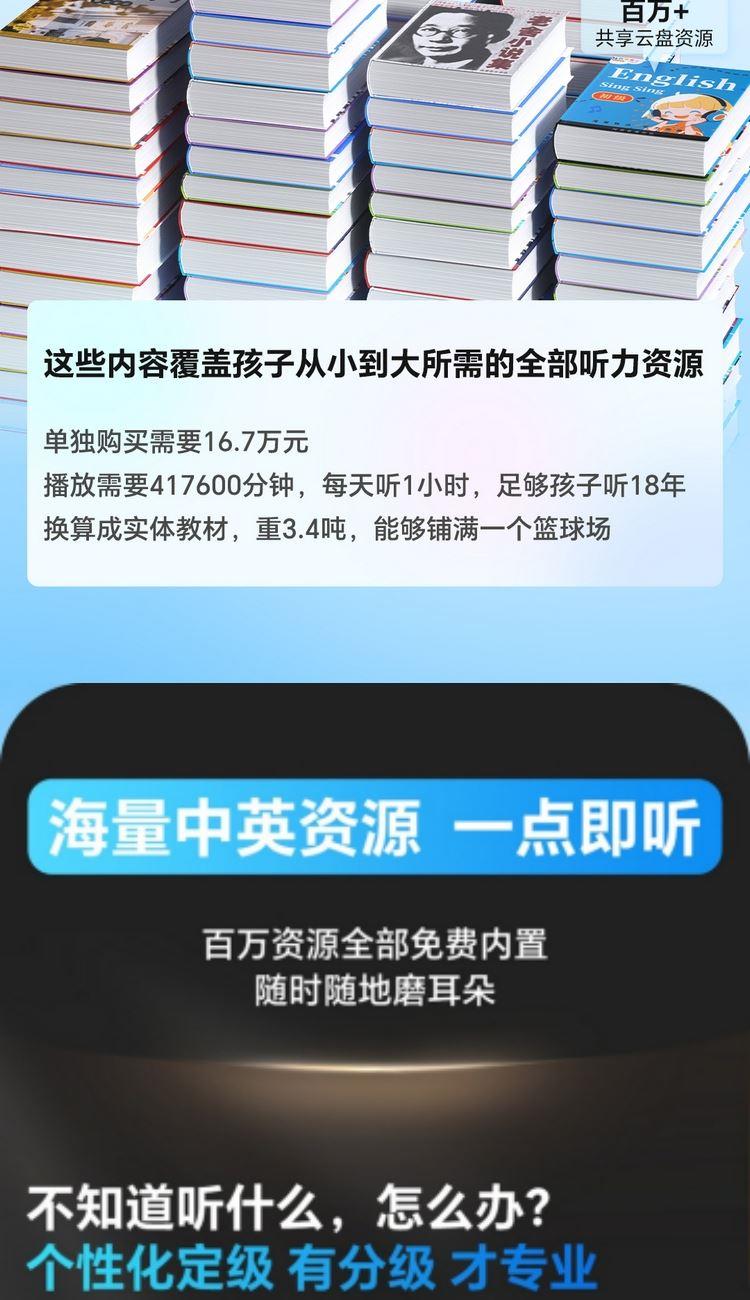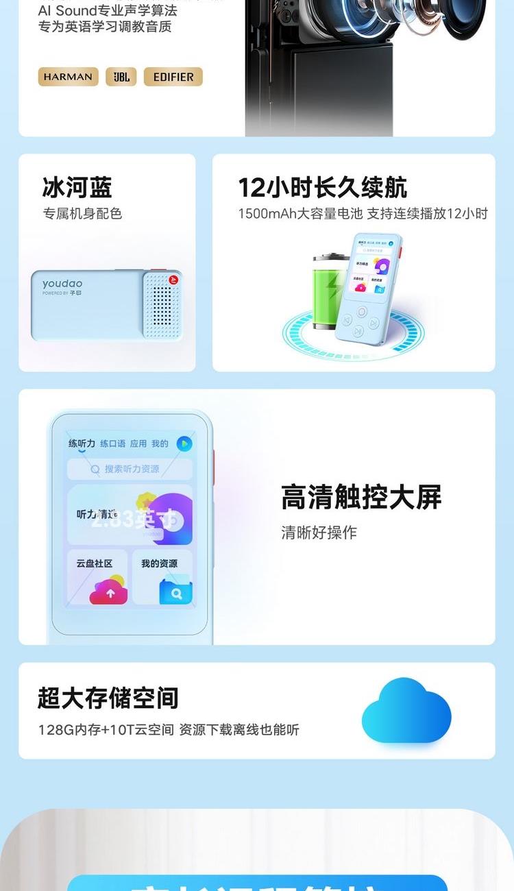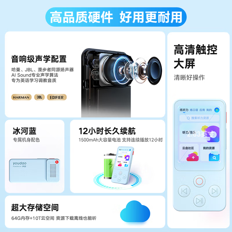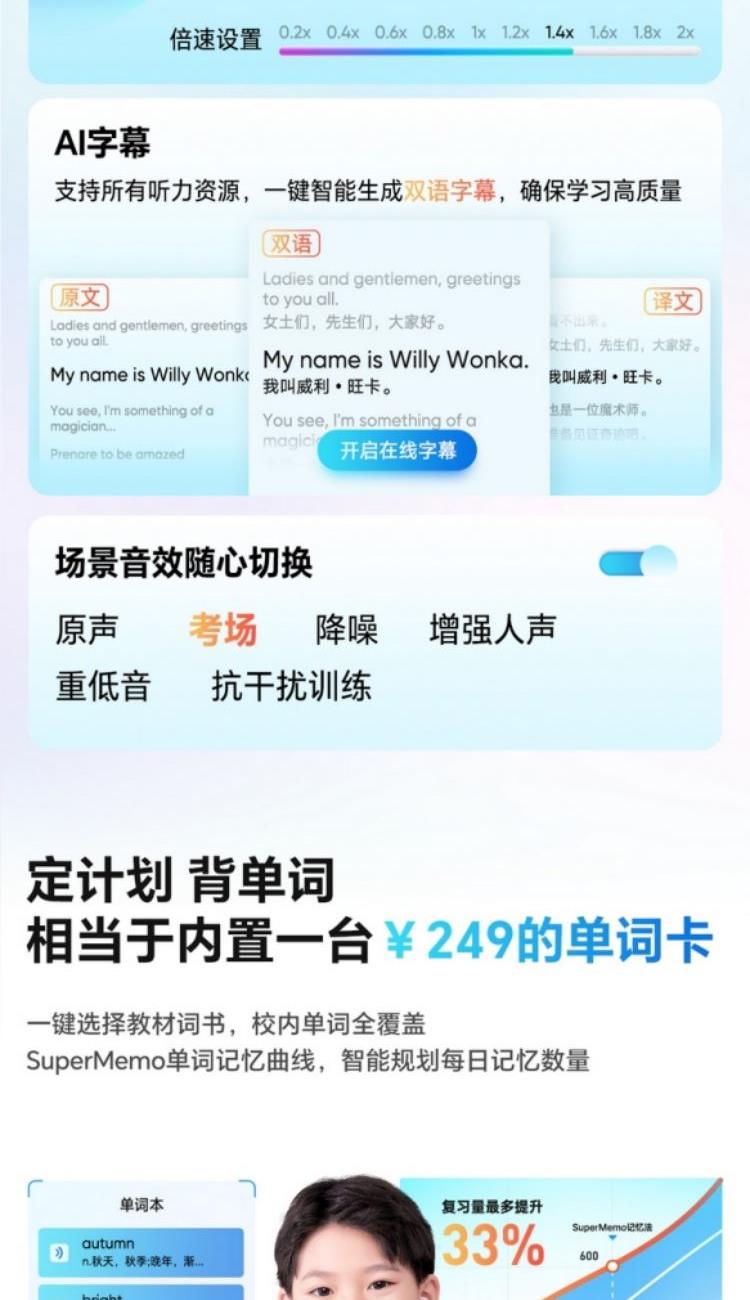 AI精讲进行难点解析;AI口语教练模拟真实对话场景;发音指导,对发音进行专项训练;听力真题训练,提供真实考题; 1500mAh大电量,满足日常8小时学习; 2.83英寸触摸大屏不伤眼,学习更清晰;200GB不限速云盘 AI智能断句+字幕;提升英语听说能力,智能分级听说 英语口语模考;AI情景口语;海量听力资源;智能复读跟读