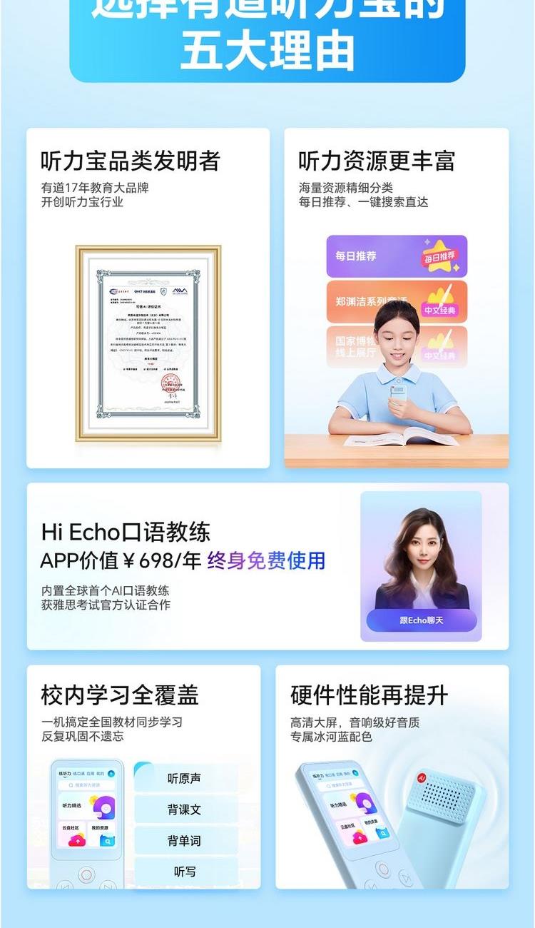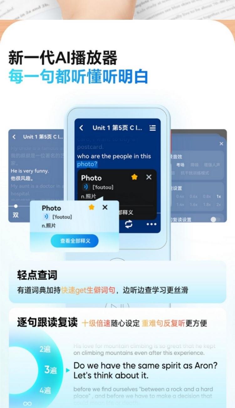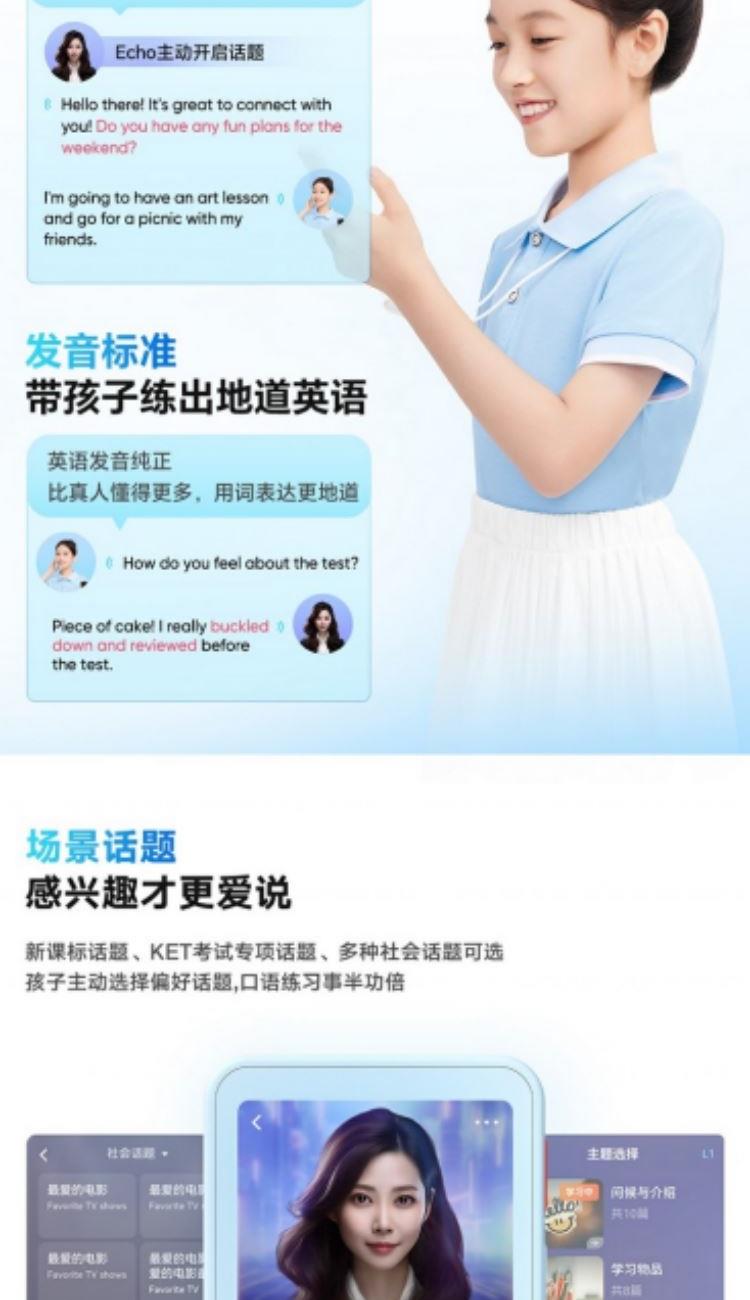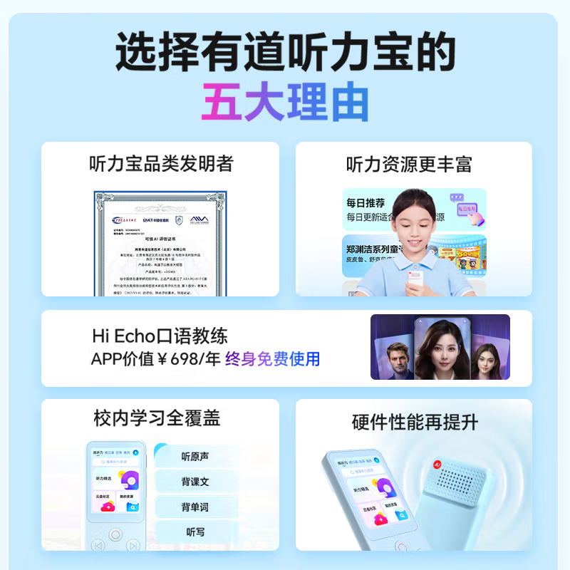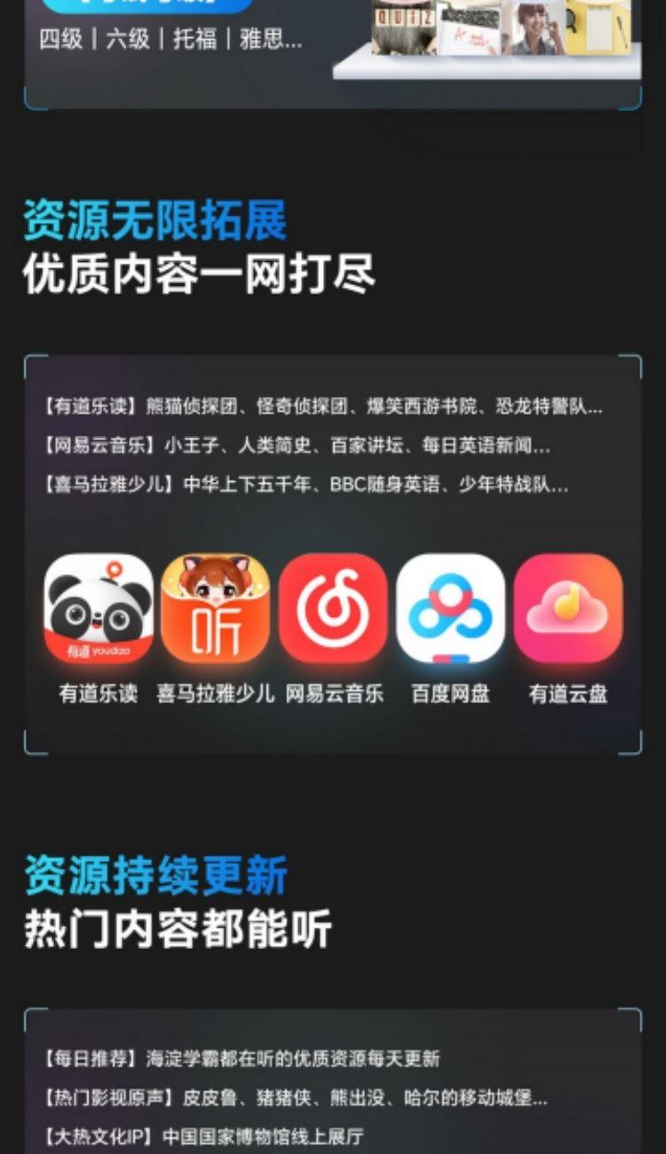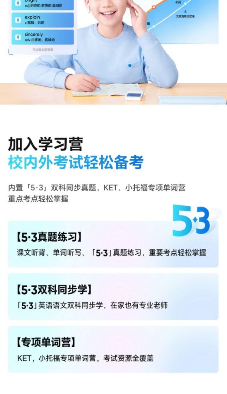 AI精讲进行难点解析;AI口语教练模拟真实对话场景;发音指导,对发音进行专项训练;听力真题训练,提供真实考题; 1500mAh大电量,满足日常8小时学习; 2.83英寸触摸大屏不伤眼,学习更清晰;200GB不限速云盘 AI智能断句+字幕;提升英语听说能力,智能分级听说 英语口语模考;AI情景口语;海量听力资源;智能复读跟读