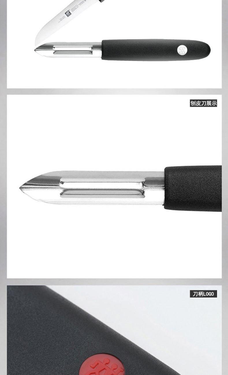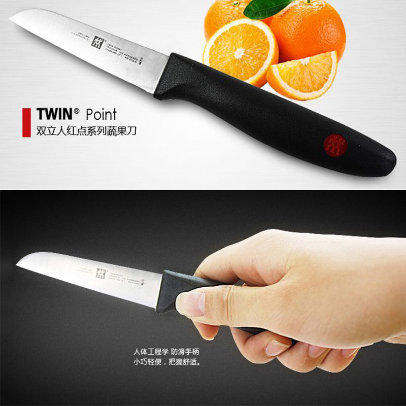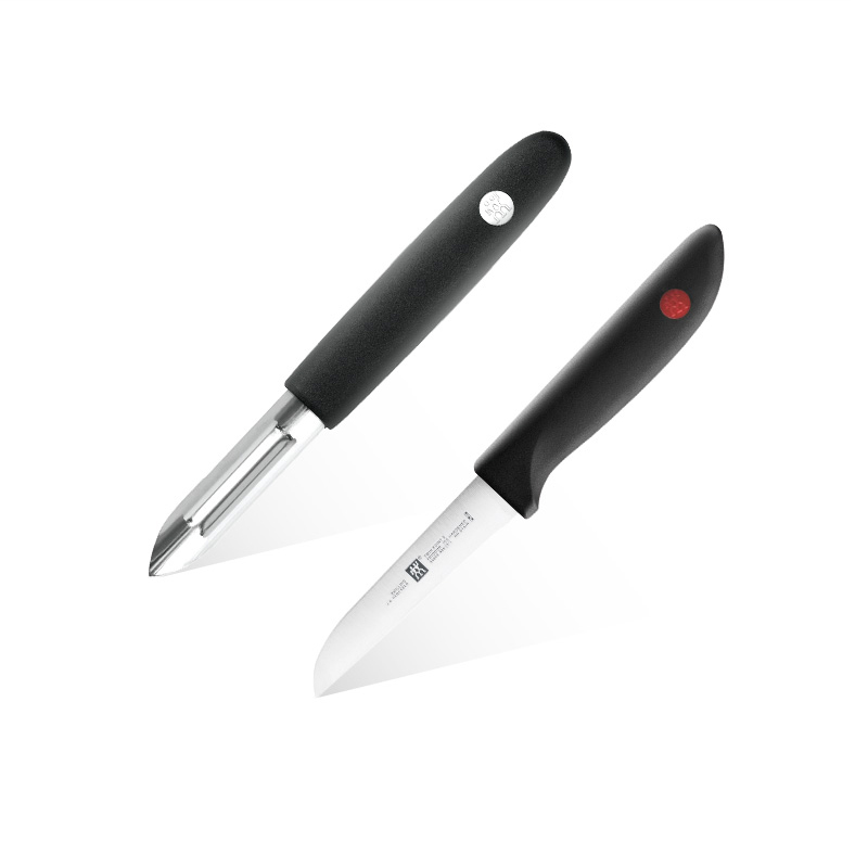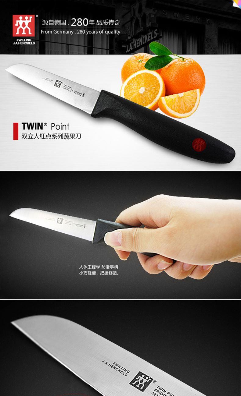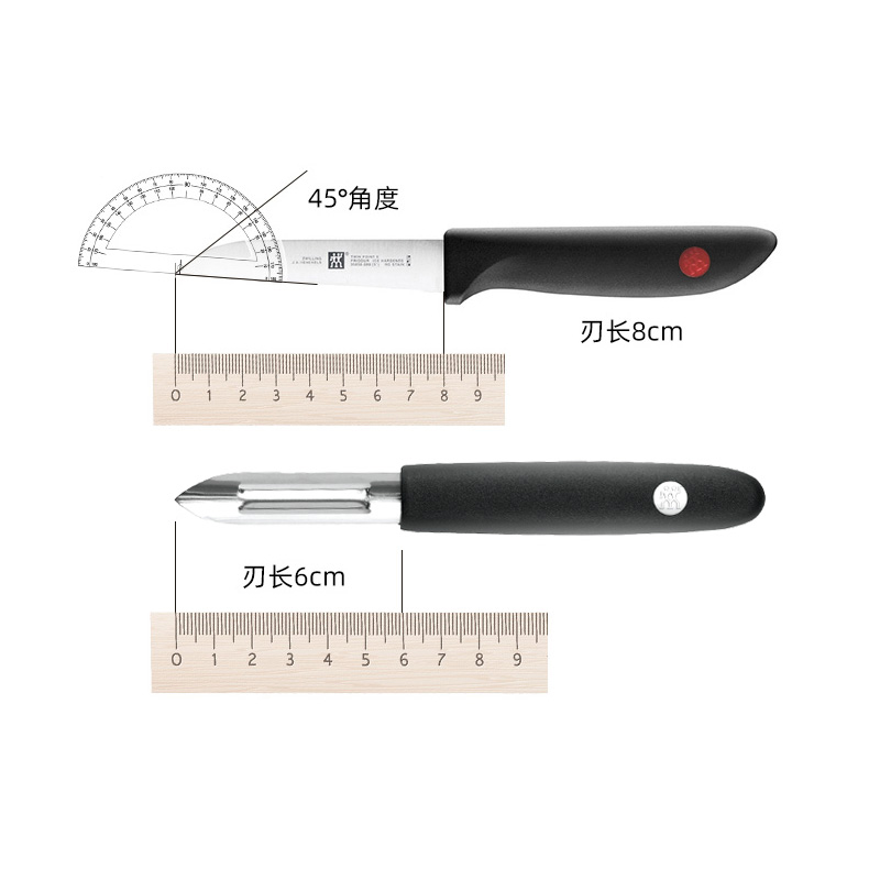 货号:32331-018 尺寸:26*2*8.4cm 重量:90g 包装形式:吸塑包装 产品包含: TWIN Point 蔬果刀32320-080 刃长8cm TWIN Point 剥皮刀32850-060 刃长6cm 蔬菜刀:刀身小巧,适用于各种蔬菜及水果去皮,切片和切丝等 经久耐用 耐腐蚀 刀背采用45度斜抛磨技术,长时间使用,手指不会感到疼痛。 剥皮刀:用于瓜果及马铃薯的去皮,刀尖可挖去果蔬表面凹陷。