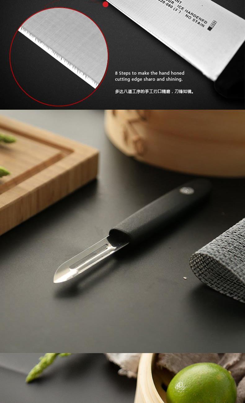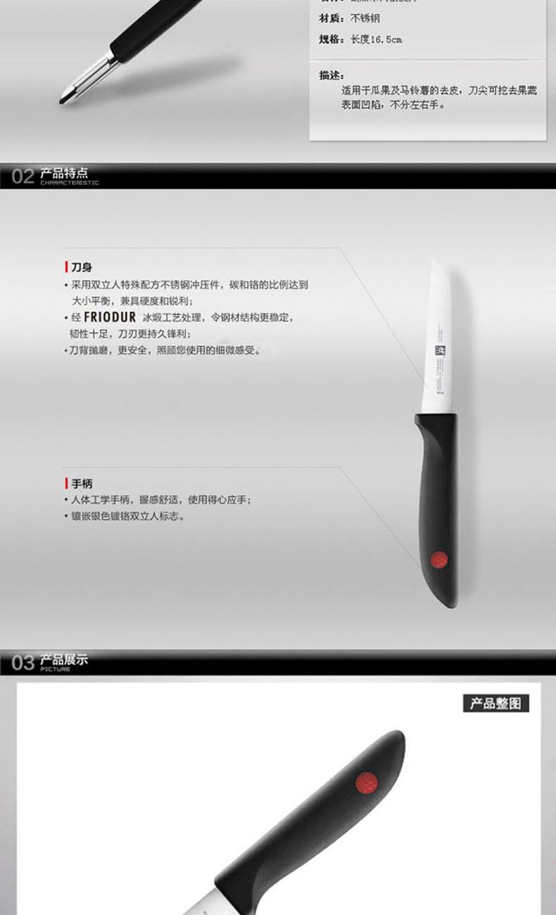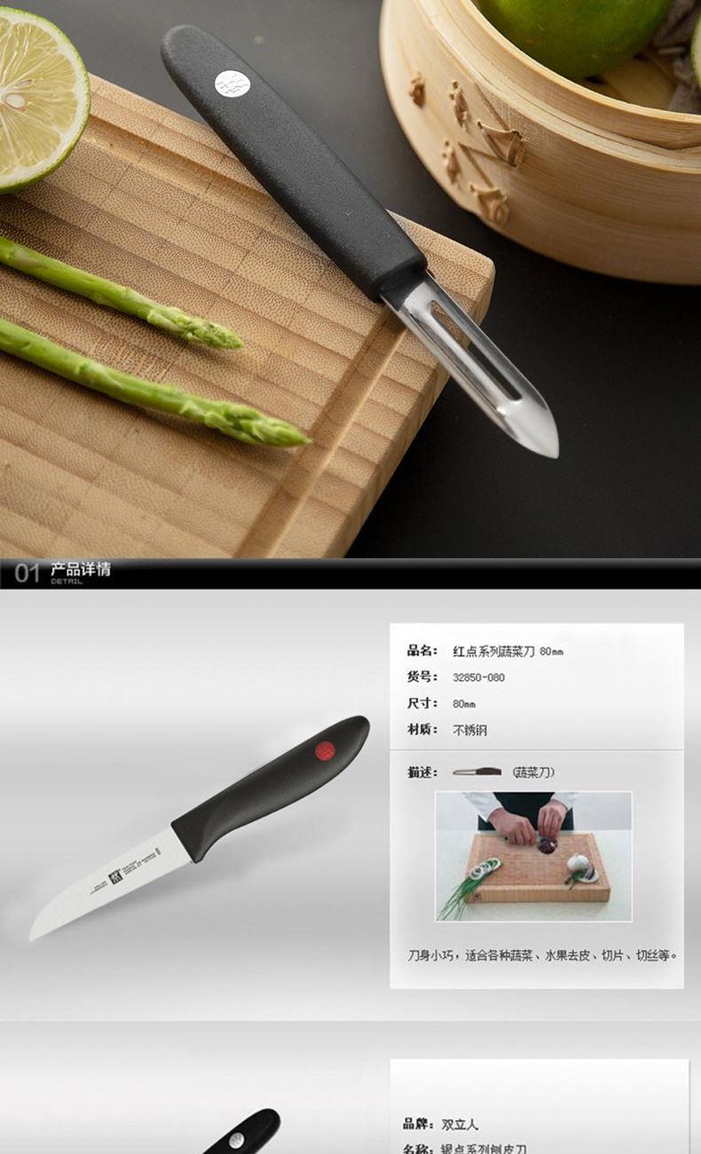 货号:32331-018 尺寸:26*2*8.4cm 重量:90g 包装形式:吸塑包装 产品包含: TWIN Point 蔬果刀32320-080 刃长8cm TWIN Point 剥皮刀32850-060 刃长6cm 蔬菜刀:刀身小巧,适用于各种蔬菜及水果去皮,切片和切丝等 经久耐用 耐腐蚀 刀背采用45度斜抛磨技术,长时间使用,手指不会感到疼痛。 剥皮刀:用于瓜果及马铃薯的去皮,刀尖可挖去果蔬表面凹陷。