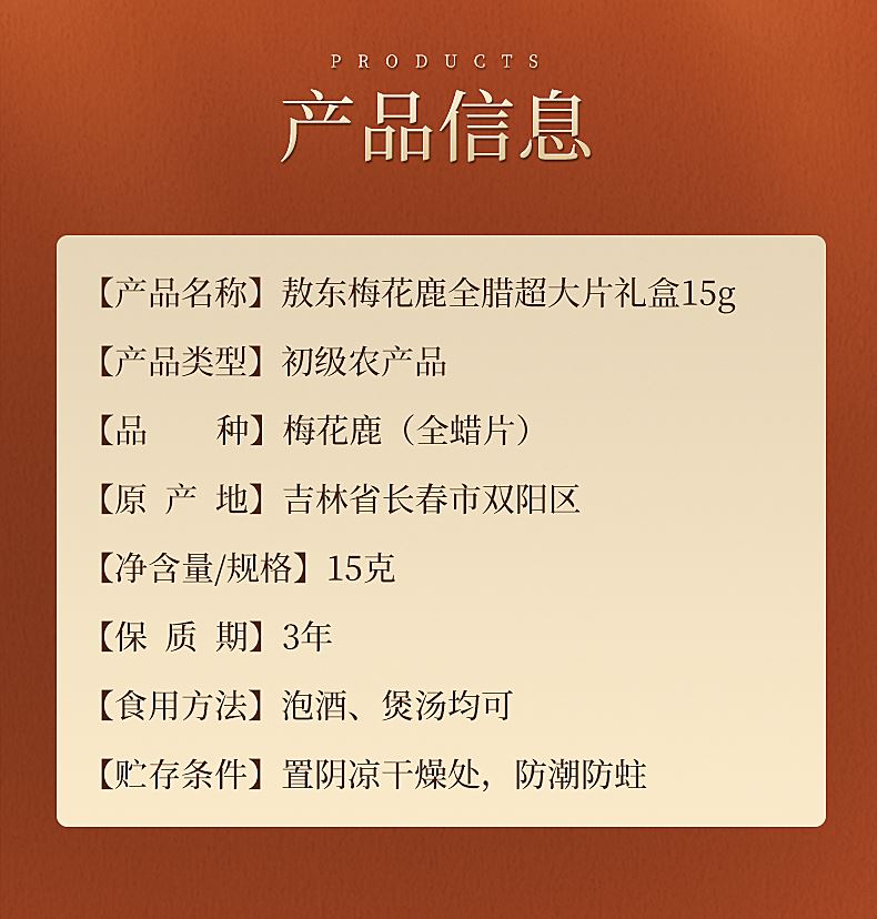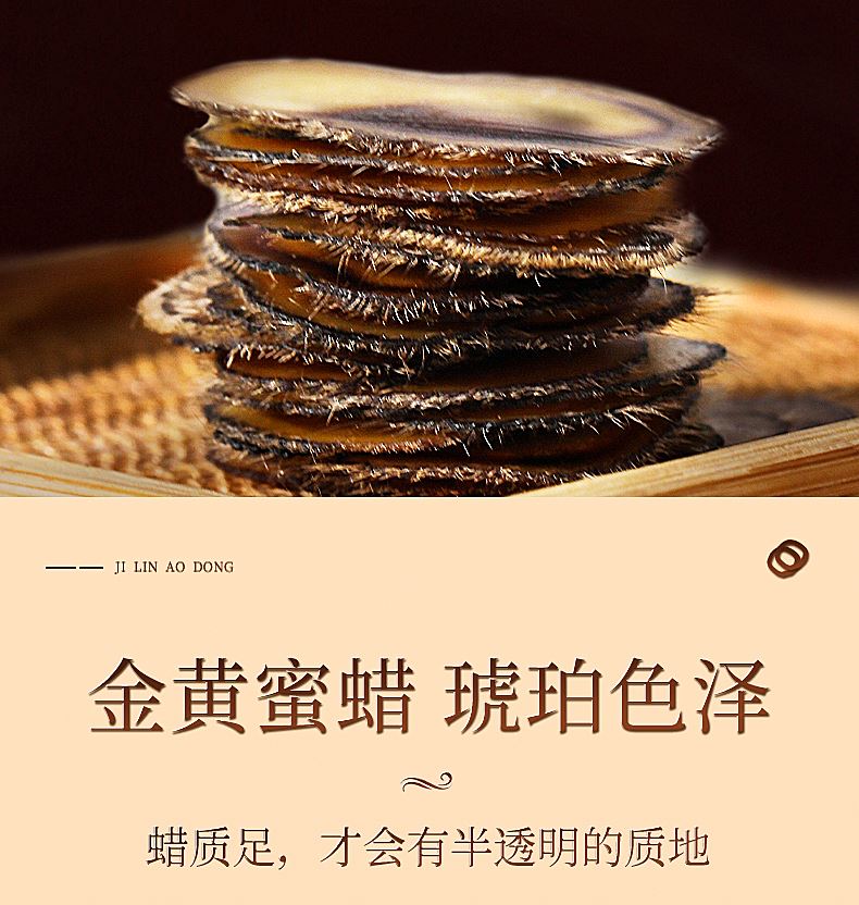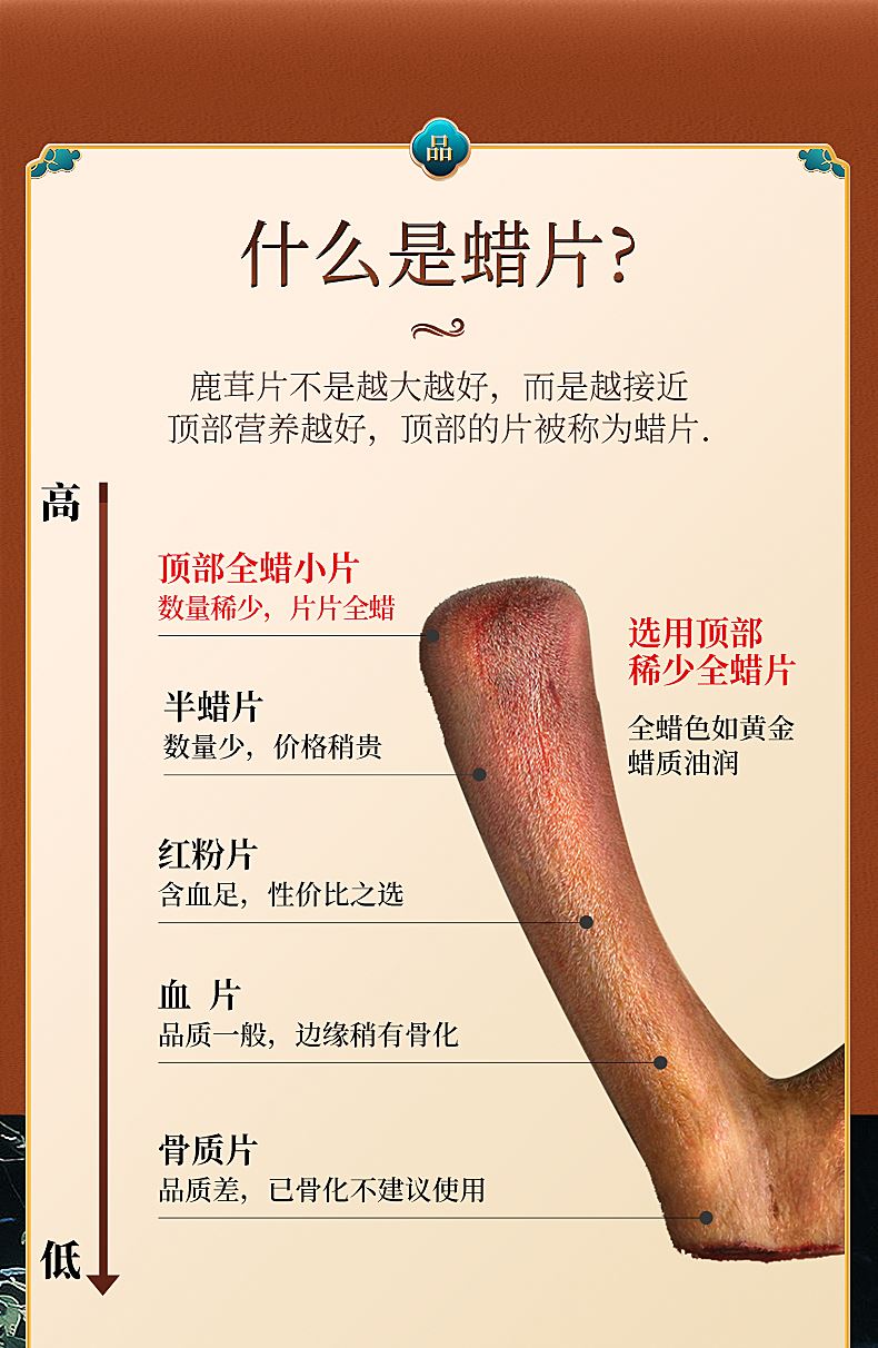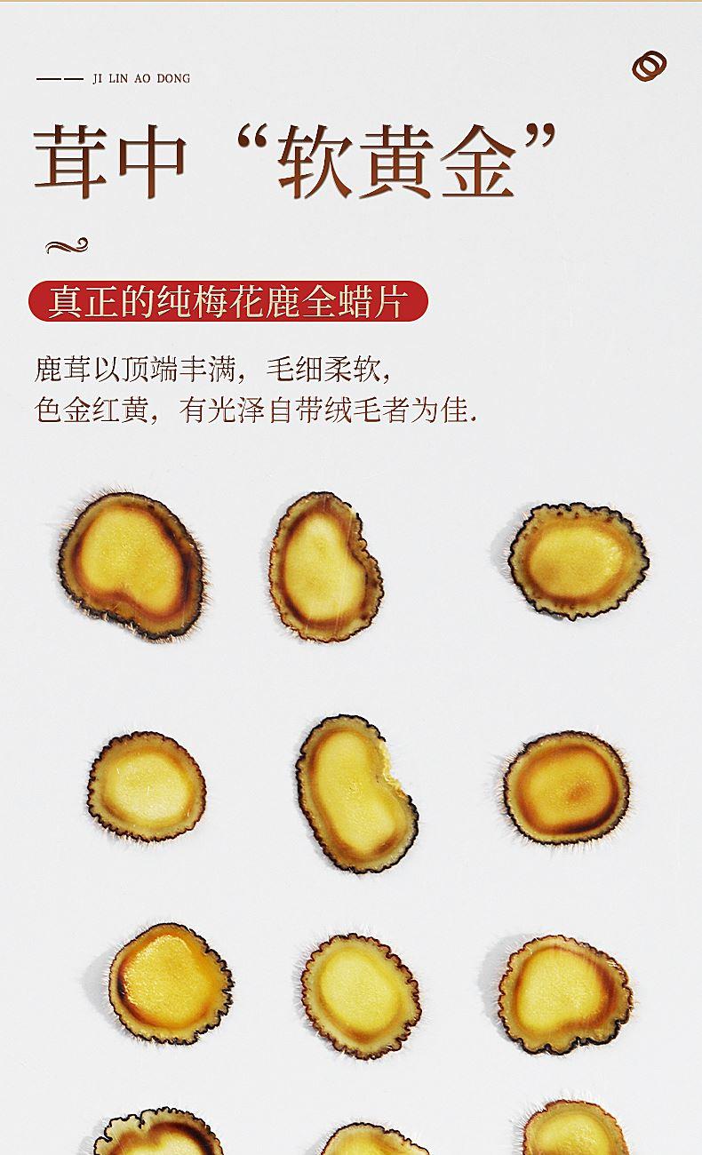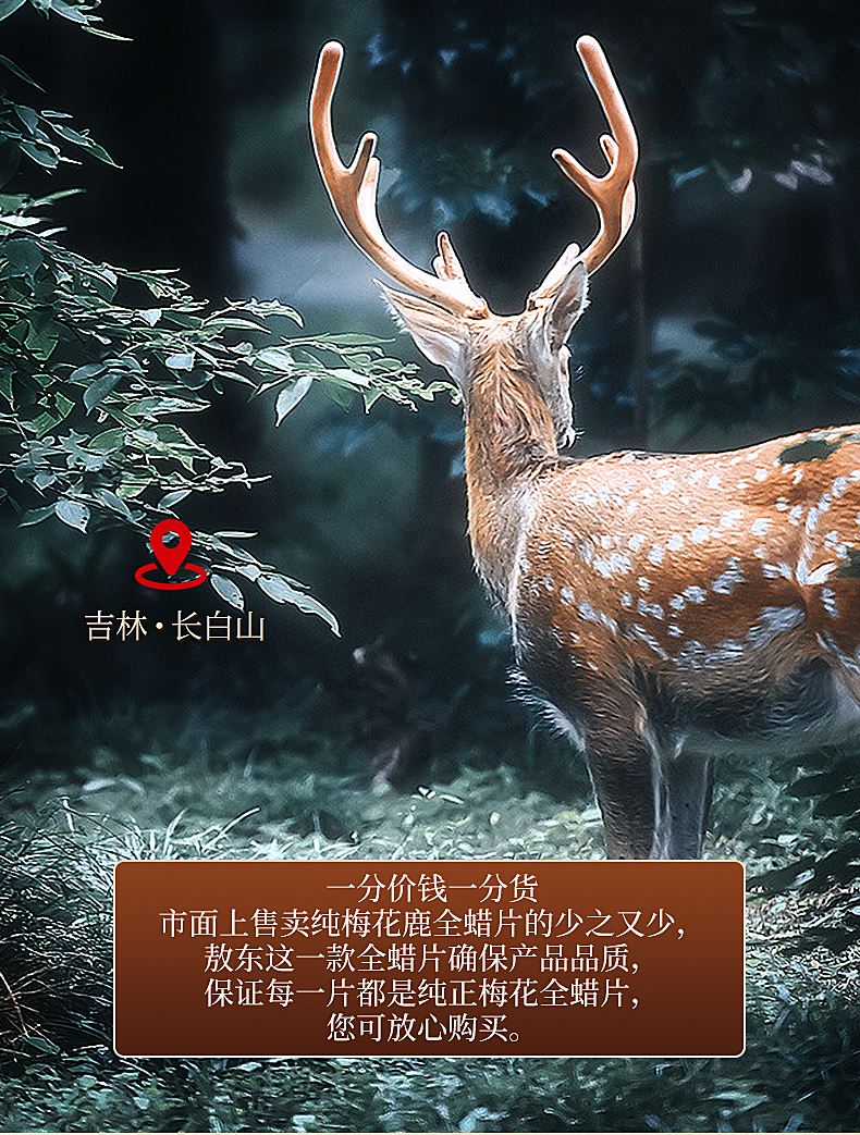 净含量: 15克左右 纯正梅花鹿蜡片 选取成年壮鹿主角, 选取顶部全蜡小片,数量稀缺,片片来之不易。 每天用量少于2克 泡水 泡酒 煲汤