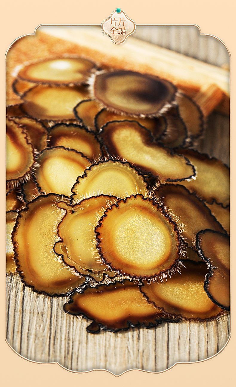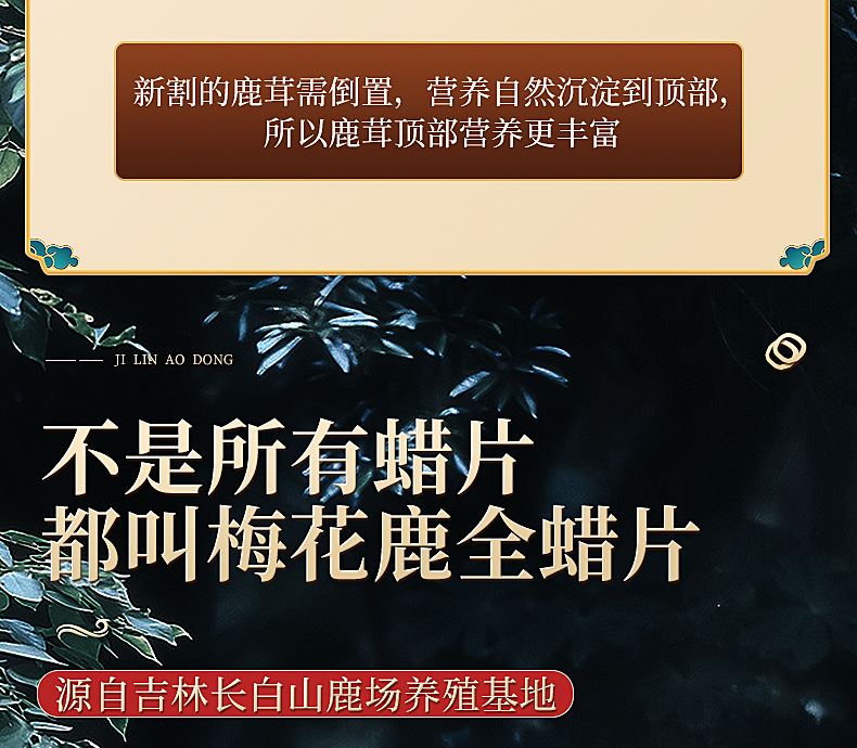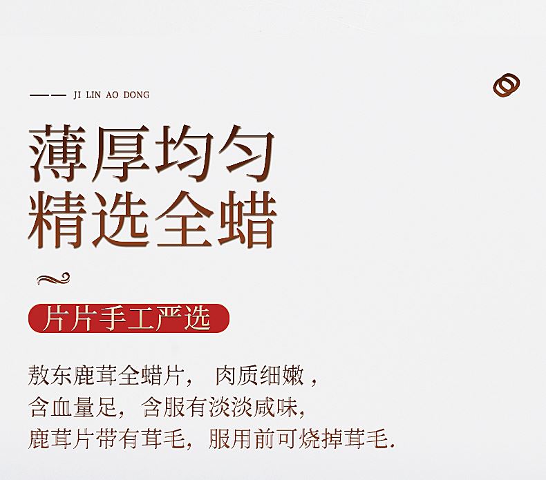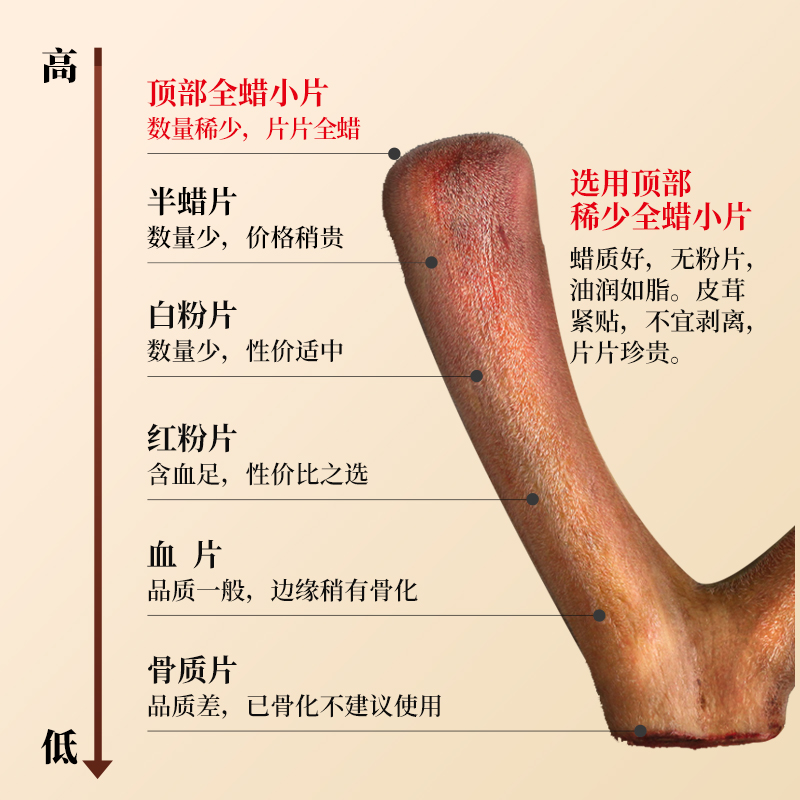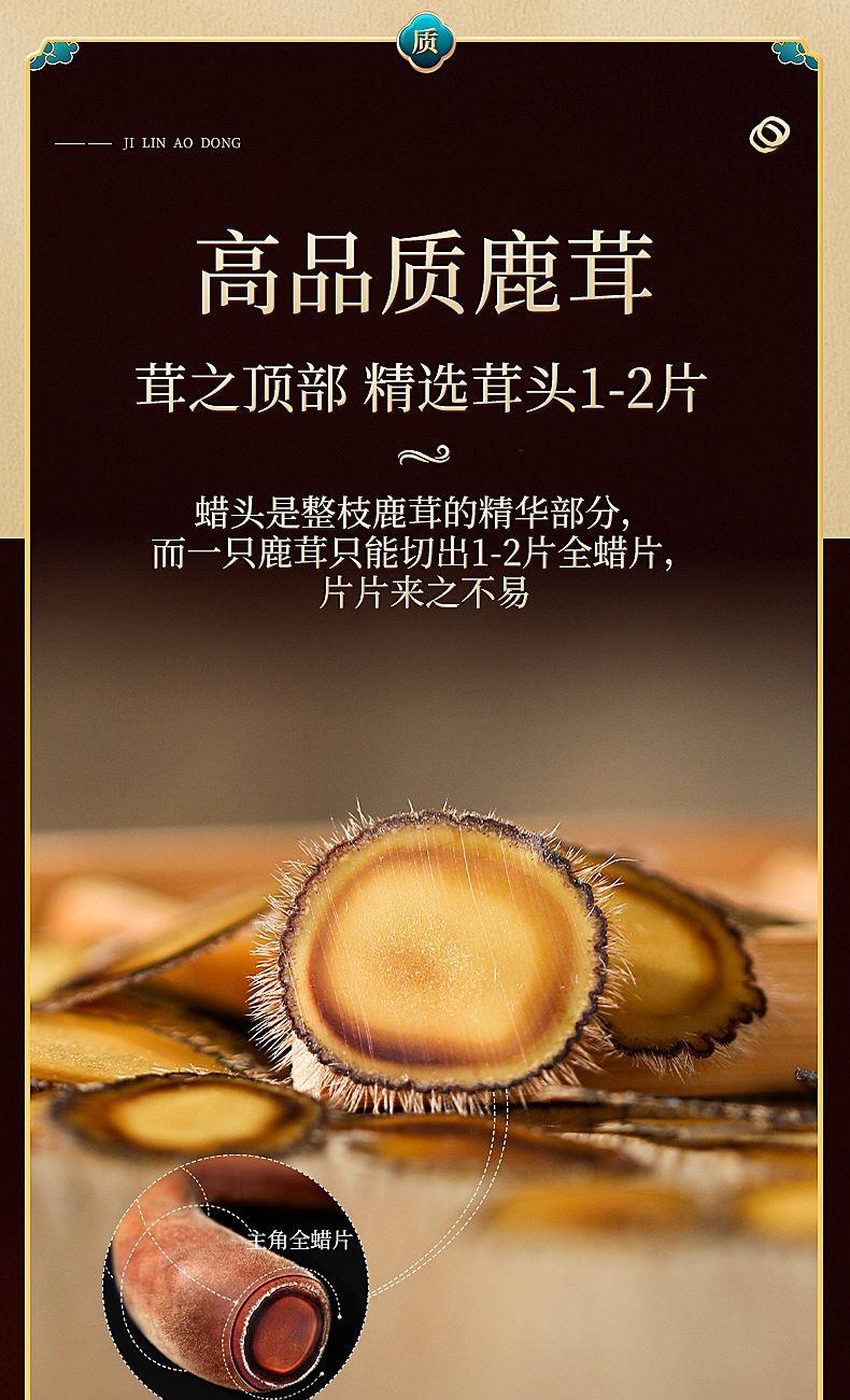 净含量: 15克左右 纯正梅花鹿蜡片 选取成年壮鹿主角, 选取顶部全蜡小片,数量稀缺,片片来之不易。 每天用量少于2克 泡水 泡酒 煲汤