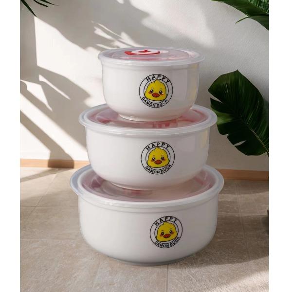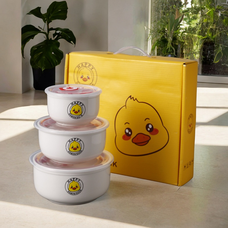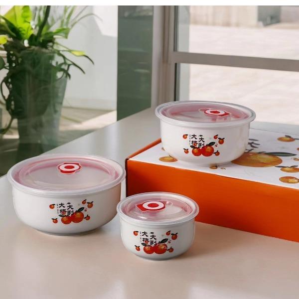 产品组成: 整套=3个不同尺寸的保鲜碗+密封盖 产品规格: 小号保鲜碗:直径10.5CM*高6CM,300ML,189g 中号保鲜碗:直径13.5CM*高6.2CM,600ML,333g 大号保鲜碗:直径16CM*高7.8CM,900ML,480g 彩盒尺寸:28*7.3*24.2cm 产品特点: 保鲜专家/锁住新鲜--拥有多重功能保鲜碗便当盒泡面碗。 负压科技,全包围密封圈和透气阀,携带汤汁。 多种图案可选,可爱卡通系列保障你的安心食光。 可叠加放置节省冰箱储物空间能承受低温,放进冰箱冷藏也安心。