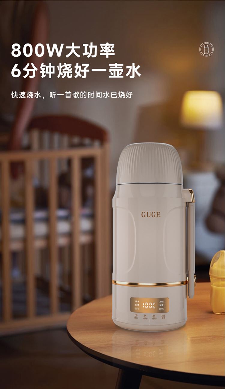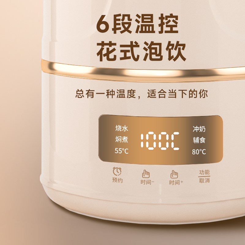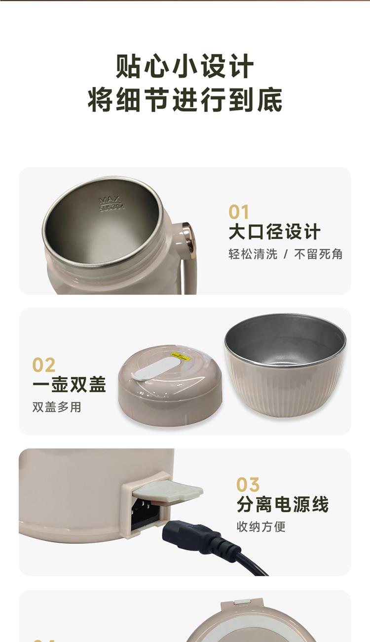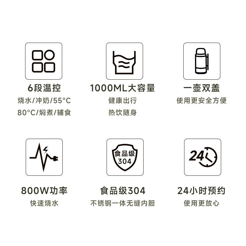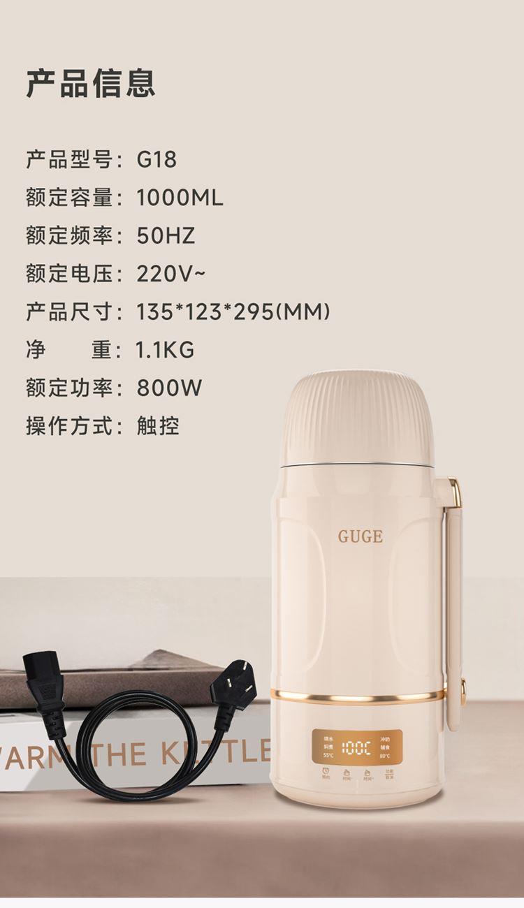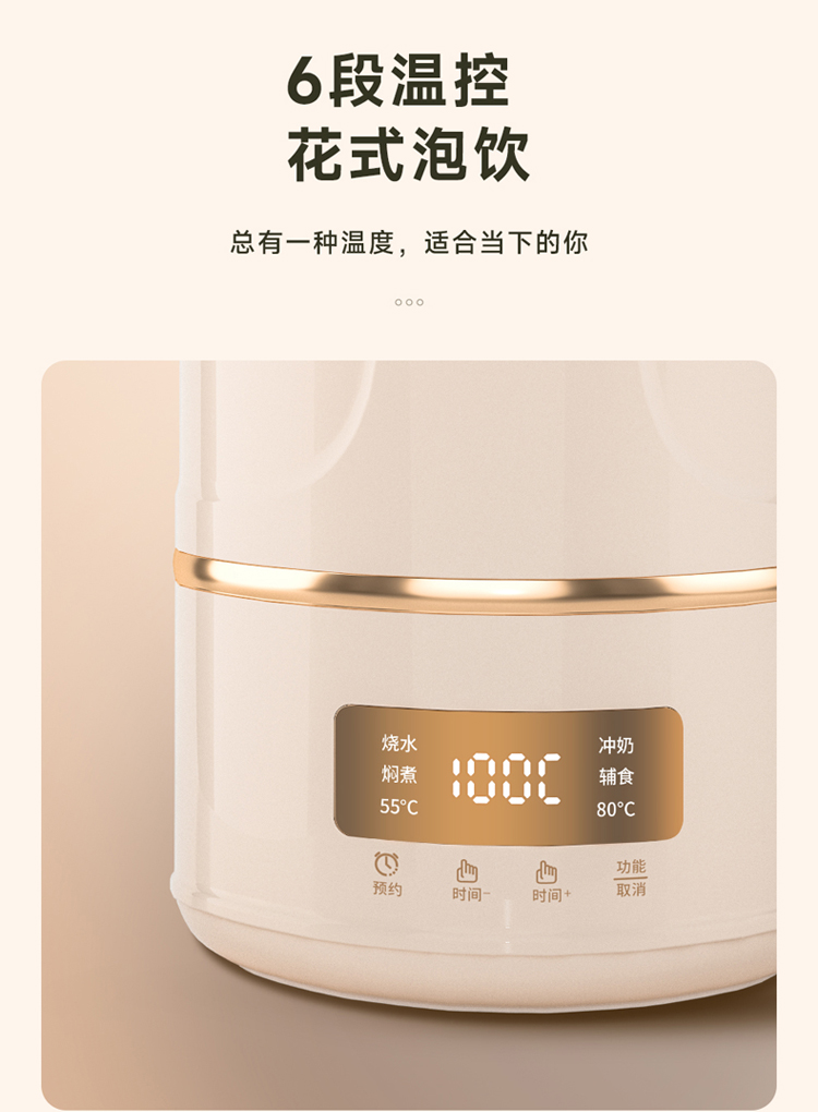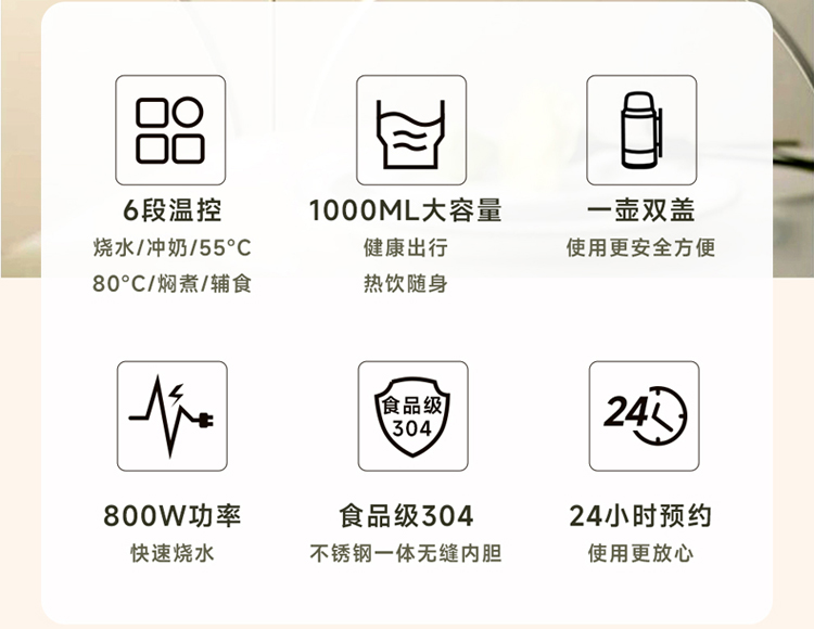额定功率:800W 额定频率:50HZ 额定电压:220V 额定容量:1L 产品净重:1.1kg 包装方式:手提彩盒+邮箱 产品尺寸:135*123*295 邮包尺寸:170*170*345 产品净重:1.1kg 产品毛重:1.3kg ● 烧水、保温、焖煮三合一,一壶双盖随心切换 ● 食品级304不锈钢,特定4-5小时长效保温,插电60度恒温水24小时保温。 ● 一键触控,六档调温,多段烧水模式。 ● 800W大功率,约6min烧好一壶好水,养生炖煮,时刻轻养生。 ● 45度 恒温冲奶,无需反fu试水温。 ● 无缝一体内胆,不藏污渍清洗方便,加宽提手,一拎即走