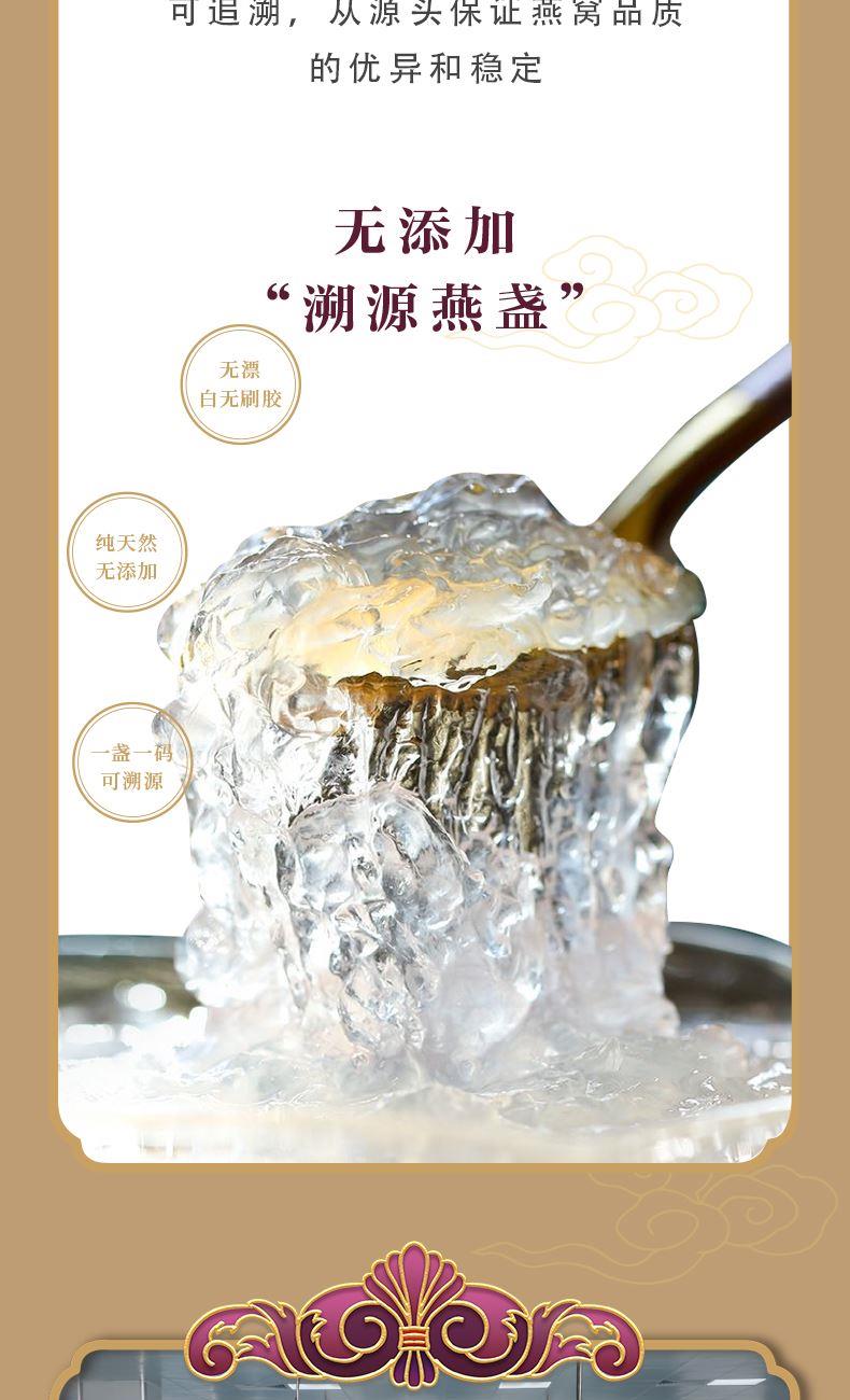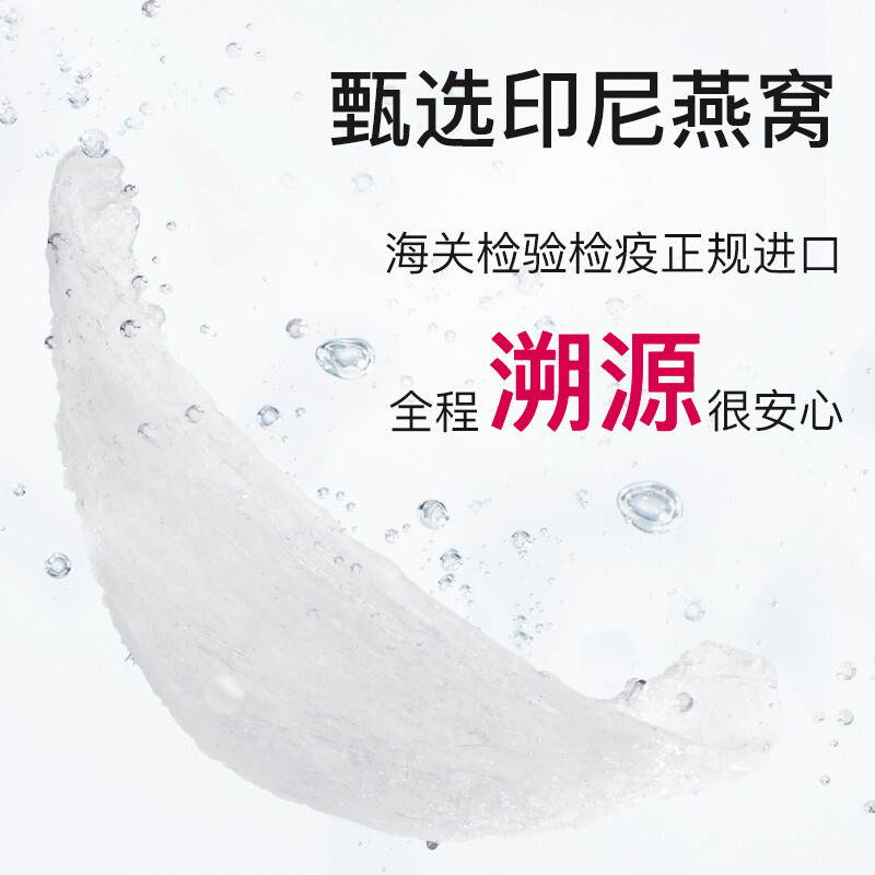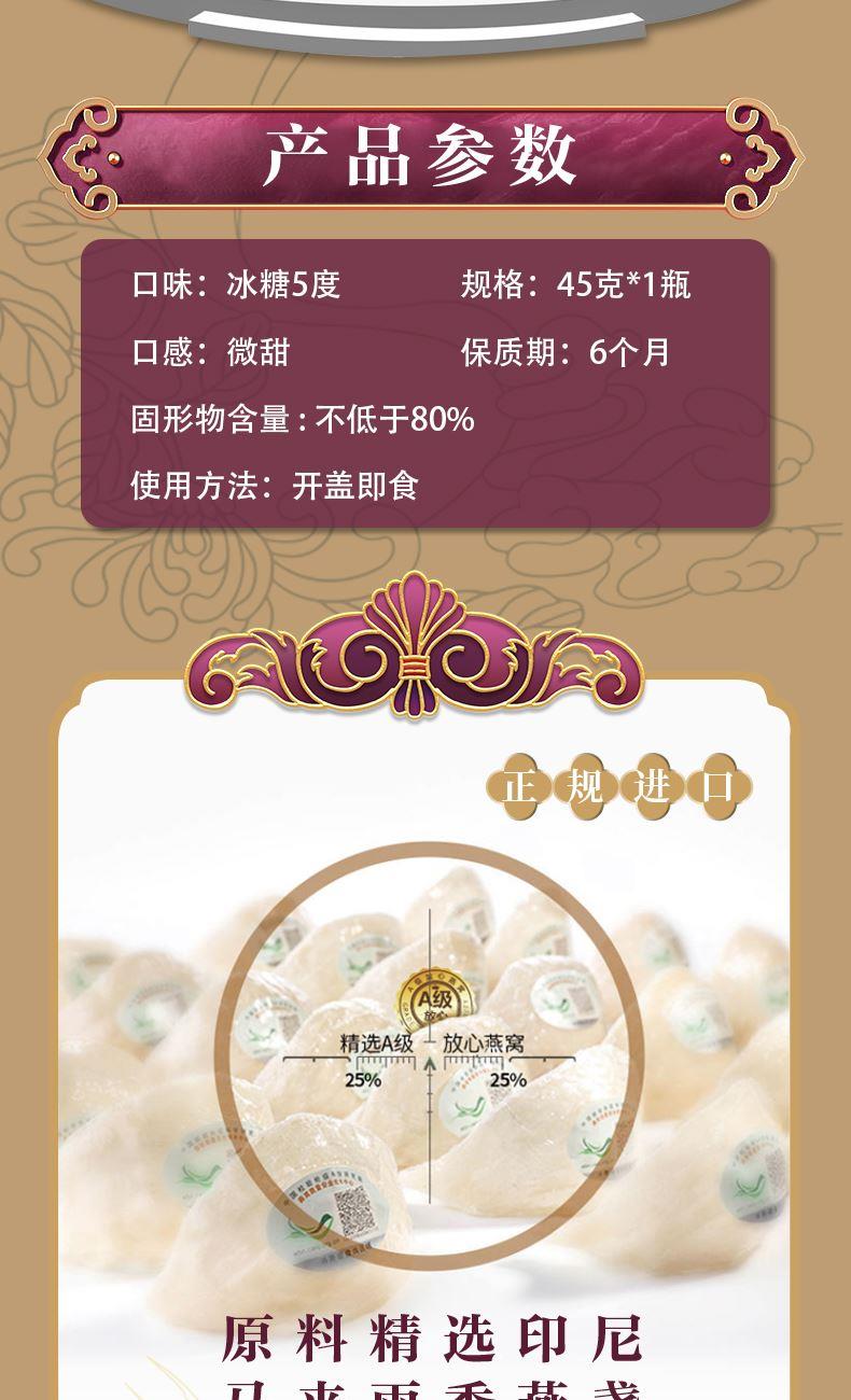 规格:45克*1瓶、固形物≥80% 卖点:原料均选自印尼、马来西亚等热带雨林核心产区,每瓶产品配备溯源码,消费者可查询原料产地、生产批次及质检报告,实现 “燕屋到舌尖” 的透明信任链。