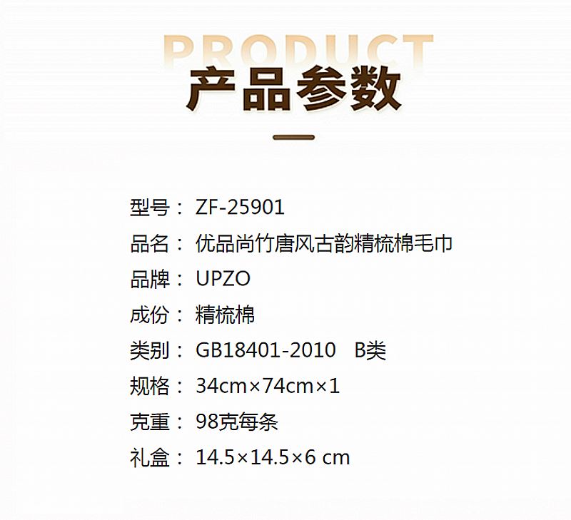型号: ZF-25901 成份: 精梳棉 类别: GB18401-2010 B类 规格: 34cm×74cm×1 克重: 98克每条 礼盒: 14.5×14.5×6 cm 精梳棉材质 国风刺绣搭配祝福礼品 文创好礼