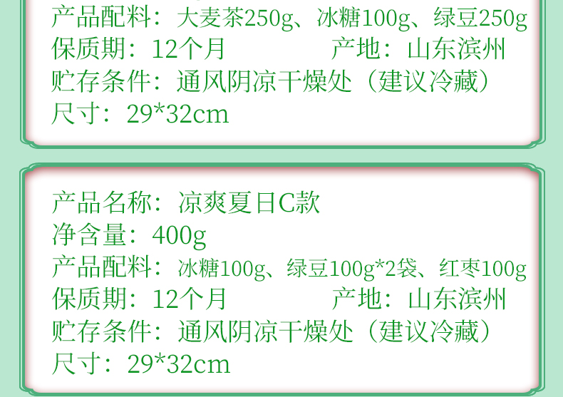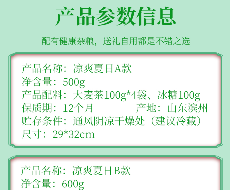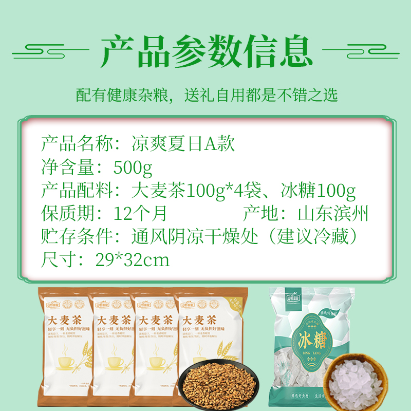 凉爽夏日A款 净含量:500g 产品规格配置:大麦茶100g*4、冰糖100g 袋尺寸:29*32cm 箱尺寸:43*40*30.5 箱重量:15.8kg 箱体积:0.052方