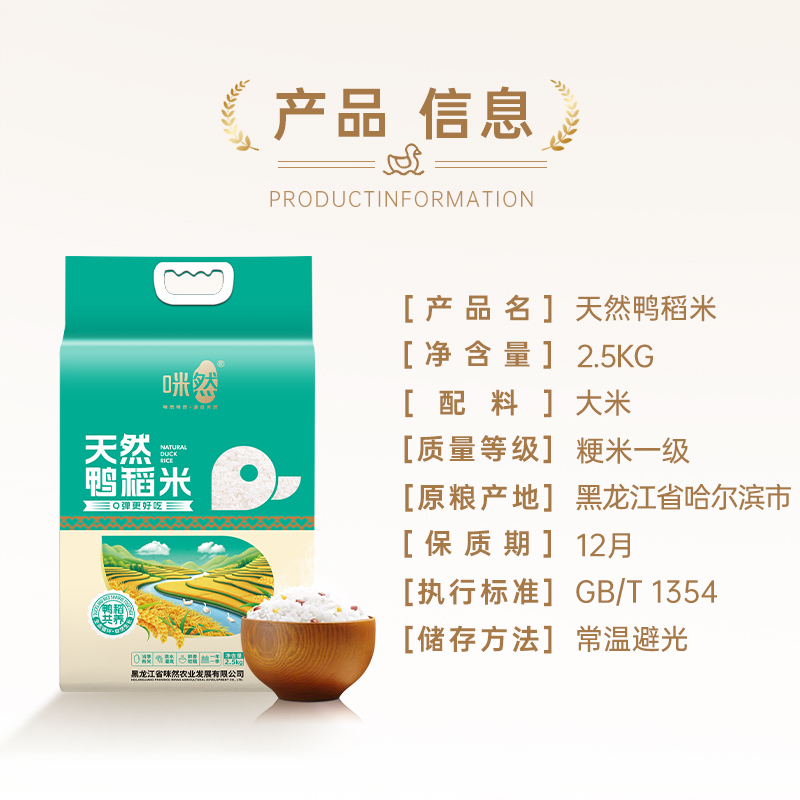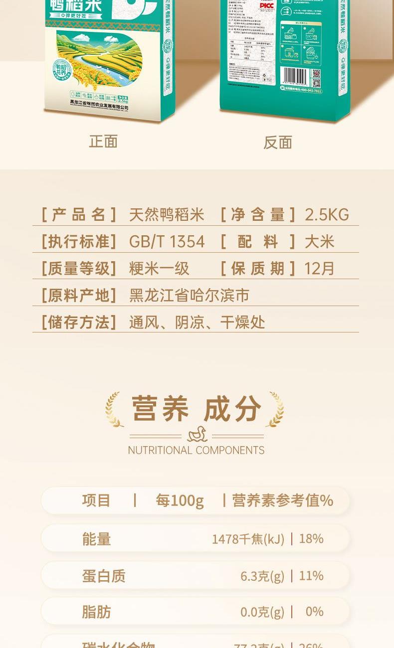 产 品 :天然鸭稻米2.5kg 执行标准 :GB/T 1354 保 质 期 :12个月 产 地 :辽宁锦州 箱 规 :10*2.5kg