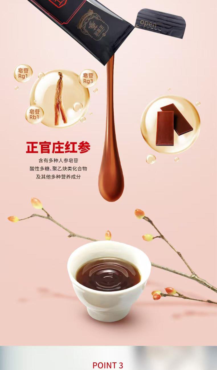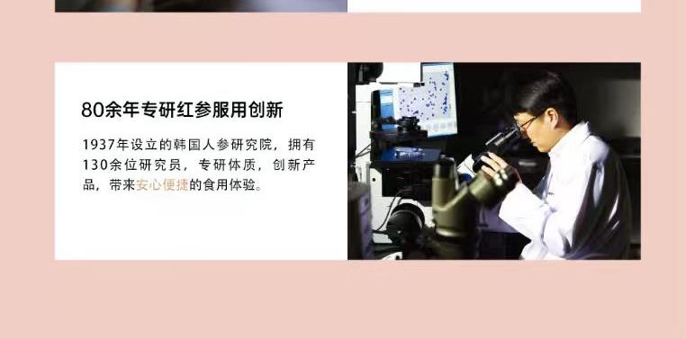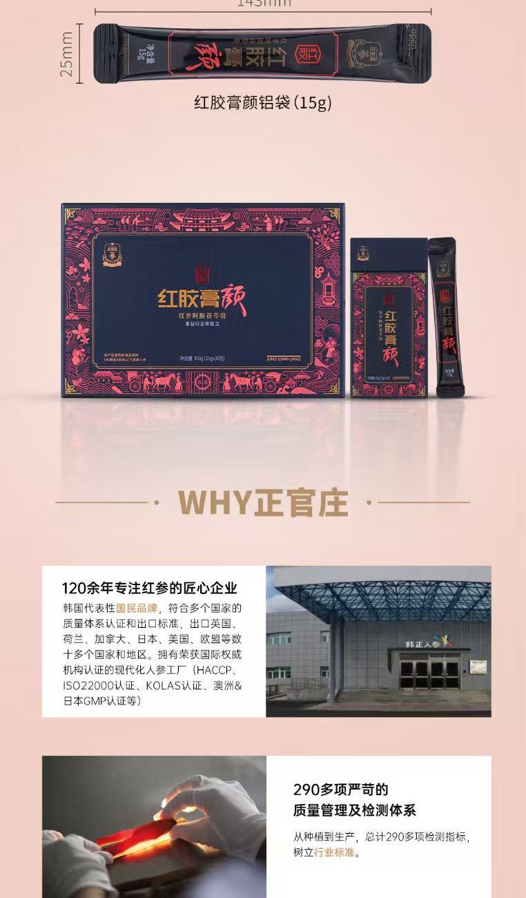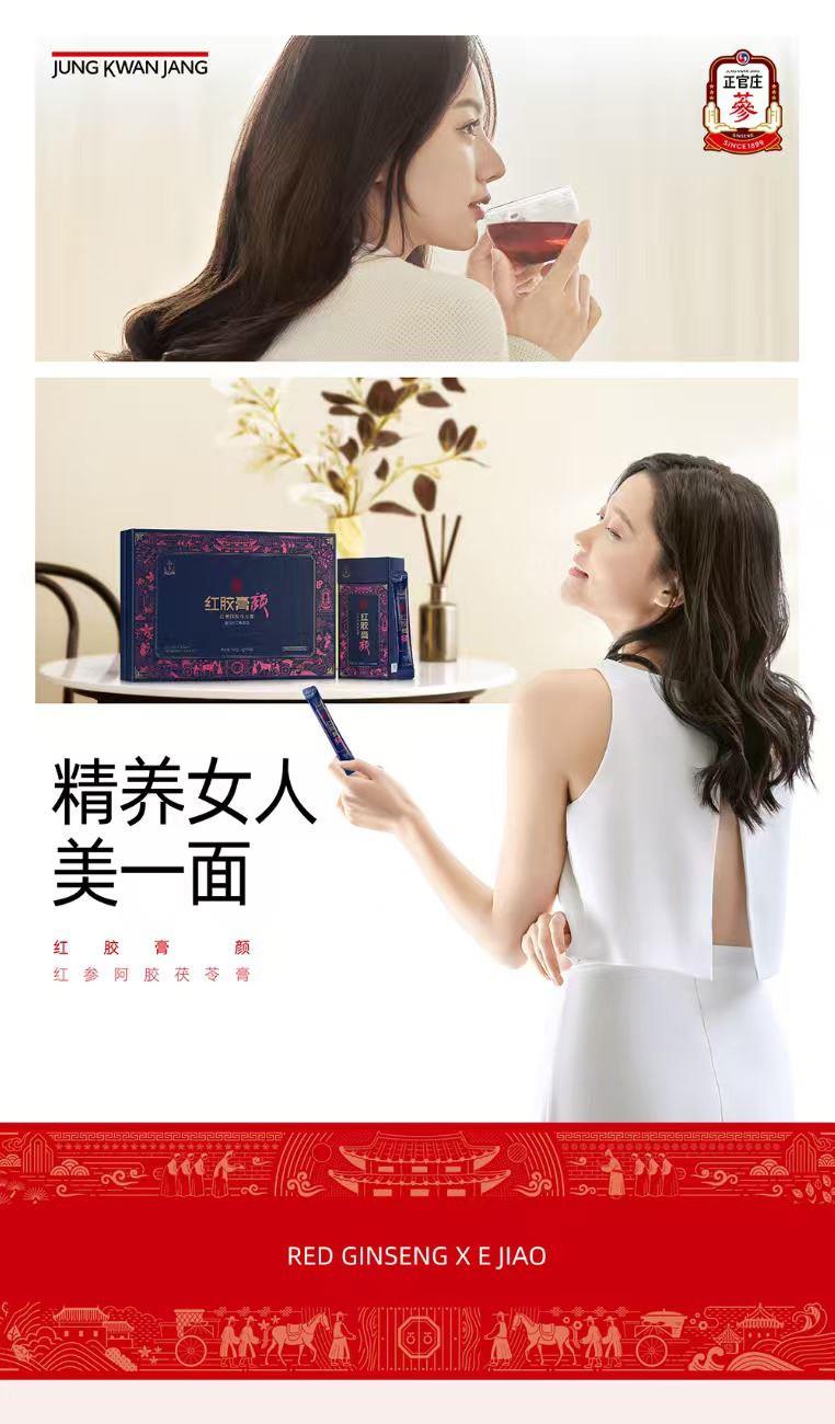 【规格】:450g/盒(15g*30包) 【保质期】:24个月 【产品尺寸】:300*57*205mm 【整箱尺寸】:430*320*350mm 【食用方法】:每日1次,每次1包。 正官庄红参与东阿阿胶的调和,以红参与阿胶建立身 体平衡。添加对女性有益的砂仁、甘草、茯苓,使气色 更加红润。
