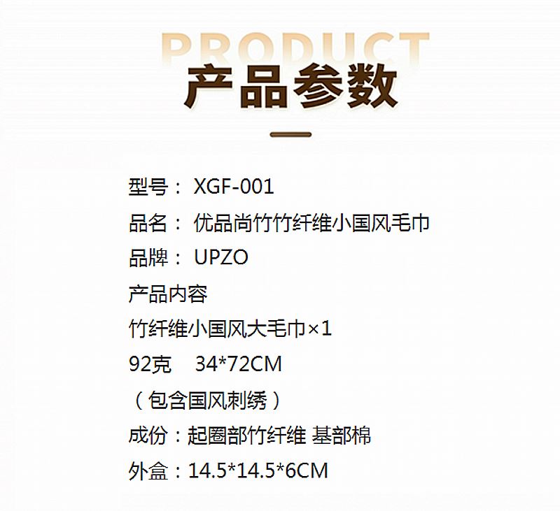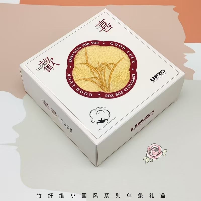 型号: XGF-001 产品内容 竹纤维小国风大毛巾×1 92克 34*72CM (包含国风刺绣) 成份:起圈部竹纤维 基部棉 外盒:14.5*14.5*6CM 精选竹纤维材质 搭配国风刺绣与祝福礼盒 创意好礼