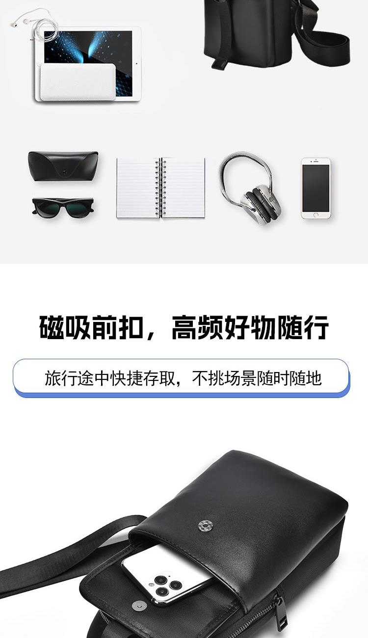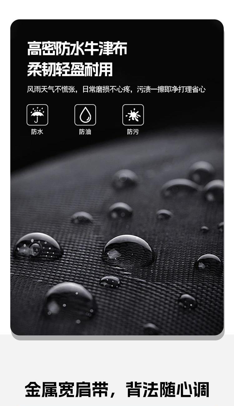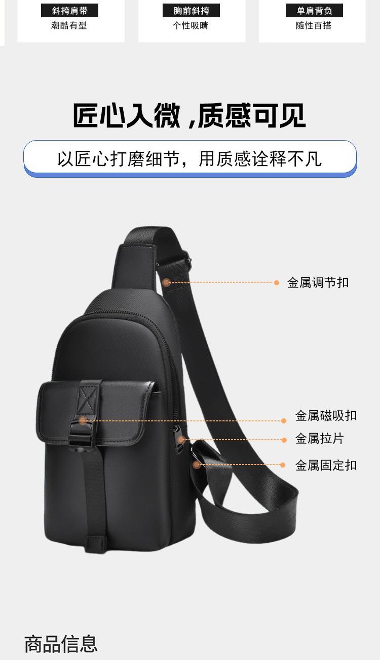 1、小而有范轻潮有型,零感贴身百搭出行 2、合理空间科学布局,解放双手一包搞定 3、高密牛津防水材质,柔韧轻盈防刮耐磨 4、多仓分区收纳有序,随取随放存取便捷 5、人体工学肩带设计,多种背法自由选择 6、金属配件匠心工艺,入微细节品质在线