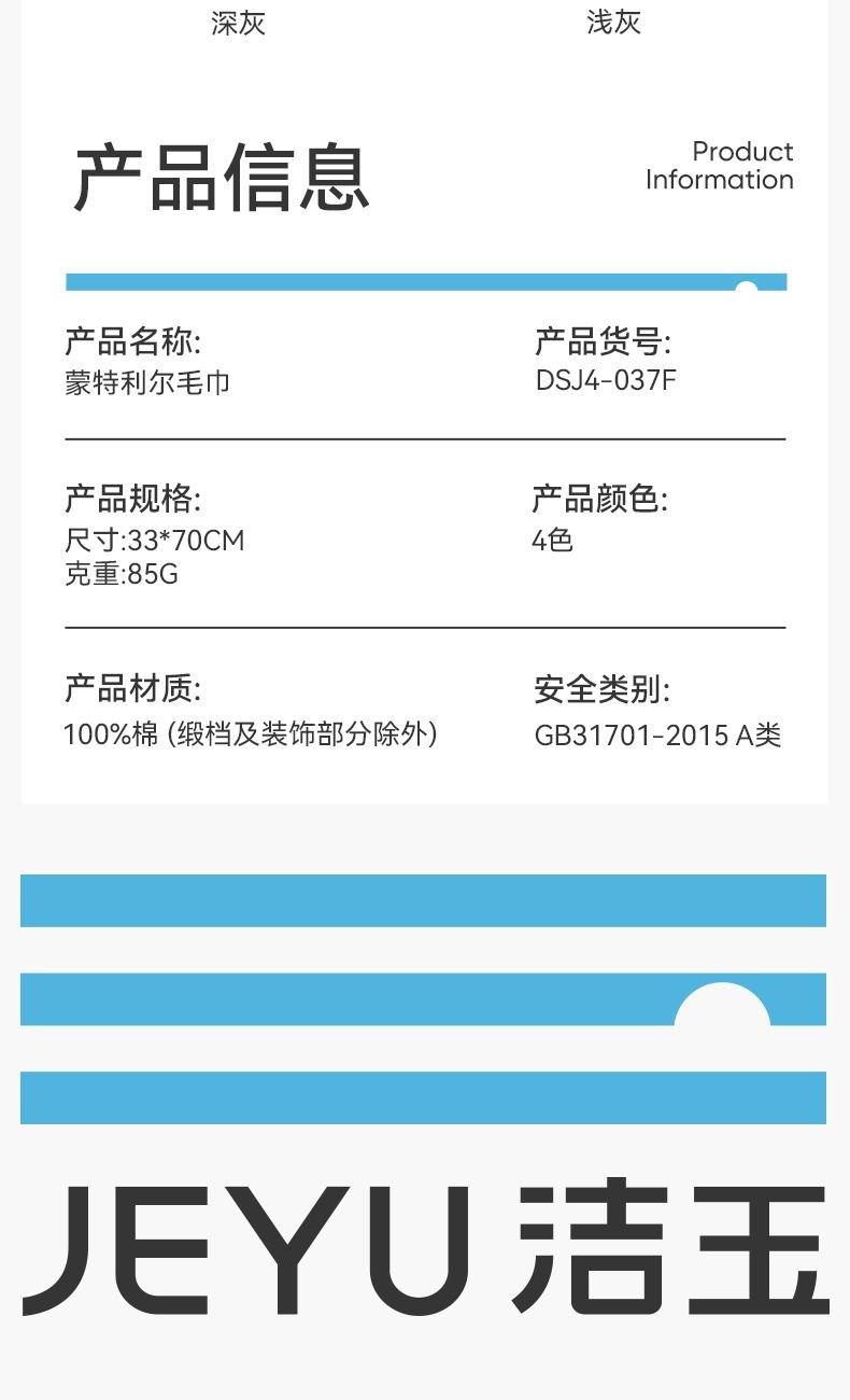 规格:33cm*70cm*3条 重量:85g/条*3条 颜色:蓝、深灰、浅灰、粉 材质:12.5S弱捻+20S 包装内容:蒙特利尔毛巾 3条