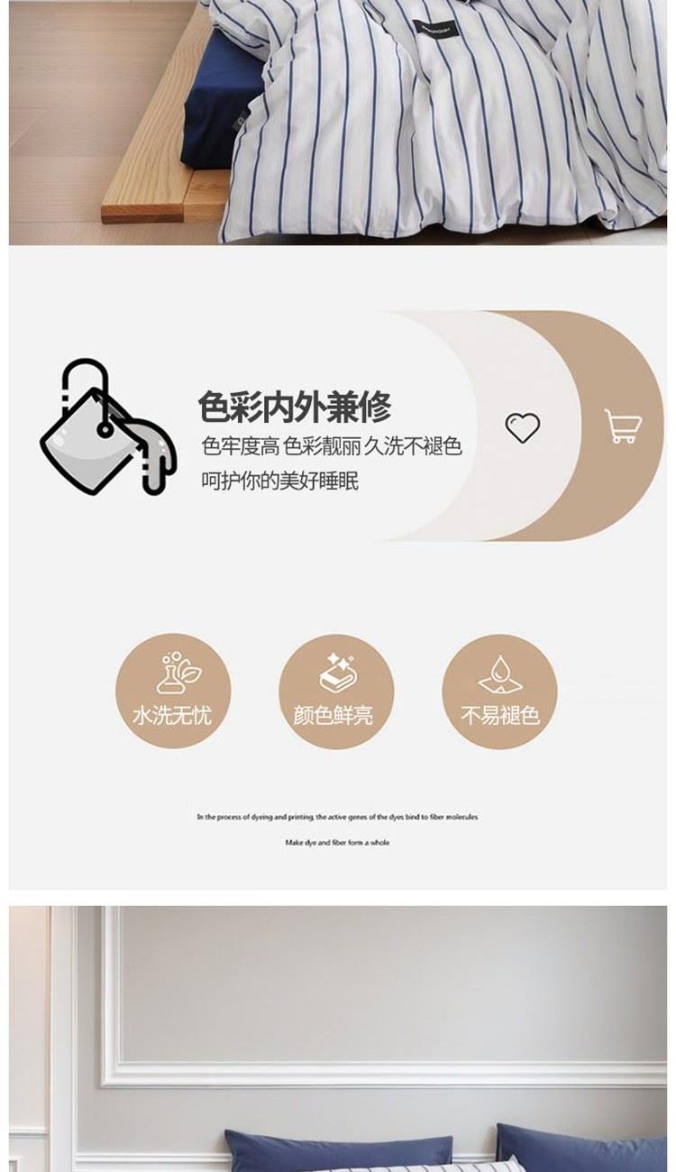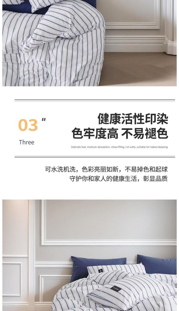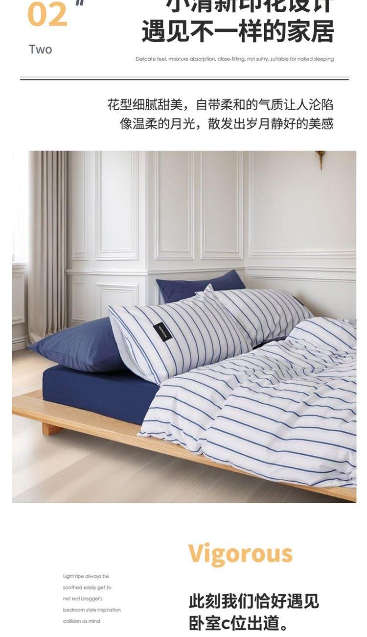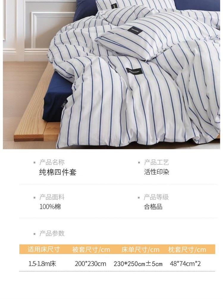 规格: 床单:230*250cm 被罩:200*230cm 枕套:48*74cmx2 面料:棉 1.全棉面料,贴身的更要精挑细选 2.活性印染工艺,健康环保,无甲醛,无致癌物 3.色调清新有层次,吸湿亲肤舒适,轻薄透气,缩水率低