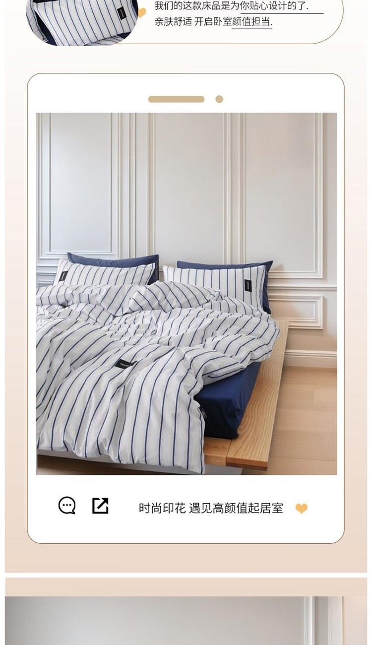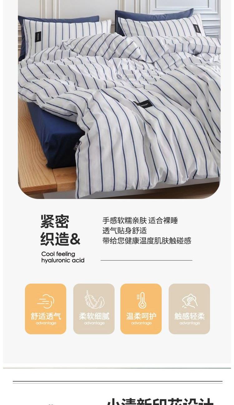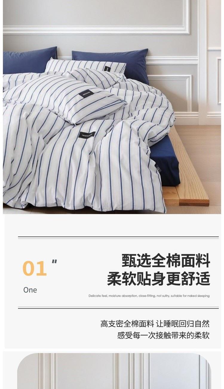 规格: 床单:230*250cm 被罩:200*230cm 枕套:48*74cmx2 面料:棉 1.全棉面料,贴身的更要精挑细选 2.活性印染工艺,健康环保,无甲醛,无致癌物 3.色调清新有层次,吸湿亲肤舒适,轻薄透气,缩水率低