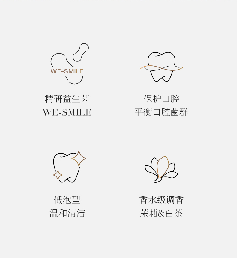 容量:100g 型号:YG-WM100-1 1.成分:水合硅石、柠檬酸锌、益生菌 2.适用人群:所有口腔护理人群,尤其是有牙菌斑问题困扰的群体。 3.唯茉之白多维护理牙膏,预防牙齿斑驳,牙龈不适,牙齿松动,口腔难闻等,科学护齿。 4.精研益生菌,平衡口腔菌群,低泡型,温和清洁牙齿,香水级调香(茉莉&白茶)。