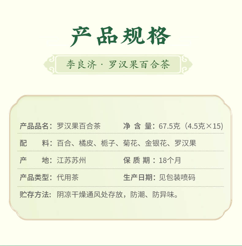 产品:罗汉果百合茶 规格:净含量67.5克(4.5g*15包) 保质量:18个月 贮藏方法:阴凉干燥通风处存放,防潮,防异味 配料表:罗汉果,百合,菊花等 办公室饮品,商务接待,白领自饮 精致包装,送礼佳选