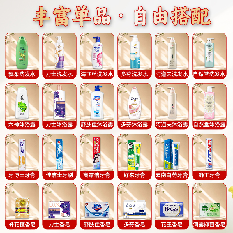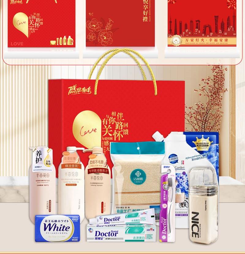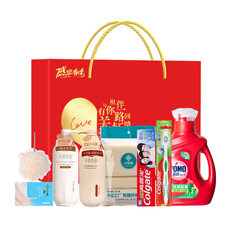 礼盒尺寸:32*8.5*24.5cm 包装尺寸:66*46.5*51CM 产品配置:(香型随机) 半亩花田洗发水500ml 半亩花田沐浴露500ml 奥妙洗衣液950g 高露洁牙膏90g 高露洁牙刷三重深洁 洁丽雅毛巾69*33cm 沐浴球 隆力奇香皂95g
