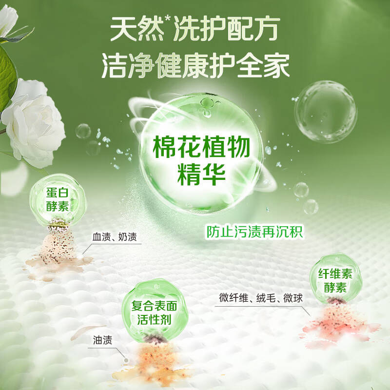 保质期限:3年 产品成分:复合表面活性剂、去渍助剂、绿色速洁粒子、生物酶制剂(蛋白酵素、纤维素酵素)、山茶花精华、青竹精华、椰子油精华、棕榈油精华、棉花植物精华、香精 产品功效:去顽渍防发黄 护衣护色山茶花与青竹自然香 深层洁净