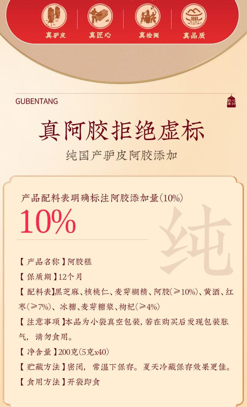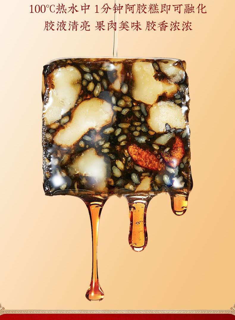固本堂红枣枸杞阿胶糕礼盒200g*2(两盒400克) 【配 料 表 】黑芝麻、核桃仁、麦芽糊精、阿胶(>10%)、黄酒、红枣(>7%)、单晶体冰糖、麦芽糖浆、枸杞(>4%)【保质 期】12个月 【净含量】400克(200gX2盒) 【贮藏方法】密闭,常温下保存。夏天冰箱内保存更佳。【注意事项】本品为小袋真空包装,若在购买后发现包装胀气,请勿食用。 【食用方法】开袋即食