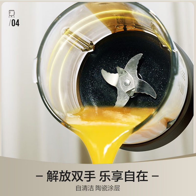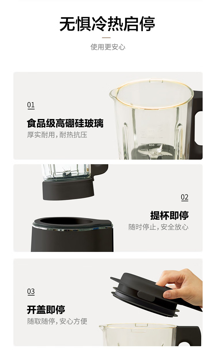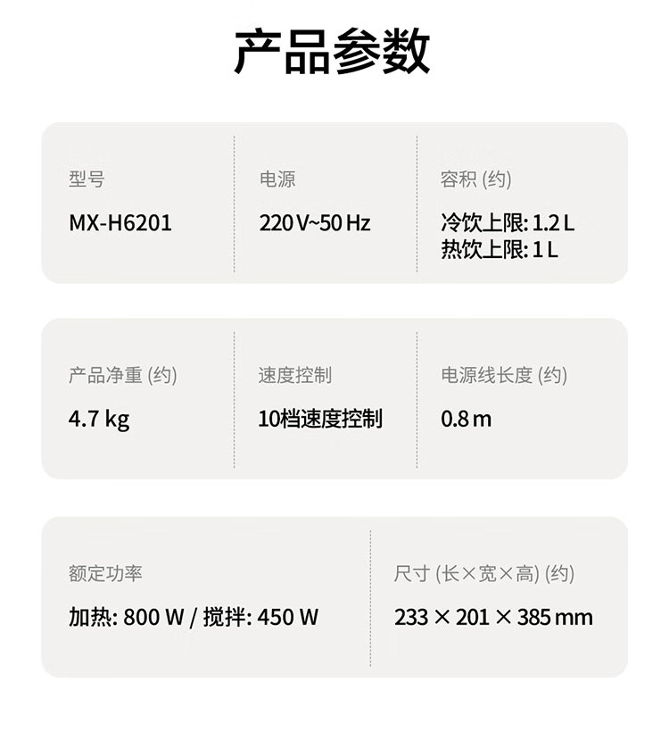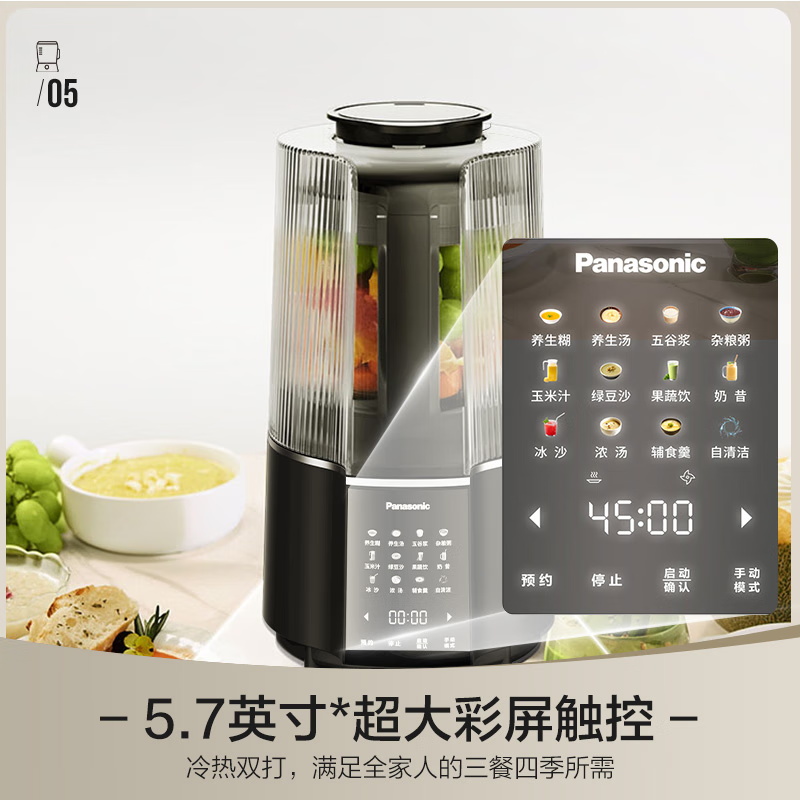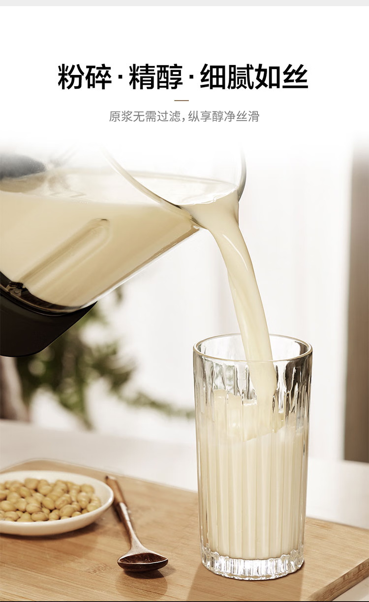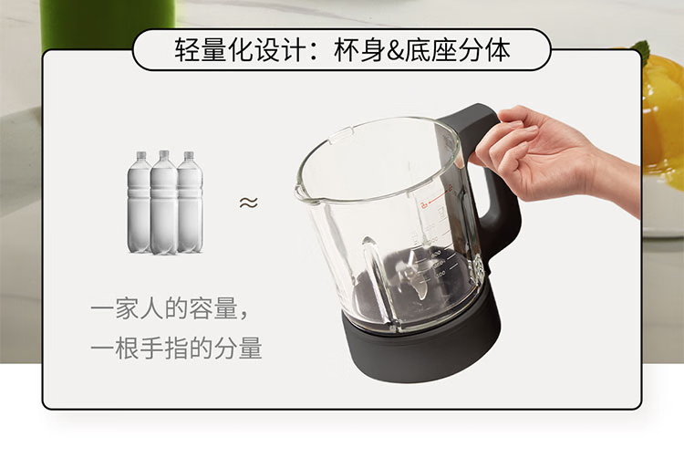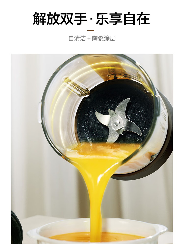 颜色:黑色 尺寸:长233 x 宽201 x 高385mm 容积:冷饮上限:1.2L 热饮上限:1L 功率:加热:800W 搅拌:450W 净重:4.7kg 五重柔音降噪技术,从声音源头处减少震动降低噪音,由内而外层层守护愉悦体验 陶瓷涂层技术,遇热不易糊底,食渣不易粘黏,洗后不易残留水渍,不易刮花/刮伤 高温加热式深度自清 5.7英寸超大彩屏 玩味11种自动菜单 12H智能预约,10档速度控制 分体式轻量化设计 美味单手 轻松拿捏
