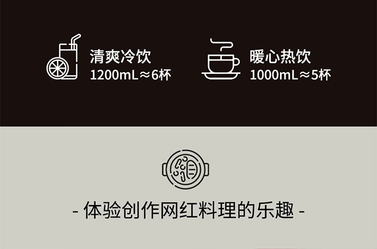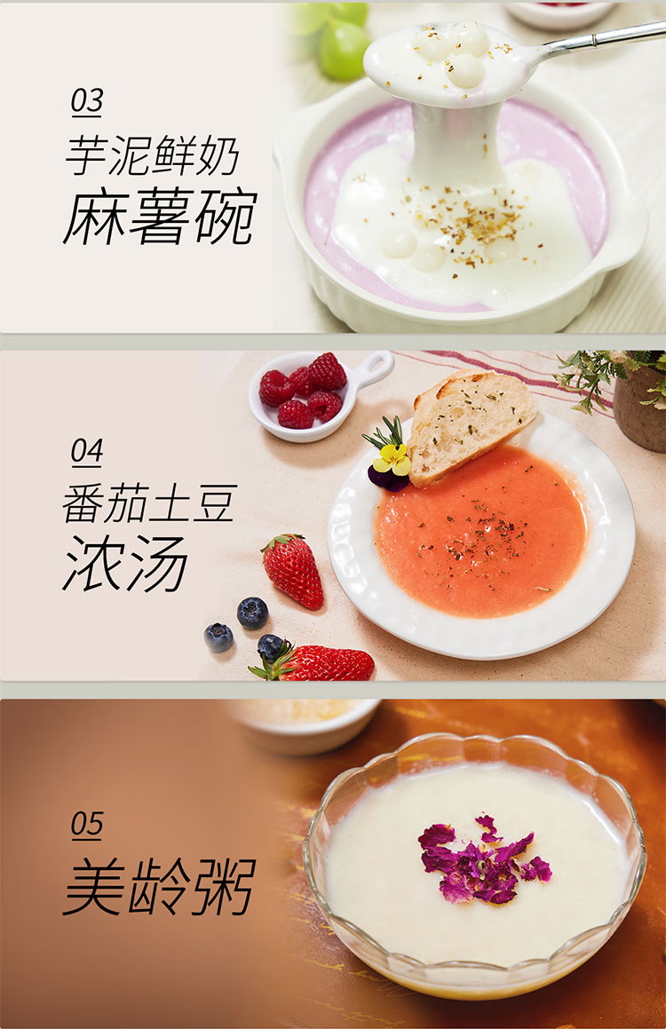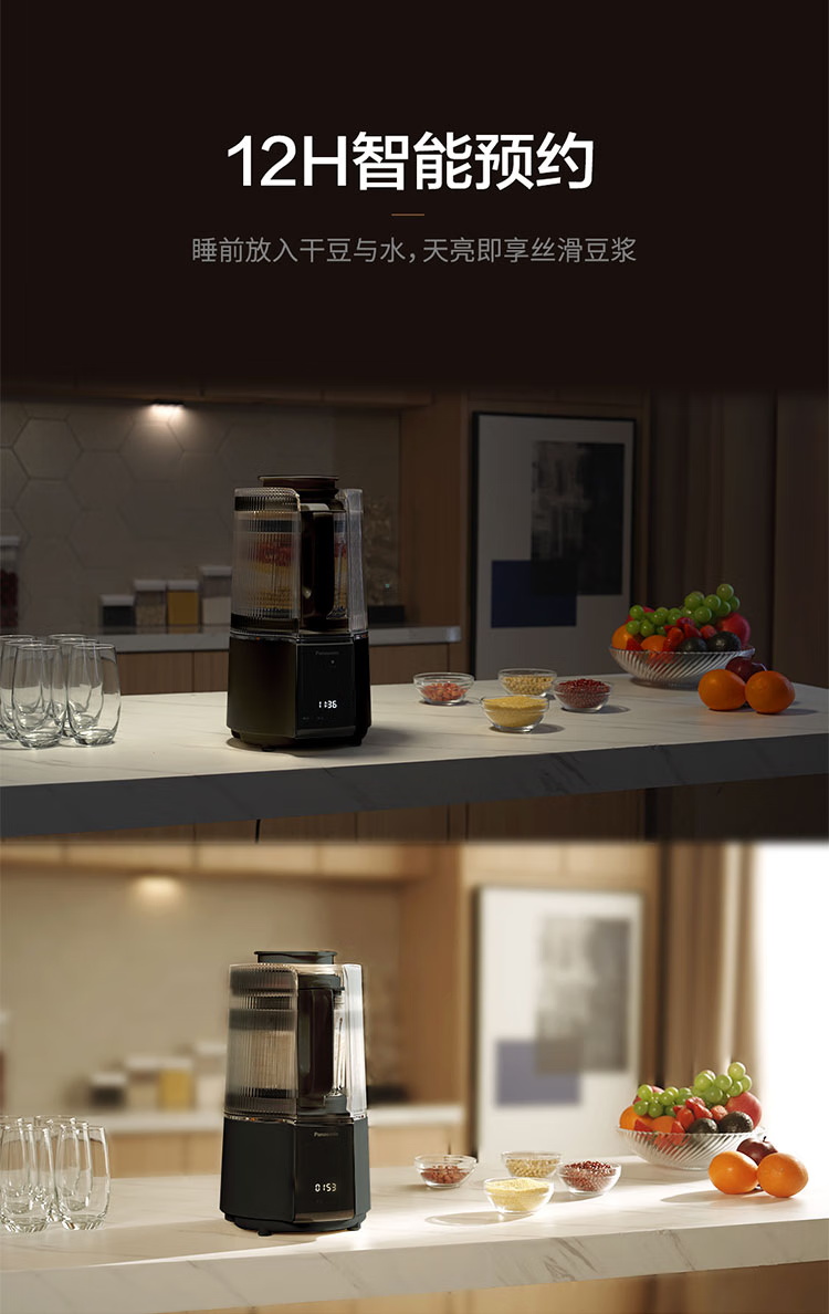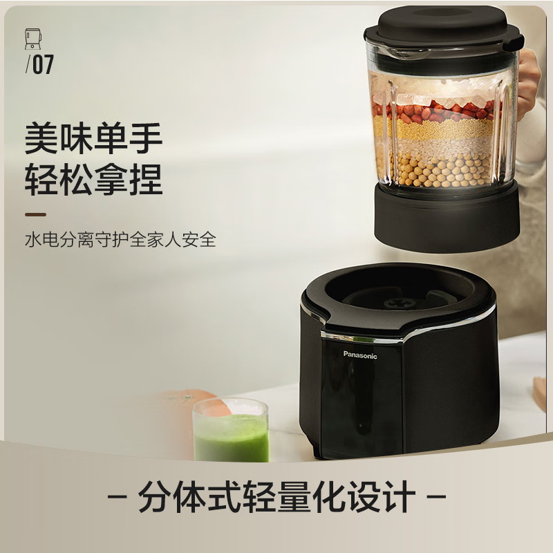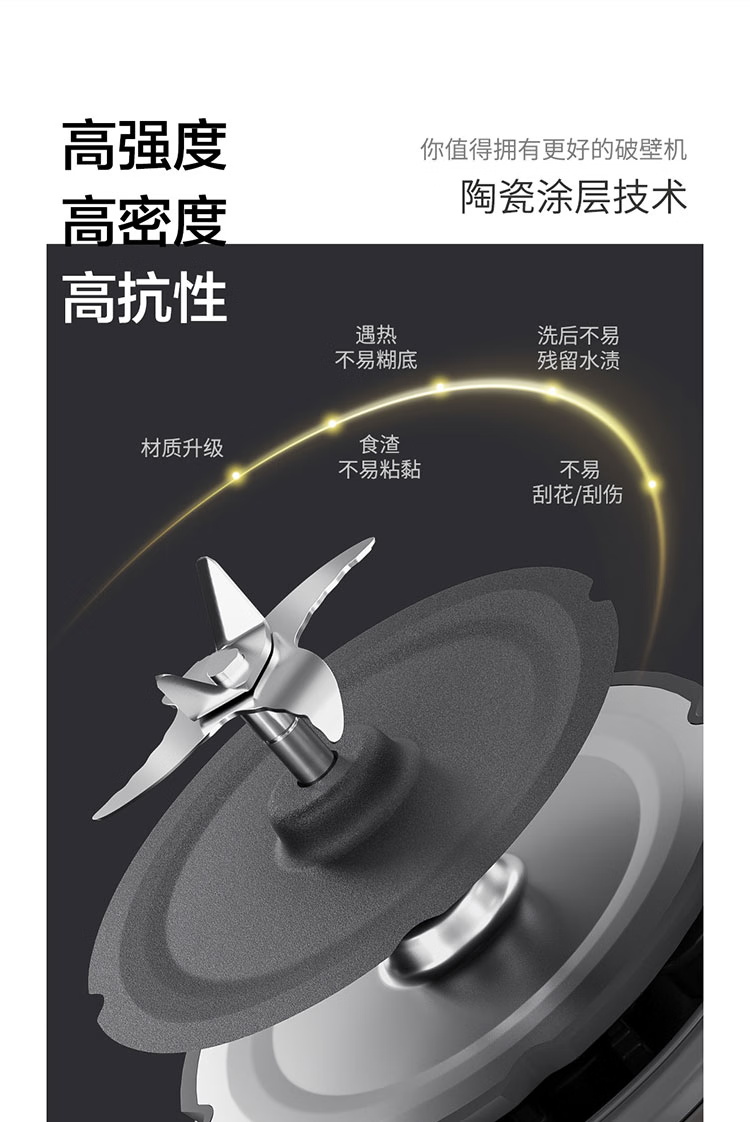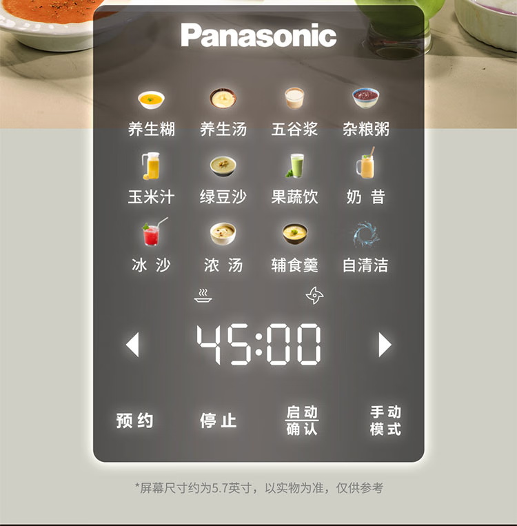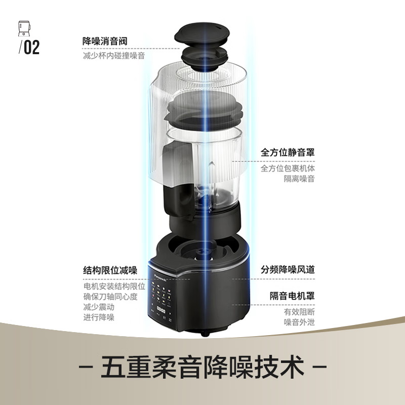 颜色:黑色 尺寸:长233 x 宽201 x 高385mm 容积:冷饮上限:1.2L 热饮上限:1L 功率:加热:800W 搅拌:450W 净重:4.7kg 五重柔音降噪技术,从声音源头处减少震动降低噪音,由内而外层层守护愉悦体验 陶瓷涂层技术,遇热不易糊底,食渣不易粘黏,洗后不易残留水渍,不易刮花/刮伤 高温加热式深度自清 5.7英寸超大彩屏 玩味11种自动菜单 12H智能预约,10档速度控制 分体式轻量化设计 美味单手 轻松拿捏