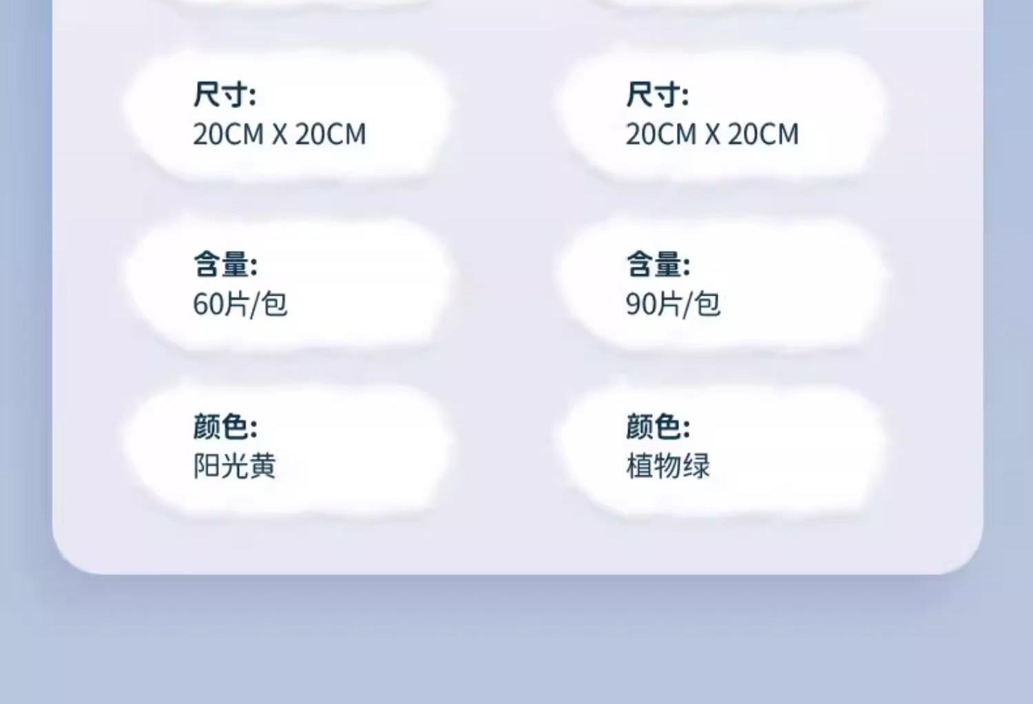 型 号:MRJ641(黄色) 组 合:三包装 材 质:棉 规 格:20X20cm 60片*3 克 重:65g/m 颜 色:如图所示