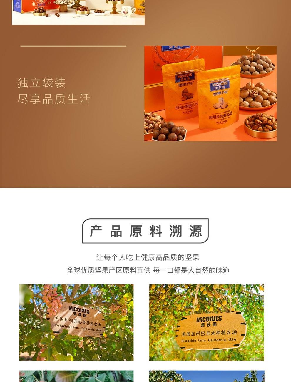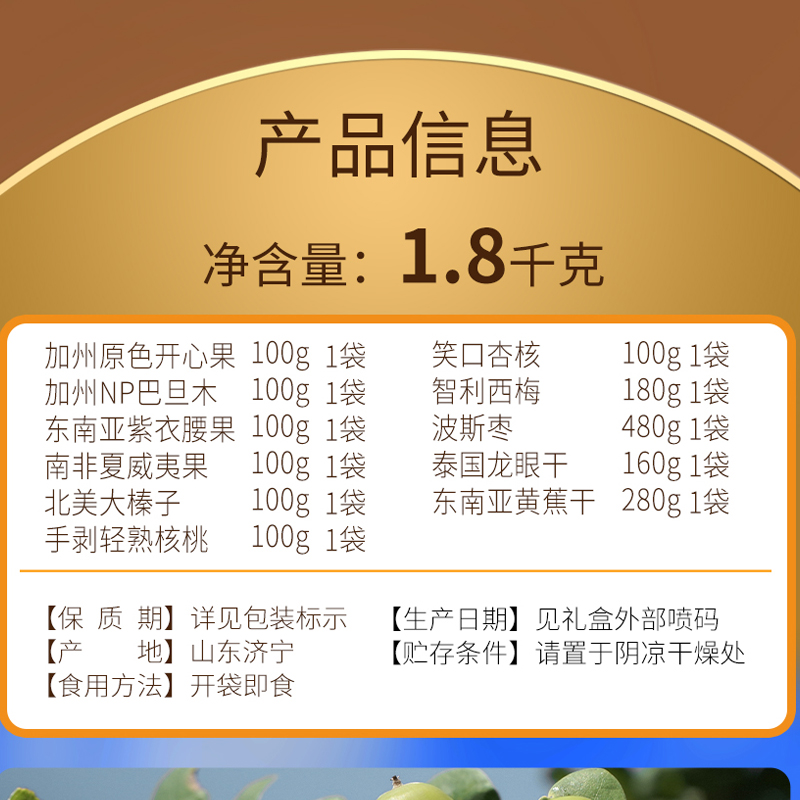 加州原色开心果 100g*1 加州NP巴旦木 100g*1 东南亚紫衣腰果 100g*1 南非夏威夷果 100g*1 北美大榛子 100g*1 手剥轻熟核桃 100g*1 笑口杏核 100g*1 智利西梅 180g*1 波斯枣 480g*1 泰国龙眼干 160g*1 东南亚黄蕉干 280g*1 合计:1800g